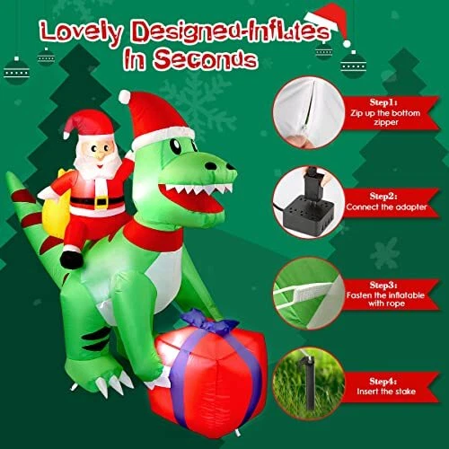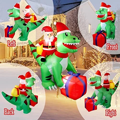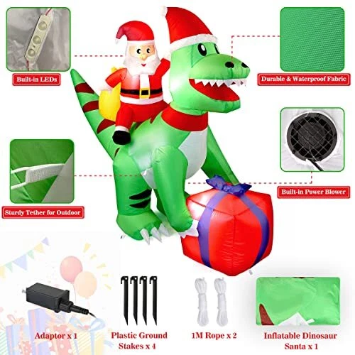 30 Days Return Policy Fast Delivery Trusted seller 5FT Christmas Inflatables Decorations Dinosaur Santa Claus, Indoor Outdoor Christmas Deco, Blow Up Dinosaur Santa Decoration with Built-in LED Lights Gift Bag for Christmas Party,Garden,Yard, Lawn Product Description 5FT INFLATABLE Christmas Decorations: Christmas dinosaur inflatable decorations designed a Santa Clause riding the dinosaur bring more funny, carrying a gift bag gift box to your home, bring luck, lots of happiness, and good health. Merry Christmas and Happy New Year to you and your family! Build-in LED Lights: This Inflatables Christmas outdoor decorations come with bright led lights , light up your lawn or garden in the evening, bring a best festive mood, attract and spreading a happiness atmosp to your neighbors and guests. STABLE & DURABLE: Our Christmas blow-up yard decorations are made of waterproof polyester, ensuring durability and reusability. The dinosaur base allows for stable indoor use without sandbags or stakes. Includes 4 ground stakes and 2 ropes for secure outdoor setup. Super Easy To Inflate and Store: This Christmas inflatable deco built-in powerful blower, close the bottom zipper and plug in UL plug and a glowing gift-giving dinosaur appears in a few seconds! Opening the bottom zipper to deflate it, then you can store it for the next use. BEST CHRISTMAS GIFT: Inflatable Christmas Dinosaur Santa is ideal for kids and dinosaur fans. Great for indoor, outdoor, yard, patio, and garden decor. Creates a festive atmosp for the holidays. Includes a 12-month warranty; contact us with any issues. Shipping Returns Payment Shipping Shipping is FREE to all addresses other than APO/PO boxes in the lower 48 states. All our stock ships from US-based warehouses. Shipped via USPS or UPS (depending on location and package weight) Unless stated otherwise, all orders will ship within 24-72 hours of your payment being processed. Check our feedback to see the great reviews of FAST shipping we offer. Returns As our valued customer, we will do our best to make sure the product you receive arrives to you on time and as expected. If you are not satisfied with your purchase, please contact us within 30 days of receiving your order to process a return. Payment We currently accept payment via eBay managed payments only. Once payment is cleared, we will dispatch your shipment within 1-3 business days. Please refer to the "Shipping" tab for more information regarding shipping speed to your destination.