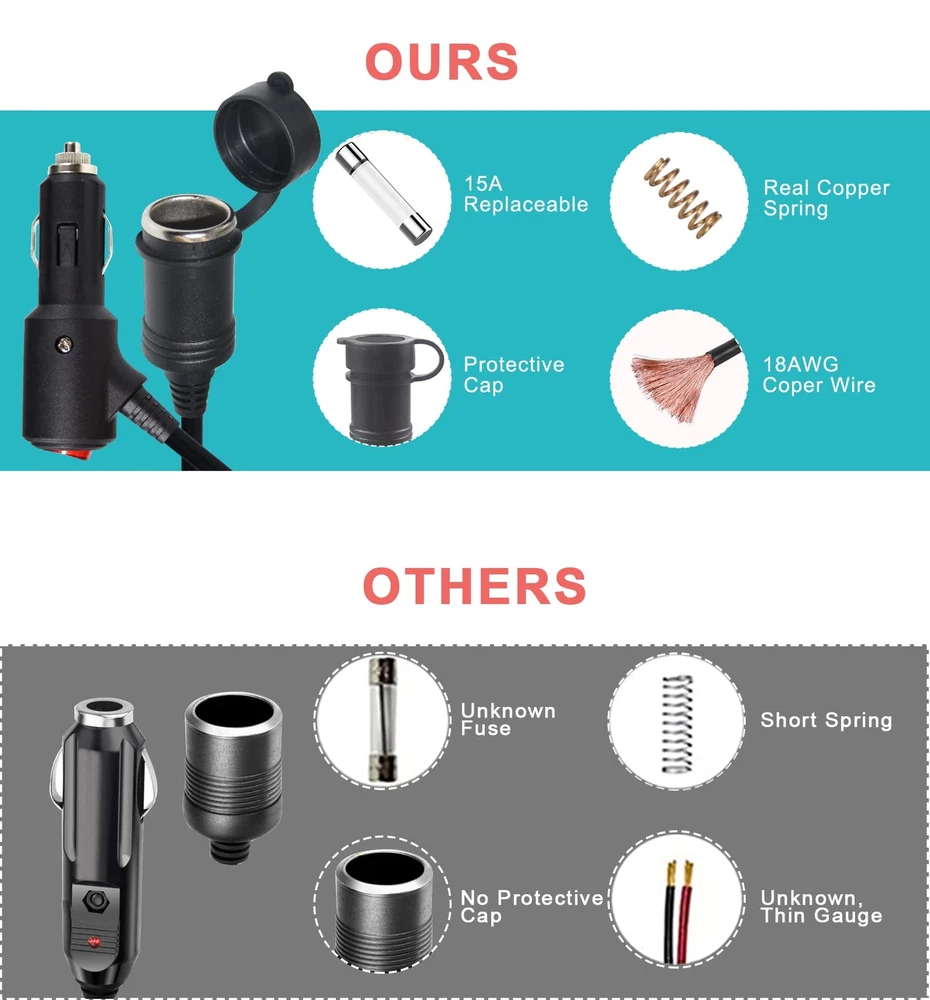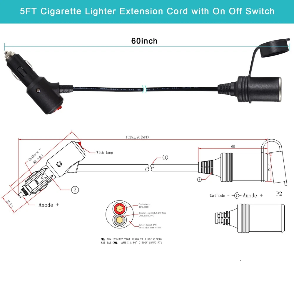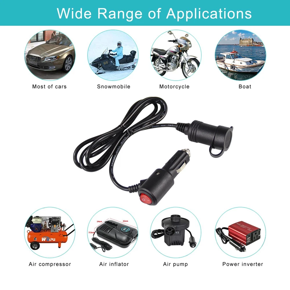 12V Car Cigarette Lighter Extension Cord with On Off Switch ; Cable Spec: 18AWG/2C, Length: 5FT( 60 IN) Max Current: 15A; Suitable for voltage: DC 12V to 24V; Built-in 15A fuse for safety. 【With ON & OFF Switch】The on/off switch is designed for quick connection and disconnection, which is more convenient to use. Compared with the cable without switch, it is safer and reduces the wear of the interface during the plugging and unplugging process of the cigarette lighter. 【Power Indicator Light】Our switch is a switch with light. When you press the switch, the built-in indicator light will light up, indicating that the power is successfully connected. With helpful LED light so you know when it has power that makes a good connection with your cigar lighter connector. 【Built-in 15A Fuse】Cigarette lighter male plug built-in 15A fuse for safety, protect your car and devices from over current and short circuit. 【Air Compressor Extension Cable】12V extension cords as extension for air compressor, so was able to plug the air compressor to the rear cigar lighter and to inflate the front tires on a car, work great on your car / motorcycle air pump. 【Wide Applications】12v car charger extension cable widely use to extension for 12 volt tools, such as portable DVD player,CD player, 12v car fridge,radar detector,tire inflator, add the extra length provided from the car 12v power port. 30days return and exchange freely, If for any reasons you are not satisfied with our product or service, please contact us first, we will support you friendly customer service.