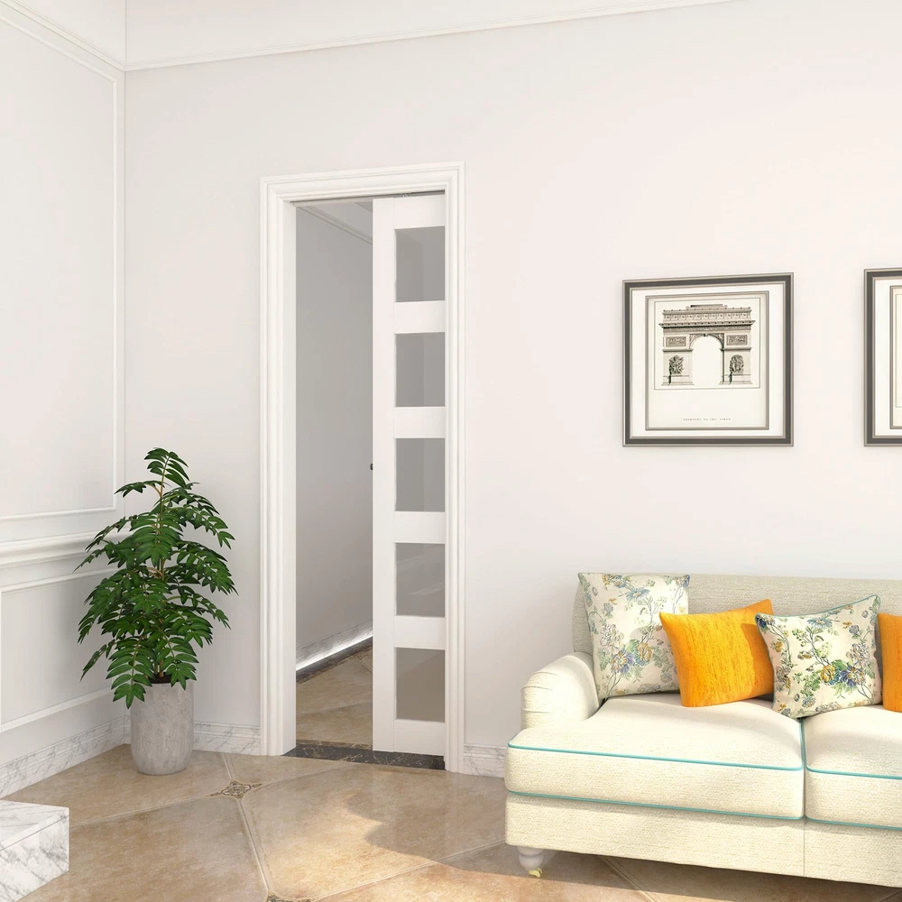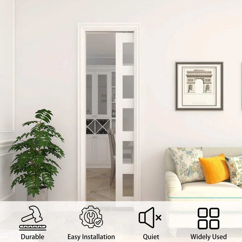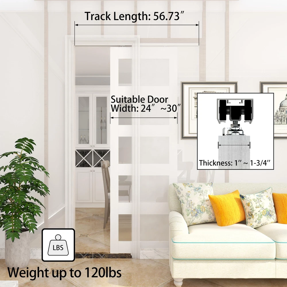 Excellent Structure: Commercial grade precision extruded aluminum box track ensures door will not jump from track, convex rails on track allow flexible and free rolling. Pocket door track is made of high-quality aluminum, which is corrosion-resistant, rust-proof. Smoothly and Soft Close: Three-wheel hangers guarantee the weight of the door to be evenly distributed on each wheel, with heavy-duty ball-bearing offer minimum friction and quiet rolling. With two-way soft-close mechanism, ensures quiet and safe operation by dampening door opening/closing action. Max capacity 120lbs. Dimension: Suitable for door panel thickness 1" to 1-3/4"; door panel width 24"-30". Max Door Weight up to 120lbs per panel. Easy to Install and Widely Applicable: The box rail structure is not complex. Quick release locking tab allows easy door installation/removal without dropping track. We also provide detailed professional installations. This track set is suitable for various scenes, such as bedroom, study, storage room, balcony, gym, office, etc. The pocket door track can meet most of your needs. Package Includes: 1x aluminum track, 1x double sided soft close mechanism, 1x hanger with mounting plate, 1x floor guide, 2x soft close actuators, and wrenchs & instructions & mounting screws. Great Value Option:100000 cycles test passed and guarantee the pocket door track can be used for 10 years! We are reliable and qualified manufacture. Professional engineer team is dedicated to the pocket door hardware. Professional customer service team help you solve all problems in time.