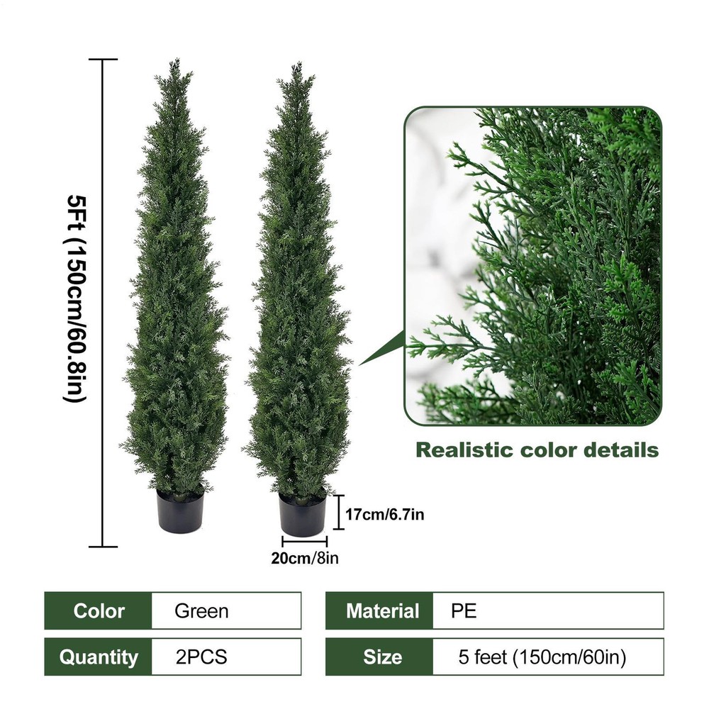 Store category Sign Up Now ! You may also like Product Description Bullet Points: Improves Outdoor Aesthetics: Emulating the lifelike growth of authentic flora, our outdoor topiary set of 2 adds a natural charm to any space. The charming cedar design, adorned in dark and light greens, brings a remarkably realistic charm to your patio, balcony or yard Improved Convenience: Perfectly suitable for patios, porches, or doorways, this topiary set adds natural beauty indoors, easy to maintain, no need for watering and sunlight, ideal for a busy life Improves Outdoor Aesthetics: Crafted with anti-fading, UV-resistant PE, this topiary set maintains its vivid colors and lifelike look for enduring indoor or outdoor display Flexible Placement: Whether you want to place it directly on the ground or in a pot, this topiary set of 2 provides easy installation and can be used anywhere. Adjust the height to fit different decor themes by adding foam or wood in the pot. Take it out and use it to create a striking visual appeal that suits your individual style. Vast Application: As an ideal complement to year-round or festive home decoration, ideal for occasions like housewarming and opening, this versatile use set brings a beautiful experience of nature Add a touch of nature to your space with our artificial topiaries. With dark and light green tones, it showcases a natural look. The use of anti-fading and UV-resistant PE means low maintenance is required. You can easily add foam or wood in the pot to fit your preference. Perfect for housewarming and opening events, enjoy the beauty without the hassle. Specifications: Product Name: Artificial Pine Tree Color: Green Material: PE Product size: 5ft/1.5m Packing List: 2* Artificial Topiary Trees Notes: 1. Due to different lighting and screen settings, the item color may be slightly different from the picture. 2. Due to different manual measurements, please allow a 1-2cm difference in size. 3. Choose a suitable location to place the artificial pine tree for the best decorative effect. 4. Clean the surfaces of the artificial plant regularly to keep its appearance clean and bright. Payment Delivery details Terms of sales About us Feedback & DSRs Payment Before you palce an order, please kindly make sure that you have a paypal account. We accept PAYPAL payment only. Payment should be completed within 2 days after auction closed, or unpaid dispute will be filed for an closing auction. An unpaid case will be filled after 4 days. Delivery details We ship to your eBay address. Each package will be shipped to US by UPS Regular Parcel with tracking number. Please check your shipping address carefully before checkout, it can't be changed if order completed. All items will be shipped within 1-2 business day upon receipt of payment.Orders placed on weekend will be shipped within 3 days. If you do not receive your item in 7-10 business days.please contact us immediately for further assistance. We will be responsible for any damages or losses incurred in the shipping process. About us We maintain high standards of excellence FIVE STAR and strive for 100% customer satisfaction! Positive Feedback is very important to us. We hope that you contact us immediately Before you give us neutral or negative feedback, so that we can satisfactorily address your concerns. We promise to offer the lowest price and high quality produce. Our working time: From Monday to Friday(9:30 am to 18:00pm), we don't working on holidays ,hope you can understand and know that , thank you. Please always talk to us via ebay Message. We appreciate your business and look forward to growing our e-Bay sales with satisfied customers. Feedback Contact us If you have any questions, please feel free to contact with us by ebay Message during our business hours ( 9:30a.m. to 5:30 p.m.), or email us through eBay, we will try our best to help you to resolve it. For any presale or after-sale questions,please do feel free to email us! Due to the time difference, each email will be replied within 1 working day,and weekend will be delayed a bit. Feedback