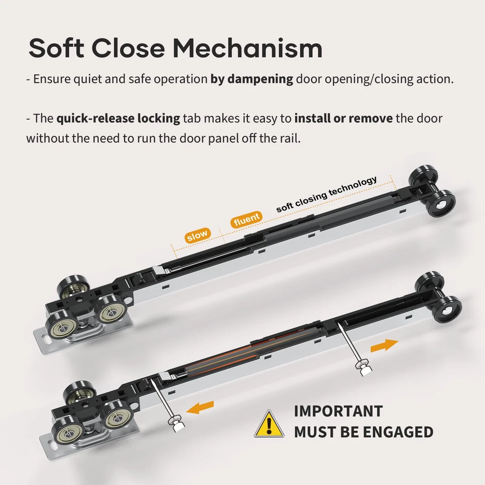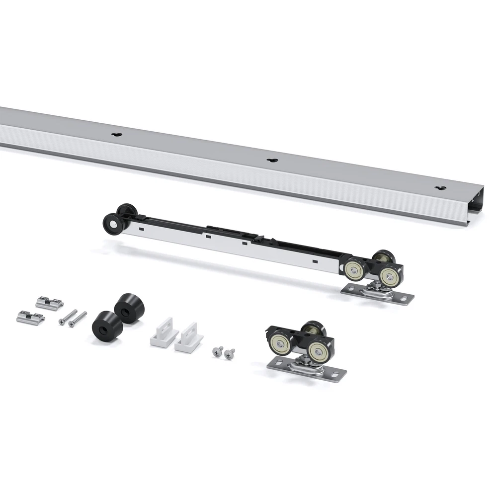 Commercial Grade Pocket Door Hardware: High precision aluminum box track for pocket door, concealed sliding ensures beauty and durable. Pocket door track can be cut into any length to meet your own require Soft Close Sliding Door Track: Ball bearing three wheel roller slide smoothly and quietly, tested beyond 100,000 rolls. The quick-release locking tab makes it easy to install or remove the door without the need to run the door panel off the rail Package Includes:(1)56-3/4" rail,(2)rollers,(1)door stops,(2)floor guide. DOOR NOT INCLUDED. Fit door width 23"~30";Fit door thickness 1" ~ 1-3/4"(25mm~45mm); Door weight capacity: 200lbs Easy Install: Easy installation tracks for sliding closet doors. We provide step-by-step graphic & text installation parsing manual, you can also get soft online copy and professional installation guide from our online service. All items have been multiple inspected before on market 24 Hours Stand By: specialize in sliding door and hardware many years, if there anything missed or broken, please let us know, we are whole day online to solve your problem Notice: Our track length is 56inch instead of 60inch, and the spare 2 inches at each end is reserved for service