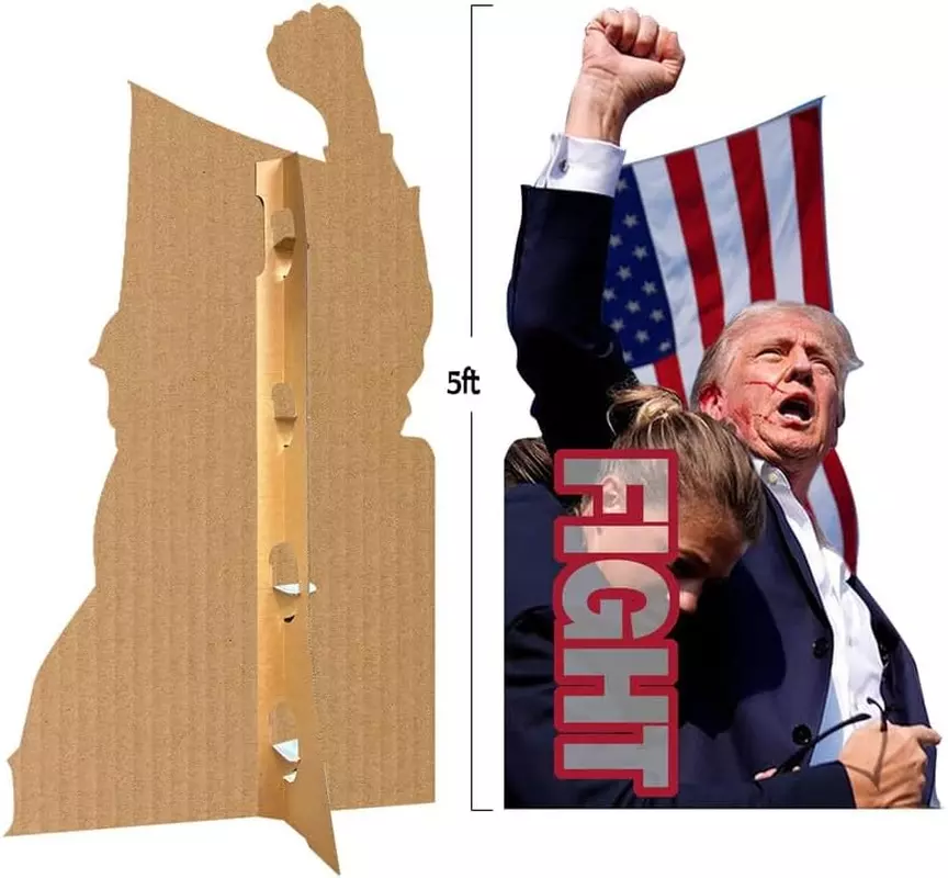 - Life-size cardboard cutout (5 feet tall) of Donald Trump in a dynamic "fight" pose, perfect for events, parties, or as a conversation piece. - High-definition printing ensures sharp details and vibrant colors, capturing the essence of the scene. - Sturdy cardboard construction with an easel back for easy setup and stability on any flat surface. - Adds a playful and spirited atmosphere to gatherings, making it a memorable addition to any Trump supporter's collection. - Great for photo ops and social media posts, guaranteed to generate attention and engagement at events and themed parties. 5Ft Donald Trump Fight Stand Up | Cardboard Cutout | Life Size Standee | Picture Poster Photo Print - Cardboard