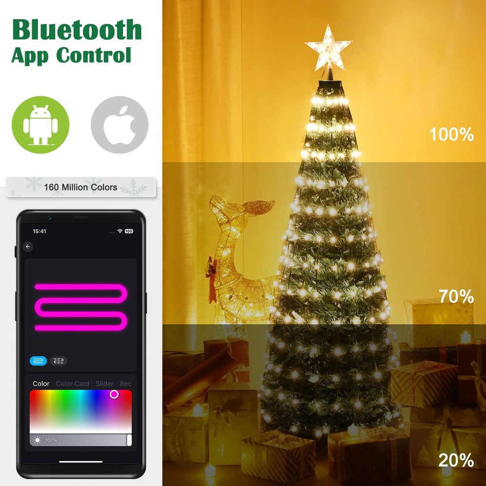 Features: - Christmas Tree Decoration - 5 ft Pre-lit Artificial Christmas Tree with lighted star finial & 205 pcs RGB fairy LED beads to create splendid & colorful lighting in a variety of patterns, designed for dual use as Christmas tree decoration at daytime & ambient lights at night - Diversified Lighting Modes - Provides 160 million colors, music modes & 25 preset dynamic lighting effects for you to choose to match your mood, greatly boosting the party ambience; DIY mode allows you to change LED bead color to create personalized pattern - Bluetooth App & Remote Control - Bluetooth connectivity allows you to pair the lights with smartphone & adjust the light setting via APP such as color selection, brightness, speeds, modes, compatible with IOS & Android system; Comes with a remote control for easily starting/stopping the light and changing light setting - Energy-Saving & Durable - Christmas tree light uses 10W of energy totally, significantly reducing energy consumption for holiday decoration; Made of PVC material, durable & wear-resistant for long-lasting use - Easy to Assemble & Storage - Easy setup in minutes without using tools, just connect 4 legs to the base, assemble the poles, install string light and fixate the star finial; Comes with leaf wire coils which can be easily folded flat and fully detachable poles for easy storage Specifications: - Overall Dimension(Dia.xH): 18 11/16" x 61 13/16" (47.5 x 157 cm) - String Light Length: 50 3/8" (128 cm) - Power Cord Length: 9 5/6 ft (3 m) - Voltage: 120 V, 60 Hz - Power: 10 W - LED Lifespan: 20,000 hrs - IP Rating: IP44 - Net Weight: 4.9 Lbs (2.2 kg) Package Contents: - 1x Christmas Tree - 1x Star Finial - 17x Light Strings - 3x Poles - 1x Base - 4x Supporting Legs - 2x Connectors - 1x Water Bag - 1x Remote Control - 1x Manual [Christmas Tree Decoration]: 5 ft Pre-lit Artificial Christmas Tree with lighted star finial & 205 pcs RGB fairy LED beads to create splendid & colorful lighting in a variety of patterns, designed for dual use as Christmas tree decoration at daytime & ambient lights at night, adding dreamy atmosphere for living rooms, offices, bars, restaurants, parties [Diversified Lighting Modes]: Provides 160 million colors, music modes & 25 preset dynamic lighting effects for you to choose to match your mood, greatly boosting the party ambience; DIY mode allows you to change LED bead color to create personalized pattern, fully unleashing your creativity [Bluetooth App & Remote Control]: Bluetooth connectivity allows you to pair the lights with smartphone & adjust the light setting via APP such as color selection, brightness, speeds, modes, compatible with IOS & Android system; Comes with a remote control for easily starting/stopping the light and changing light setting [Energy-Saving & Durable]: Christmas tree light uses 10W of energy totally, significantly reducing energy consumption for holiday decoration; Made of PVC material, durable & wear-resistant for long-lasting use [Easy to Assemble & Storage]: Easy setup in minutes without using tools, just connect 4 legs to the base, assemble the poles, install string light and fixate the star finial; Comes with leaf wire coils which can be easily folded flat & fully detachable poles for easy storage, convenient to pack away for next year use; With water bag to add weight for better stability