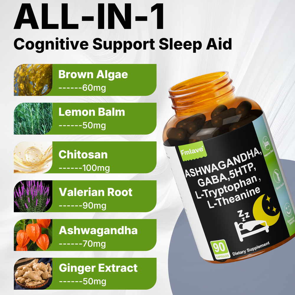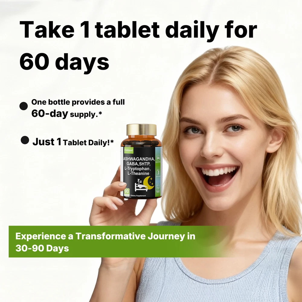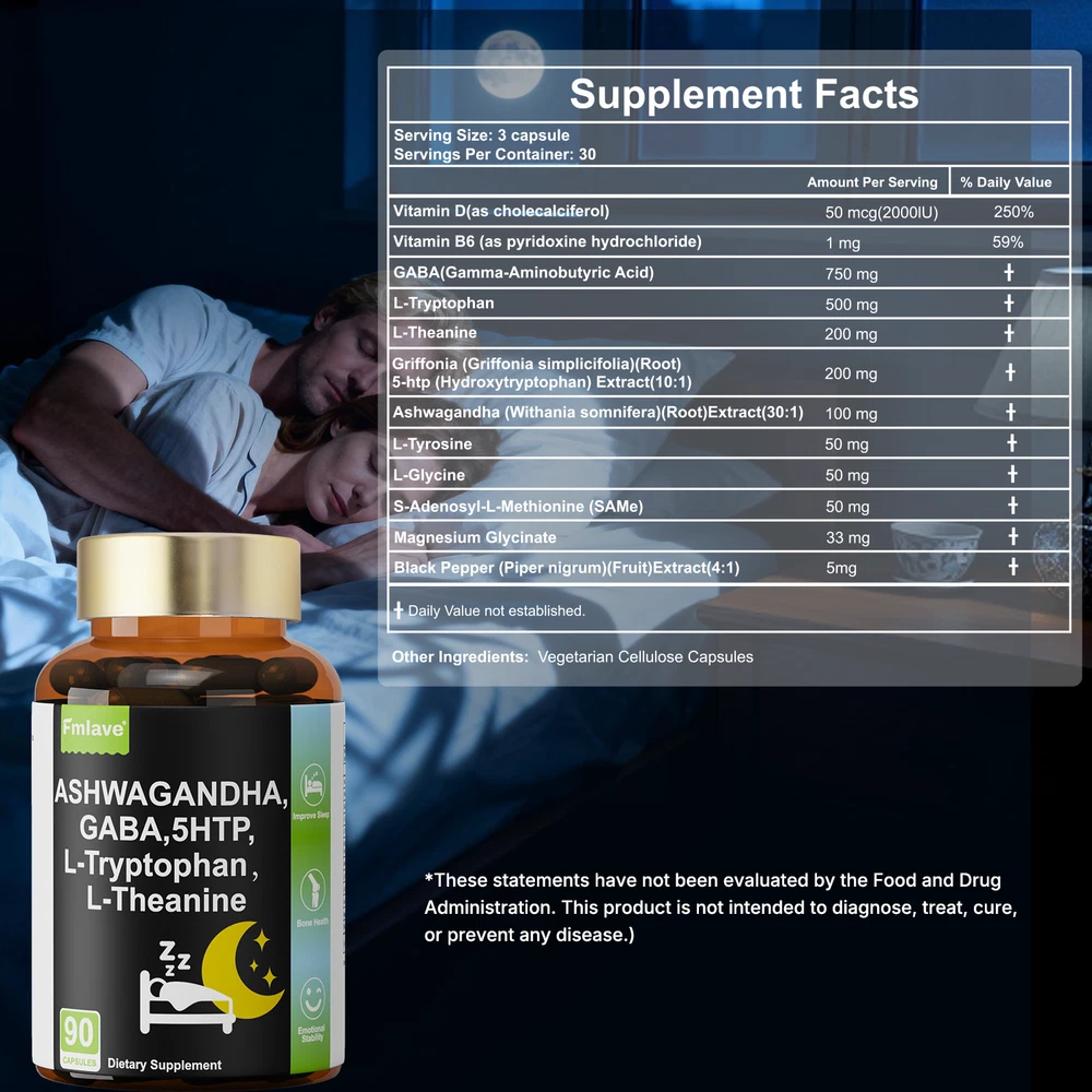 Sleep & Relaxation Capsules – Ashwagandha, GABA, 5-HTP | Natural Stress Relief, Muscle Relaxation | Better Absorption | 90 capsules | 30-Day Supply Active Ingredients: GABA, L-Tryptophan, L-Theanine, , 5-HTP, Ashwagandha, Vitamin B6, Vitamin D, Magnesium Glycinate, Black Pepper, S-Adenosyl-L-Methionine (SAMe) . Features: 🌿 Comprehensive Mood & Relaxation Formula – Combines GABA, 5-HTP, L-Tryptophan, and L-Theanine to naturally boost serotonin levels, reduce anxiety, and promote calm clarity. 😌 Adaptogenic Stress Relief – Ashwagandha helps your body adapt to stress while lowering cortisol levels, supporting emotional balance and resilience. 💤 Deeper, Restful Sleep – Fall asleep faster and wake up refreshed with natural neurotransmitter support that encourages healthy melatonin production. 💊 Enhanced Absorption with Black Pepper – Includes Black Pepper Extract to increase bioavailability and ensure your body fully absorbs each active ingredient. 🌞 Mood-Boosting Vitamins & Minerals – With Vitamin D3, B6, and Magnesium to support serotonin synthesis, nervous system health, and a positive mood all day long. Main benifits: Supports Relaxation Supports Serotonin Regulation Supports Mood Balance Support Deeper, Restful Sleep Support Stress Relief Note: This product is a dietary supplement and is not intended to diagnose, treat, or prevent diseases. The FDA has not evaluated its effectiveness. HOW TOTAKE IT: Take 3 capsules once a day. For best resultstake with a meal and an 8 oz.glass of water or asdirected by your healthcare professiona. What you would receive? 1x 90 capsules Sleep Aid Supplement.