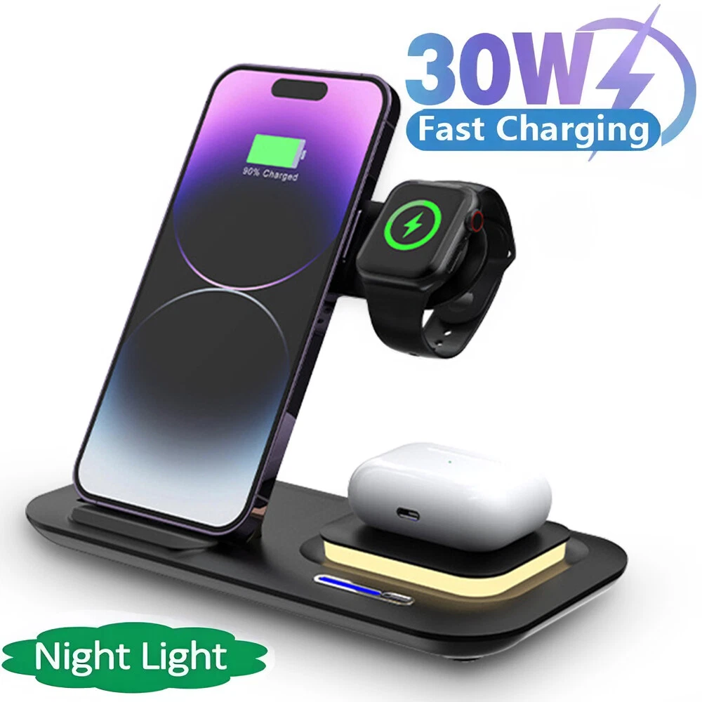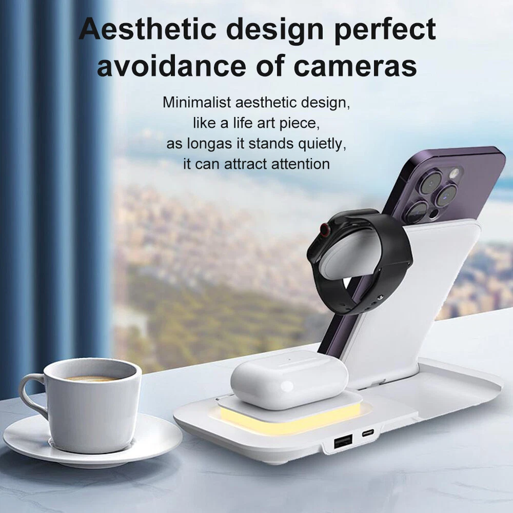 Picture Gallery Description Attention: 1. For a fast charging experience, please use a 9V-2A or 12V-2A power adapter (adapter not included). 2. The watch charger is only for Apple Watch , it can't charge Samsung Watch or other brand watches. Features: 1. [5-in-1 Charging Station] The wireless charger conveniently charges your iPhone, Apple Watch, AirPods, and other devices with wireless charging capabilities at the same time. The charging station makes it easy to charge your entire desktop and nightstand, so say goodbye to tangled cords. Compatible with iPhone 16, 15, 14, 13, 12, 11Pro/Max/Mini/Plus, X, XR, XS/Max, SE, 8/Plus, iWatch 8/7/6/5/4/3/2/SE, AirPods 2/3/pro/pro 2. 2. [Rapid Wireless Charger] Simply place your wireless device on the charging station, make contact and start charging steadily and efficiently. After many extreme tests and fan feedback, we use high power charging chips and world-class electronics to ensure the fast charging quality of the charging station. 3. [Safe Wireless Charger Holder] Wireless charging station with over-current protection, over-voltage protection, over-temperature protection and foreign object detection. The wireless charging station's reasonable internal circuit design prevents overcharging from damaging the device's battery and ensures safe and fast charging of the device. 4. [Foldable Travel Wireless Charger] The wireless charging station for a wide range of iPhone devices features a compact and foldable design that provides fast charging for your iPhone at home, in the office and on the go. The wireless charger can be used as a wireless charger stand with angle adjustment. The wireless charger can be used as a wireless charging pad to keep your phone charged by simply laying it flat. 5. [Fits Cases and Sleep Friendly Indicators] The wireless charger supports most cases up to 2 inches/5 mm thick, eliminating the need to remove the case when charging with the wireless charging station (excluding cases with magnetic or metal attachments). Place your device on the wireless phone charger to start charging, and the LED night light can be turned off manually. So you don't have to worry about the light affecting your sleep. Specifications: *Product Name: 5-in-1 Wireless Charger *Input power: 9V-2A/12V-2A *Mobile phone output: 5W/7.5W/10W/15W/30W *Watch output: 5W (max) *Headphone output: 3W (max) *Charging efficiency: ≥75% *Product material: ABS *Product color: black/white Package List: 1 * 5-in-1 wireless charger 1 * Type-C cable Attention: 1. Not included not include the power adapter! 2. Item is limited to charger only, not including headphones, watches! 3. Due to manual measurement, please allow a difference of 1cm error! 4. Depending on the light color or monitor hue may vary! Shipping Policy Payment Policy Return Policy Shipping Policy 1. We only ship to confirmed PayPal addresses. 2. Economy Shipping, with no tracking number. Standard Shipping, with tracking number. Express (Expedited) Shipping, with tracking number. 3. Economy shipping needs 2-5 weeks to arrive mostly. In rare case, it can take up to 6-8 weeks. It depends on your location and local postal service, as well as the weather condition along the shipping. 4. If you need a faster delivery time, you could choose Express (Expedited) Shipping. If you need a tracking number, you could choose Standard Shipping. Payment Policy We accept PayPal only. We only ship item to your PayPal verified address. Please pay attention that import duties, taxes and charges are not included in the item price or shipping charges. These charges are the buyer's responsibility. Please check with your country's customs office to determine what these additional costs will be prior to bidding/buying. Return Policy 1. We offer 60 day money back or replacement guarantee. In addition, it allows customers to return new and unused products in their original factory condition for any reason within 60 days from the date of purchase. 2. Although we test each item and they are packed professionally, few item (less than 0.1%) might be damaged during the shipping. Please feel free to contact us within 4 days after you receive your package about replacement. 3. If you don't receive items over 35 days, please make sure to contact us before leaving any neutral or negative feedback. We'll try our best to help you solve the problem. If we authorized the return, customers will get an email with instructions for returning the item. Email will be replied within 24 hours on Chinese business hours. On Dec 4, 2024 at 23:02:31 PST, seller added the following information: