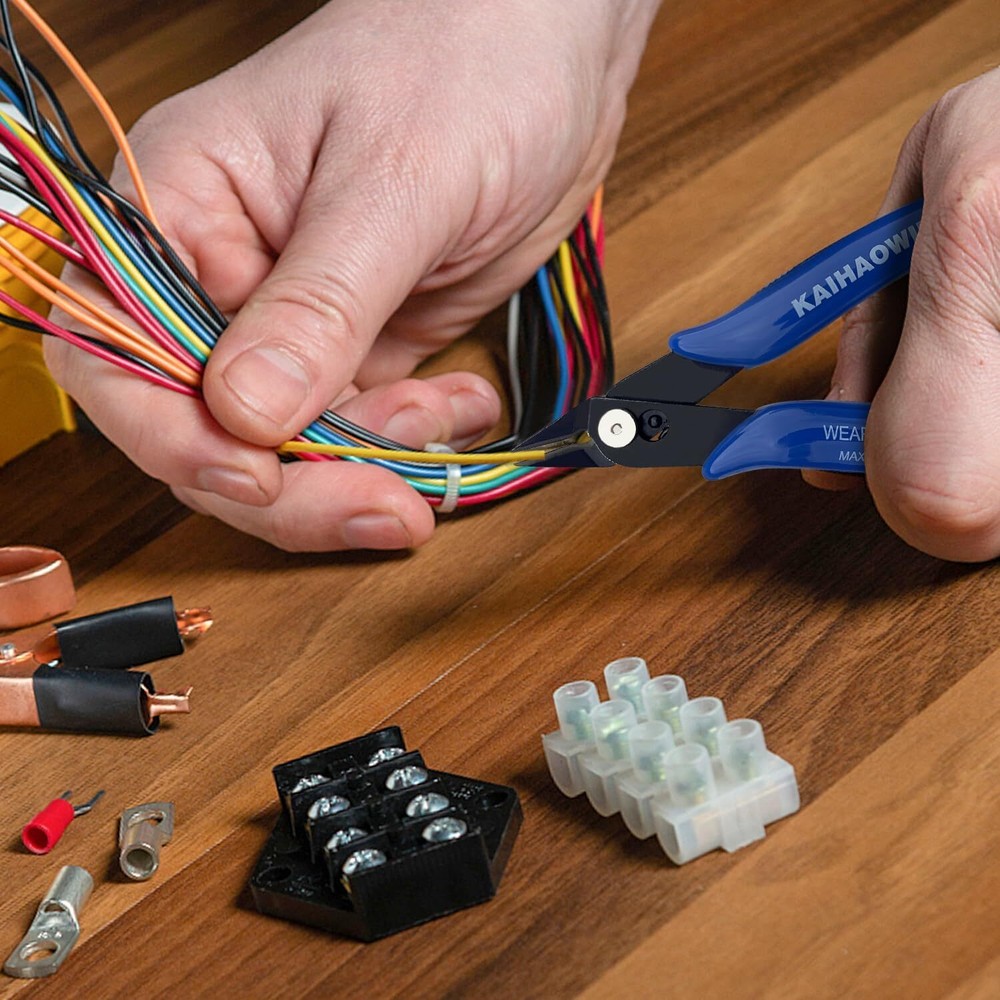 Description 【Precision】Mini Precision Electronics Wire Cutters, 2 pcs 170 shear cutters , 5 inch, Blue, made of special steel,high-carbon steel, high-frequency hardened, Ultra sharp, can cut up to 16 AGW coper soft wire. Hard steel wire is not recommended to cut 【Easy to use】 The jewelry wire cutters have a spring in the middle. It can bounce back automatically and won't be tired in long time use. Right size and it's very easy to use. 【Internal Spring Loaded 】This diagonal wire cutters can improve efficiency, and the spring loaded in the wire cutting pliers, can reduce fatigue.This wire snips works well for someone with arthritis or grip issues. 【Versatility】This cutting pliers are suitable for cutting electronics, soft copper wire, plastic wire, Zip Tie, small cable, aluminum wire, soft alloy wire, wire flush cutter jewelry making. This wire cutters for crafts is easy to use and specially suitable for tight place using. 【Comfortable Handle】The handle of the cutting pliers has a rubber handle, which can play a protective role and provide a comfortable grip. The video showcases the product in use. The video guides you through product setup. The video compares multiple products. The video shows the product being unpacked. A sharp blade can make clean cuts KAIHAOWIN Mini Flush Cutters Length: 5inch/ 12.7cm Weight: 2.2oz/ 60g Metrial: Heat-treated High Carbon Steel 1 Circuit Wire Cutting 2 Zip Tie Cutting 3 Plastic Model Cutting 4 Jewelry making