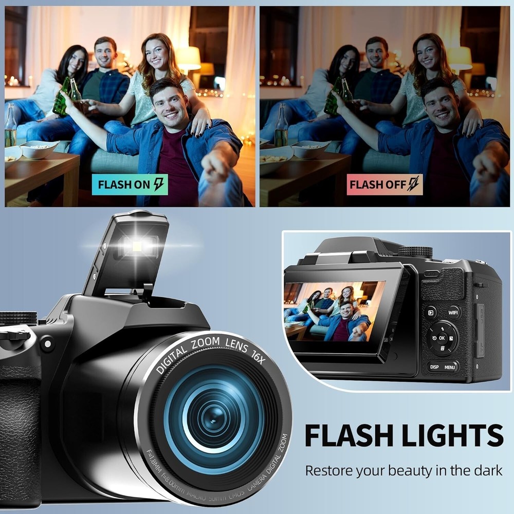 📷[64MP&5K Digital Camera] Our cameras provide further integrated solutions for photographers. With its high-resolution 64-megapixel sensor, camera can capture detailed images with rich colors and contrast. With its flipped 3-inch IPS screen and 5k video resolution, this video camera smoothly producess stabilized HD video. In short, our vlogging cameras will be ideal for both photography and video recording! 📷[16X Free Digital Zoom &Autofocus] Our Point Shoot Digital Cameras features 16X zoom and autofocus,offering endless possibilities for your photography!The freely controllable 16X digital zoom supports you to take detailed close-ups shot, regardless of distance. Autofocus function will make it easy for photographers to focus on capturing moving moments.Besides,Our cameras offer more customisation options for Beginner Photography, and you can easily adjust the flash, ISO, and other settings to meet your need 📽️[Versatile 5K Vlogging cameras for Youtube] With many video/shooting modes,this 5K vlogging camera for YouTube is suitable as vlog production tools and multipurpose cameras,such as Time-lapse & continuous shooting,fast & slow motiom,ect.The included microphone will also be more convenient for you to receive audio.Those make your videos and new career more unique.Two rechargeable batteries and battery charge help you vlogging without worrying the power supply. 💻[PC camera option & HDMI output] We've also designed our digital cameras to be convenient for transferring. You can use the USB port to link to your PC and use our camera as a webcam; or you can use WiFi and APP to transfer your data to your mobile phone; and you can also use the HIDM port to play the videos you take on a larger screen. Convenient and efficient linking methods will bring more convenience and help you save and edit your favorite videos. Previous page Next page Filters&Exposure Auto-Focus & Anti-shake Joint operation WiFi & App Control Travel Ready
