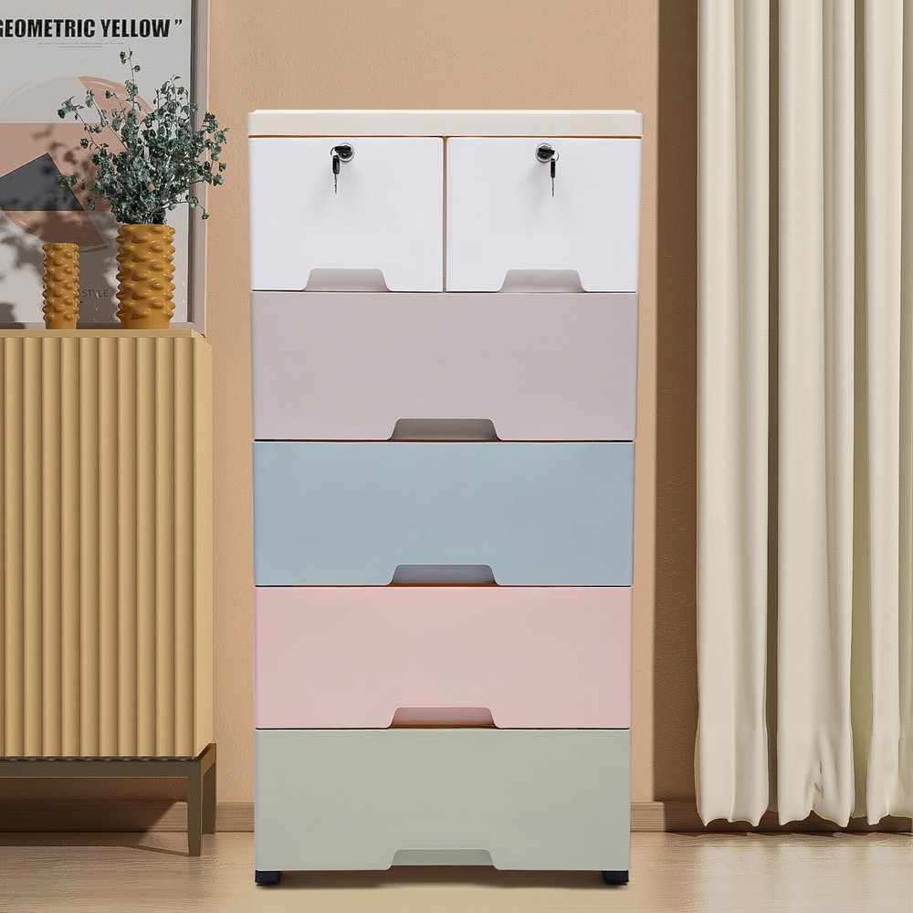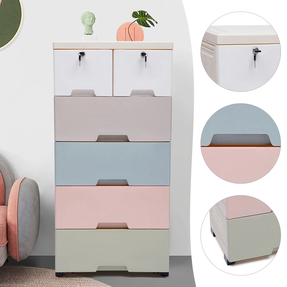 5-Layers Plastic Storage Organizer Cabinet Dresser Bedroom Tower Cupboard Drawer Description Are odds and ends cluttering your room? Are you still worried that the space at home is too small? Don't worry, this product can help you. This storage cabinet has 6 drawers that can store a lot of items to meet your storage needs and give you a neat space. Key Features High-quality Material: This product is made of high-quality PP, which is strong, durable, and not easy to deform. Good material can extend its service life. Elegant Appearance: The brilliant colors, as well as the classic design, makes it look elegant. It is a good decorative piece that can blend in with different home decor styles and add color to the home. Saving Space: This product is designed vertically. It makes full use of the unused vertical space to store items and occupies a small area of 50*35cm/19.69*13.78inch, which can save you a lot of space. Strong Load-bearing Capacity: The load-bearing capacity of this product is 30kg/66lbs, which is strong enough for you to store items without worrying about it shaking and tipping. Large Capacity: This product includes two small drawers and four large drawers, which allows you to distinguish the placement according to the size of the items. The 6 drawers make it possible to hold more items and meet your daily storage needs. Makes Space Neat: It has six drawers that make it easy for you to store as well as access your items. It can get your room out of clutter and back to a neat and organized state. Excellent Sealing: The drawer design makes this product well sealed to prevent dust as well as insects from entering. You can use it with peace of mind. Stackable Design: The stacking design allows you to combine and disassemble them according to your needs. You can store flexibly. Protect Your Privacy: This product comes with two drawers with locks, which can protect your privacy very well. Good Stability: This product is designed with a dense frame and has a large landing support area, so it is very stable. You can use it without worrying about it shaking and tipping over. Eco-friendly : The food-grade PP material is non-toxic, odorless, and good for human health, and it is also recyclable, which is very environmentally friendly. Convenient to Move: The four wheels on the bottom of the product are hard-wearing and make very little noise when in use, providing you with a quiet environment. At the same time, it slides flexibly, making it easy for you to move the product and for cleaning. Easy to Clean: The surface of this product is smooth and flat, which is easy to clean. You just need to wipe it with a wet rag. Easy to Install: This product is simple in structure and complete in the package. You only need a few simple steps to install it, which is very time-saving and labor-saving. Guaranteed Customer Service: We aim to provide quality products and services. If you have problems, please feel free to contact us. We will reply and solve the problem for you as soon as possible. Details Drawer Stops: Each drawer has raised stops on both sides to prevent the drawer from slipping out easily. Rounded Corners: The corners of this product are very rounded and smooth, which can protect you from collisions and is very safe to place in your home. Thickened Top Panel: The thickened top has a strong load-bearing capacity, which allows you to put a lot of items on it with peace of mind. It can also facilitate your access to commonly used objects. Recessed Handles: The drawers are designed with recessed handles, which makes it easier to access items and saves surface space. At the same time, the rounded handles protect your hands from scratches and are more aesthetically pleasing. Application It is suitable for storing clothes, toys, children's books, and other items. It can be placed in the crevice space next to beds, closets, sofas, and cabinets. Its load-bearing capacity is 30kg/66lbs. Specification Color: White, Gray, Blue, Pink, Green Material: Food-grade PP Shape: Rectangular Style: Modern Number of Layers: 5 Number of Drawers: 6 Load-bearing Capacity: 30kg/66lbs Product Size: 50*35*102cm/19.69*13.78*40.16inch Gross Weight: 7.9kg/17.42lbs Package Size: 51.5*40.5*49cm/20.2*15.9*19.2inch Package Included 6* Drawers 6* Drawer Panels 1* Top Panel 5* Frames 16* Panels 4* Wheel Covers 5* Wheels 4* Keys 1* Chinese Manual Notes Please read the manual completely before installation and use, and pay particular attention to the safety instructions included. Please allow the slight color difference caused by the shooting light and 1-3cm error due to manual measurement, and make sure you do not mind before ordering. Payment Delivery details Terms of sales About us Contact us Payment We accept ebay payment 。 Fees such as import duties, taxes are not included in the item price or shipping costs. These charges are the buyer's responsibility. Delivery details Shipping: 2-9 working days to: USA Terms of sales We maintain high standards of excellence and strive for hundred percent customer satisfaction. Feedback is very important to us. We hope that you contact us immediately before you give neutral or negative feedback, so that we can address your concerns. It is impossible to address issues if we do not know about them! About us Your satis faction is our ultimate goal. We work hard to earn your trust and future business. Our certified technicians have tested each item before shipping. The unit comes with 1 year limited warranty on all manufacturing defects. a) If you receive a defective item, you may return it or ask for a discount. Please contact us within 14 days after you receive the package. b) What you returned must be intact and in its original packaging as re? u. Customer is responsible for shipping costs of the returned item. c) We will cover the cost of shipping back t with the shipping rate indicated in the registration page. We will send you a new unit or refund the full payment you paid. Thank yo