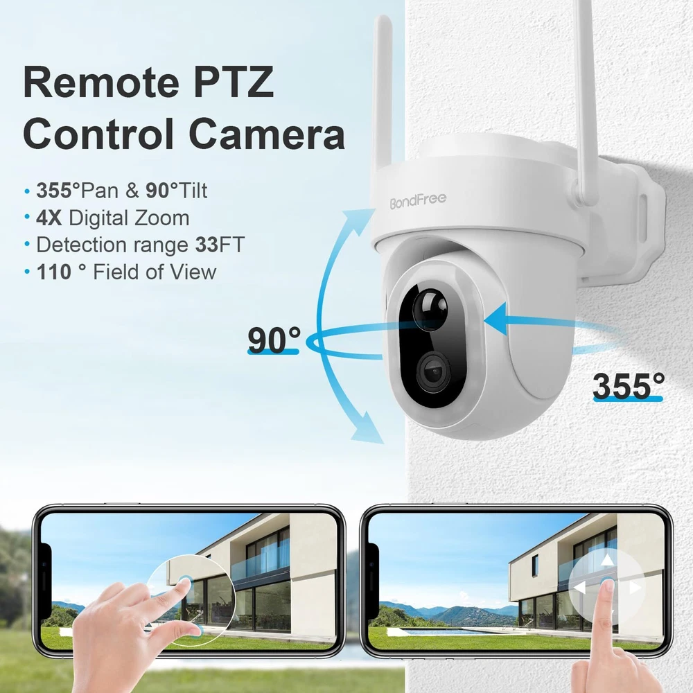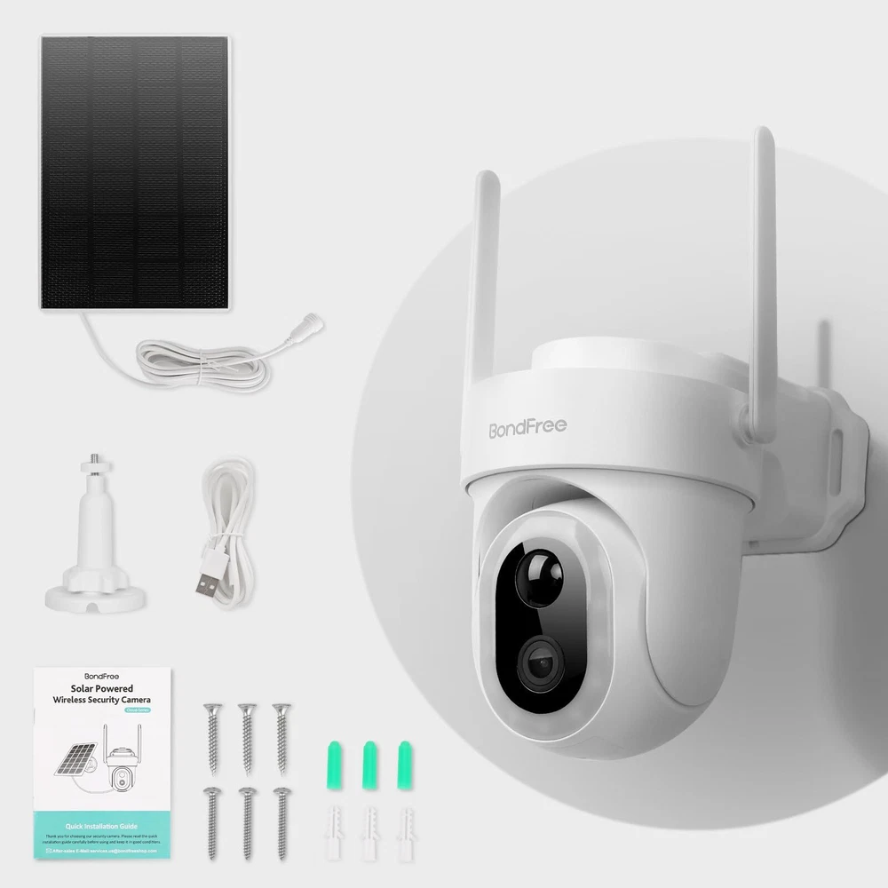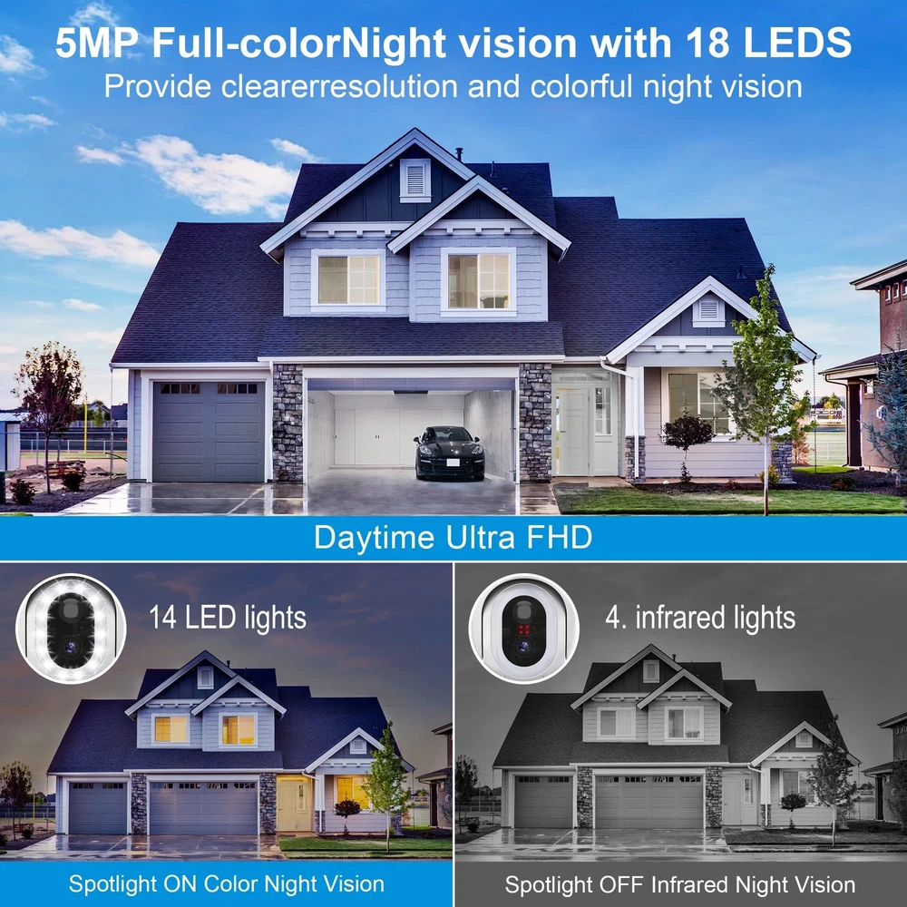[5MP Ultra HD Night Vision] New upgrade 5 megapixel, provides 4K full HD. solar camera take a 355° horizontally and 90° vertically panoramic shooting and 4X digital zoom, make sure cover your target area without blind spots. 3 night vision modes (full color, black and white, smart) for to choose. Built-in CMOS sensor and 4 IR lights automatically sense ambient light and switch to color night vision mode, see clearer details and color images even in pitch dark up to 33ft! [IP66 Weatherproof ] Provide continuous power for security cameras wireless outdoor with low energy consumption and high conversion rate solar panel that can display real-time battery level. The outdoor solar camera can work in the temperature range of -68°F to 122°F, and IP65 Weatherproof. Enjoy 3-8 months of standby time solely on battery power, while the solar panel ensures uninterrupted 365-day protection. [Motion Detection & Real-time Alerts] With advanced PIR sensor, the outdoor wireless camera can detect human movement (when turned on, it will only alarm when a human passes by, and the sensitivity is adjustable in 5 levels), push a real-time alert notifications to your phone, trigger loud siren, spotlight or sound alarming to frighten away unwanted visitors. Customize alarm schedules, detection area, adjust sensitivity levels from 1 to 10 for higher accuracy and fewer false alerts. [Real Time Multiplayer Sharing] The home security camera supports multiple people watching real-time videos simultaneously and is equipped with a built-in microphone and speaker, allowing you to establish real-time conversations. Event recording to micro SD card up to 128GB(not included) and cloud storage (6s free playback with encrypted secure data). You can view what is happening and replay what has already happened anytime, anywhere. [After Sale Service]: The camera is compatible with Alexa and only supports 2.4GHz WiFi. There is no wiring hassle and it can be installed on walls and ceilings. We provide technical support. If you have any questions during use this security camera wireless, please feel free to contact us. Our friendly team will help you solve all problems as soon as possible.