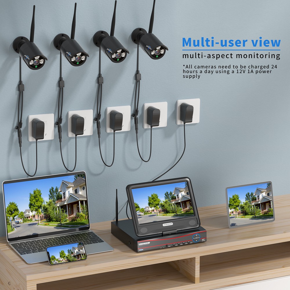 this item is used ,not brand new . 【10inch Monitor, Need Plug Power Supply】 【Expandable 10 Channel NVR】 【Waterproof& HD Video】 【Remotely Anytime and Anywhere】 【Dual WIFI NVR 】 【Preinstalled 1TB HDD & Cloud Storage】 About this item: Notice: 1.The wireless system doesn't mean you can use the system without any cables. Power supply still need to power on the cameras and NVR. 2.This product is a used item , if you are not satisfied with the used item, you can buy a brand new product in our store, please refer to this link: https://www.ebay.com/itm/405289664437 About this item 【10inch Monitor, Need Plug Power Supply】 Wireless video security system wireless CCTV camera system features a 10" full HD 4K monitor (Not Touch Screen) with built in NVR. It is easy to setup and DIY installation. True plug and play. The wireless cameras and NVR monitor are auto-paired during the factory setting. You just plug all the power supply and connect TV monitor to NVR with a VGA/HDMI Cable. (NOTE: They all need to plug in the power adapter) 【Expandable 10 Channel NVR】 This system includes 1x 10-channel 8MP (4096*2160) 10.1" LCD Monitor NVR and 4 x 5MP (2560*1920) wireless IP66 waterproof cameras. Connect the NVR and cameras with power adapter, cameras coming with 10ft cable power supply, it is more convenient to install. 【Waterproof& HD Video】 Records in 5MP Full HD to capture sharp and crisp images, provide crystal-clear HD live video, in order to crisp smooth footage day and night the bullet cameras build in 3 array IR cut filter with auto switch. Up to 15m Night Vision, The IP 66 weatherproof aluminum housing material to keep Indoors & Outdoors recording. 【Remotely Anytime and Anywhere】 Wireless surveillance camera system allows you to view the live video remotely anytime and anywhere by Phone and Pad (available for Android & IOS system). Download free APP “EseeCloud” from Android Google Play or Apple APP Store. Register a New Account, then add by device ID. You can view the Video by WiFi or 4G/5G Network. Supporting Windows and MAC OS system computer download Eseecloud software to remotely check. 【Dual WIFI NVR 】 Dual WIFI NVR support 2 ways to connect with network: connect with network by Ethernet cable or connect with 2.4Ghz/5Ghz WIFI network. 【Preinstalled 1TB HDD & Cloud Storage】 H.265+ compression will save the HDD storage, 4Pcs cameras can store 30 days 24/7 days time recording, also provide cloud storage on cellphone app, but it is not free to use, each channel need buy cloud storage one by one. Please Note: camera can be wirelessly connected to the network, but it must be powered by power supply. if you miss power adapter, please tell us to get a replacement one. Wireless Surveillance NVR Kit: This All-in-One 10 Channel 8MP 10.1" LCD Monitor NVR and 4 x 5MP wireless IP66 waterproof Camera. Cameras and NVR connect and set up in few minutes. There is no exposed lines anymore between camera with NVR box , more beautiful, more hidden, more safely. (Warm Note: all the cameras and NVR box need connect power supply) View the video on the mobile App from anytime and anywhere, remotely check the system on phone or computer, please connect the NVR with router by Ethernet cable or wireless connection. Strong anti-interference and 65ft night vision, 2560*1920 image sensor shows more clear and stunning picture and video. Supports multi-alarm triggered (Video Loss, Motion Detection) and alarm Sound, Email, Phone, etc). Suitable for home and small project which help you record, playback, and remote. Item Feature IP66 Weatherproof IP66 super waterproof grade and dustproof, durable outdoor weatherproof casing no matter windy or raining. Install the cameras outdoor or indoor, keep your home or business safe. Note:Power adapter is not waterproof. Day/Night Camera 5MP image sensor makes clear and stunning high-def video. All cameras are equipped with infrared night vision. They can capture clear footage up to 65ft away in pitch-black darkness. Motion Detection This motion-activated email alert function allows you to always stay connected to all the unexpected movements happened in your house. An alarming email will be sent to your inbox. Expandable 10 Channel System The camera system is one-way audio, you can add other wireless cameras from heseeu brand to the NVR. Additionalcamera models to suit your different scenarios. We currently have Bullet 2-Way Audio Cameras, Dome Cameras, PTZ Cameras, Battery/Solar Cameras, looking for a suitable extra camera, please check my shop or contact us. One-way Audio Function Built-in the microphone,so you could not only view the video,but also clearly hear the people on phone app or monitor. Notice:There is no speaker in the camera, so you can't make conversation with people. 24 hours 30 days Reliable Video Recording 1TB Hard Drive Pre-installed in the WiFi NVR enables 30 days video recording (up to 6TB supported) This system allows all cameras recording at the same time. Video Playback at Any Time Replay significant evidence or funny video records. Quick search for any event video. Playback any video on different days, hours, or minutes by controlling the timer axis under the split screen. True Plug and Play The easiest wireless NVR security camera system ever! Power on and all is done! It releases you from messy cablings.No configuration and no need to hire an installation company! A real plug and play security camera system! True Wireless WIFI Connection No ethernet cable is needed to link between the NVR and the router any more, true wireless wifi connection.Freely move the 3MP NVR close to camera, camera will receive stronger wifi signal. Motion Detection This motion-activated email alert function allows you to always stay connected to all the unexpected movements happened in your house. An alarming email will be sent to your inbox. 5MP Tells You Details This security system supports recording with 5MP at 15FPS, showing you som