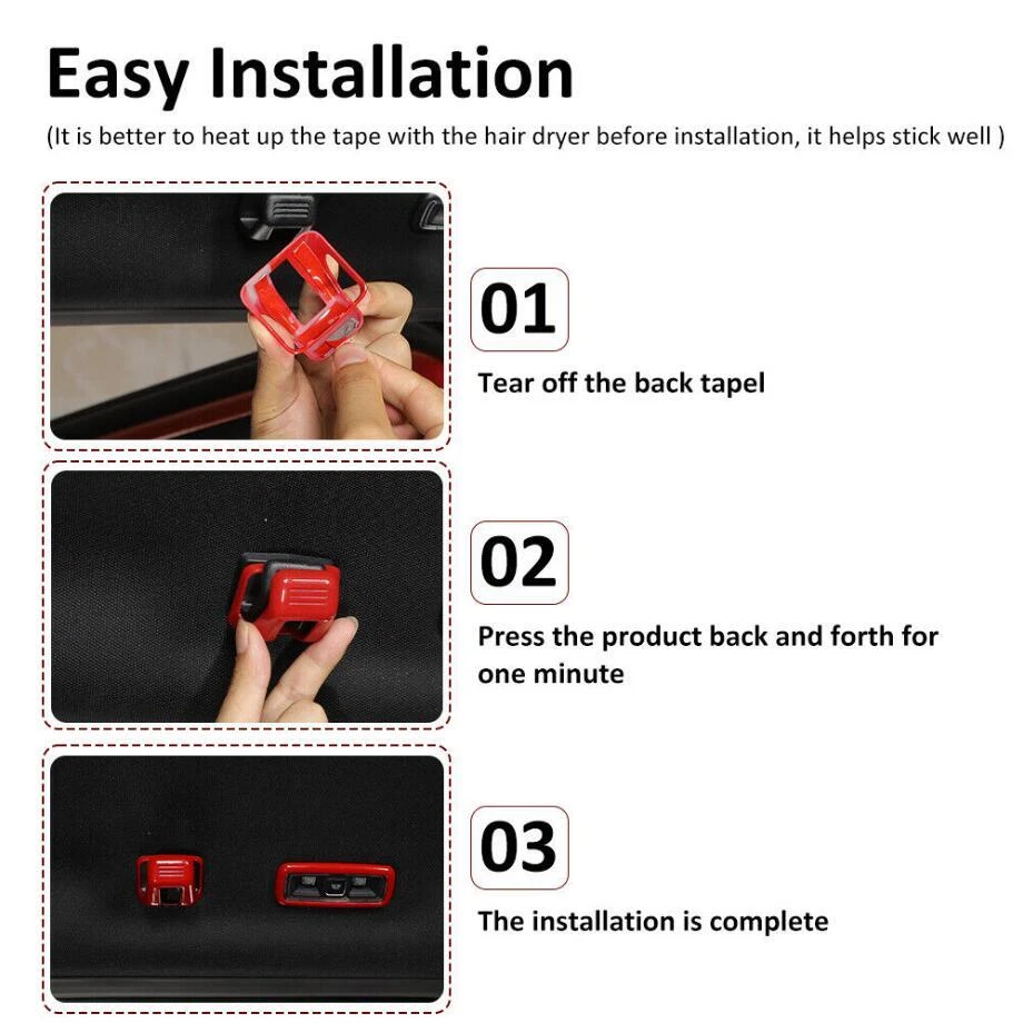 Fitment: Fit For Ford F150 F-150 2021 2022 2023 Feature: Condition:100% Brand new Material: Made of high quality ABS Color: Red Package including:5PCS Made in a ISO9001 Factory,good quality and have been exported all over the world Easy installation.3M automotive adhesive tape is attached. (Sold as seen, please ensure suitability carefully before purchase) INSTRUCTION MANUAL IS NOT INCLUDED 5P Car Roof Hook & Reading Light Cover Trim For Ford F150 21-23 Accessories Red Fitment: Fit For Ford F150 F-150 2021 2022 2023 Feature: Condition:100% Brand new Material: Made of high quality ABS Color: Red Package including:5PCS Made in a ISO9001 Factory,good quality and have been exported all over the world Easy installation.3M automotive adhesive tape is attached. (Sold as seen, please ensure suitability carefully before purchase) INSTRUCTION MANUAL IS NOT INCLUDED Installation method: Step1: please clean the place with 50% alcohol to make sure no dust. Step2: remove the 3m glue in back; Step3 : heat the 3m glue by hot air gun;(A tip for putting on with supplied 3m tape is to warm the handles and the covers this makes the glue on the tape more sticky and they will stay on for ever!) Step 4: install the products in the right place ,Don't wash your car within 48hours. Customer Service If you cannot find the answers to your questions in this listing, please contact us , we will reply u ASAP,we will try our best to pleasure to serve u ! we hope have more happy and longtime shopping experience with u ! Shipping We will ship your order within 120 hours after receiving your verified payment (Excluding Weekends and Public Holidays) ! If u need delivery now , pls inform us , we will delivery it ASAP! shipping Shipping and handing Payment Refunds and returns About us shipping Country Approx / Delivery time United States : 8-25 working days United Kingdom / Australia / Canada : 20-35 working days Brazil / South America : may take up to 5-8 weeks due to strict Custom Inspection Italy / France / Spain / Germany/Eastern Europe : may take up to 6-8 weeks due to strict Custom Inspection Shipping and handing Item will be shipped within 24 -48 hours after full payment is received. · We ship worldwide with flat rate China Post , and other standard international shipping. this international order may take a longer time to arrive, Normally the shippment to worldwide is used to take 8 to 25 business days, exclude Weekend. Payment We accept PayPal only. Payment must be received in 7 business days of auction closing. Any special request cannot be accepted after 24 hours of payment, because most of orders will be processed instantly and same day dispatched. Refunds and returns Please contact us before leaving Netural or Negative feedback if you are not satisfied our service or products. Good communication is helpful for both of us to resolve any problems and issues. We are promising to try our best to provide the best service and 100% satisfaction for valuable buyer like you · All of the items are new. If it is not in new conditions, refund is offered. Otherwise, replacement can be offered for defective product. We will exchange or give the seller credit to buyer. · Please email us for all returns, and exchange shipping and handling charges are non-refundable. · Customers are responsible for return shippment fee except for wrong shipment or defective products. About us If you have any questions, please feel free to email our service specialists 24 Hours a Day, 7 Days a Week, and we will reply you ASAP. If no response within 24 Hours, please check the spam of mail box or kindly re-send it to us. We greatly appreciate your POSITIVE feedback. Please do NOT leave negative or neutral feedback without any contact. If you haven't received item in 30 days, please contact us and we will arrange refund. Advantage Will Never fade or rust Country/Region of Manufacture China Items Automotive > Exterior Accessories Approve Made in an ISO 9001 facility to ensure good quality Color Red Manufacturer Part Number Does Not Apply Placement on Vehicle Interior, Upper, Left, Right Brand Unbranded Fitment Type Paste covering decorations Manufacturer Warranty 1 Year External Testing Certification ISO9001(ISO9001) Compatible with For Ford F150 F-150 2021 2022 2023 Material High quality ABS plastic Features Beautiful & Scratch Resistant Finish Painted Type Hood Package include 5PIECES/SET