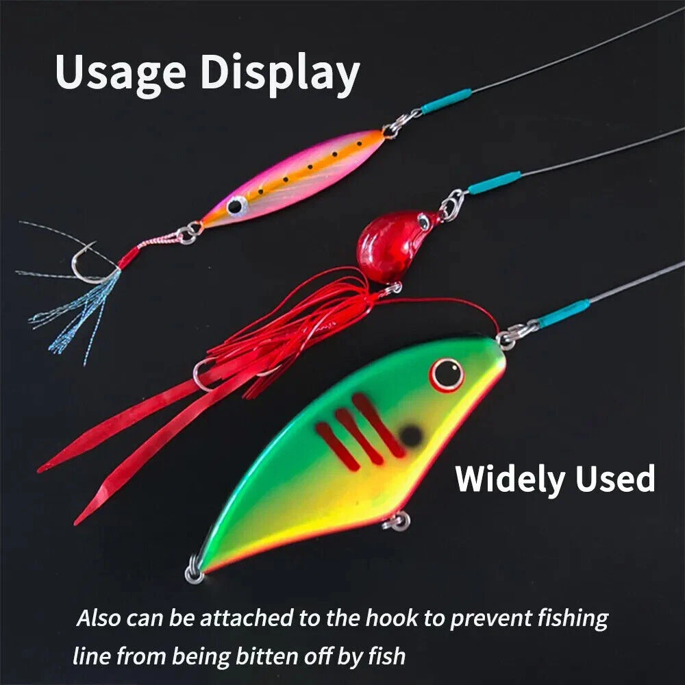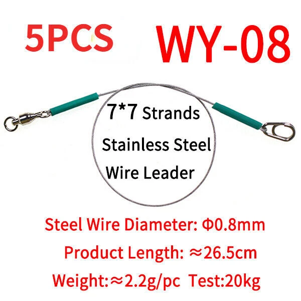 Specification: Fishing line: 7*7 strands stainless steel core leader Bearing swivels: copper alloy + stainless steel, 2# -5# Oval split ring clip: stainless steel,1# -4# 4 Sizes WY-06: φ0.6mm wire Length: ≈26.5cm/10.43in, Pulling Force: 15kg WY-08: φ0.8mm wire,Length: ≈26.5cm/10.43in, Pulling Force: 20kg WY-10: φ1.0mm wire,Length: ≈27cm/1163in, Pulling Force: 30kg WY-12: φ1.2mm wire,Length: ≈27.5cm/10.83in, Pulling Force: 40kg Packing: 5 pcs leash in one bag Feature: 1. 7*7 strands nylon coated steel wire core,soft and flexible,high strength,wear-resistance 2. 360° Rotation bearing swivel,strong tension,high speed rotation for anti- entanglement of fishing line 3. Stainless steel oval shape split ring clip for quick change 4. Inside aluminum crimps,outside heat shrink tube,more firmly joints 5. Great for saltwater fishing sharp-toothed predators 6.Can be attached to the hook to prevent the fishing line from being bitten by the fish