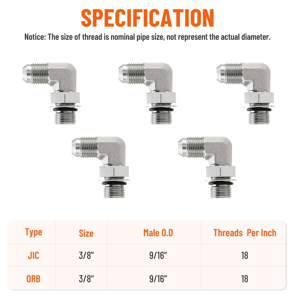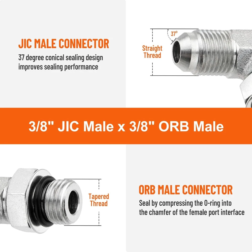 Connection Size: 3/8" JIC Male x 3/8" ORB Male UPC: Does not apply Brand: Unbranded Size: 3/8" JIC Male x 3/8" ORB Male-5 Pack Bundle Description: 5 Pack 90° Elbow Hydraulic Hose Fittings with Protection Cover Number of Pieces: 5 Exterior Finish: ‎Carbon Steel Modified Item: No Country of Origin: Unknown Feature 5: Hydraulic MPN: Does not apply Item dimensions L x W x H: 3.15 x 3.15 x 1.18 inches Custom Bundle: No Endure temperatures: From -65°F to 500°F gtin13: Does not apply Fit For: petroleum-based fluids, gasoline, fuel, and lubricating oils. Specification: 3/8" JIC x 3/8" ORB Color: Silver Application: Ideal for fluid power & hydraulic systems. Operation Type: Hydraulic Model: 90 Degree Elbow Hydraulic Hose Fittings Connector Type: Adapter Fitment Type: Direct Replacement Part Type: Hydraulic End Connectors About after-sales: Money back or replacement(Buyer's choice) Connector Type 2: Elbow Features: Easy to Install Style: Modern Material: Carbon Steel Thread Type: JIC/SAE Note: Any problem please feel free to contact us After sales guarantee: Any problem please feel free to contact us Thread Size: 3/8" JIC