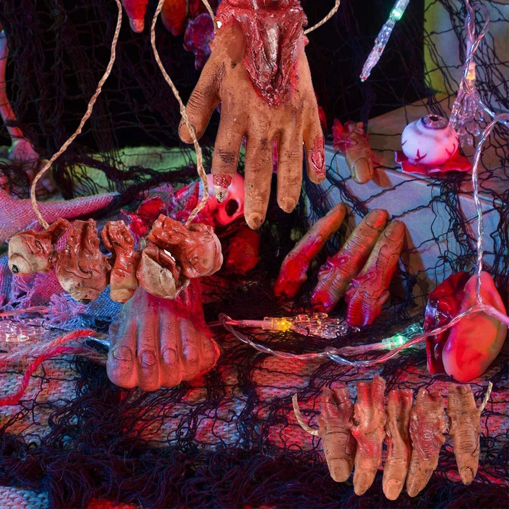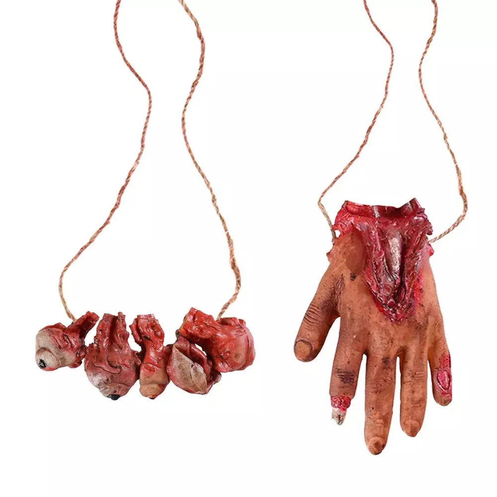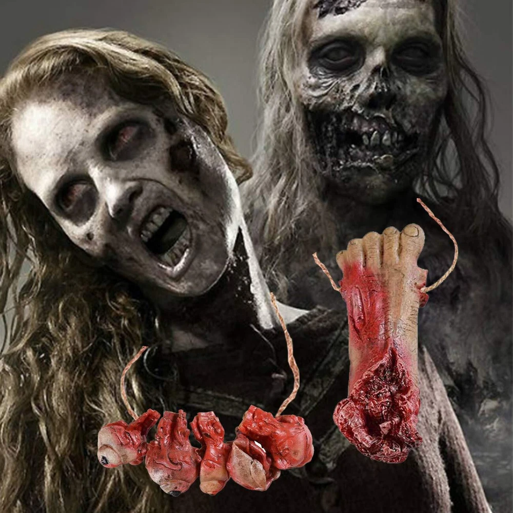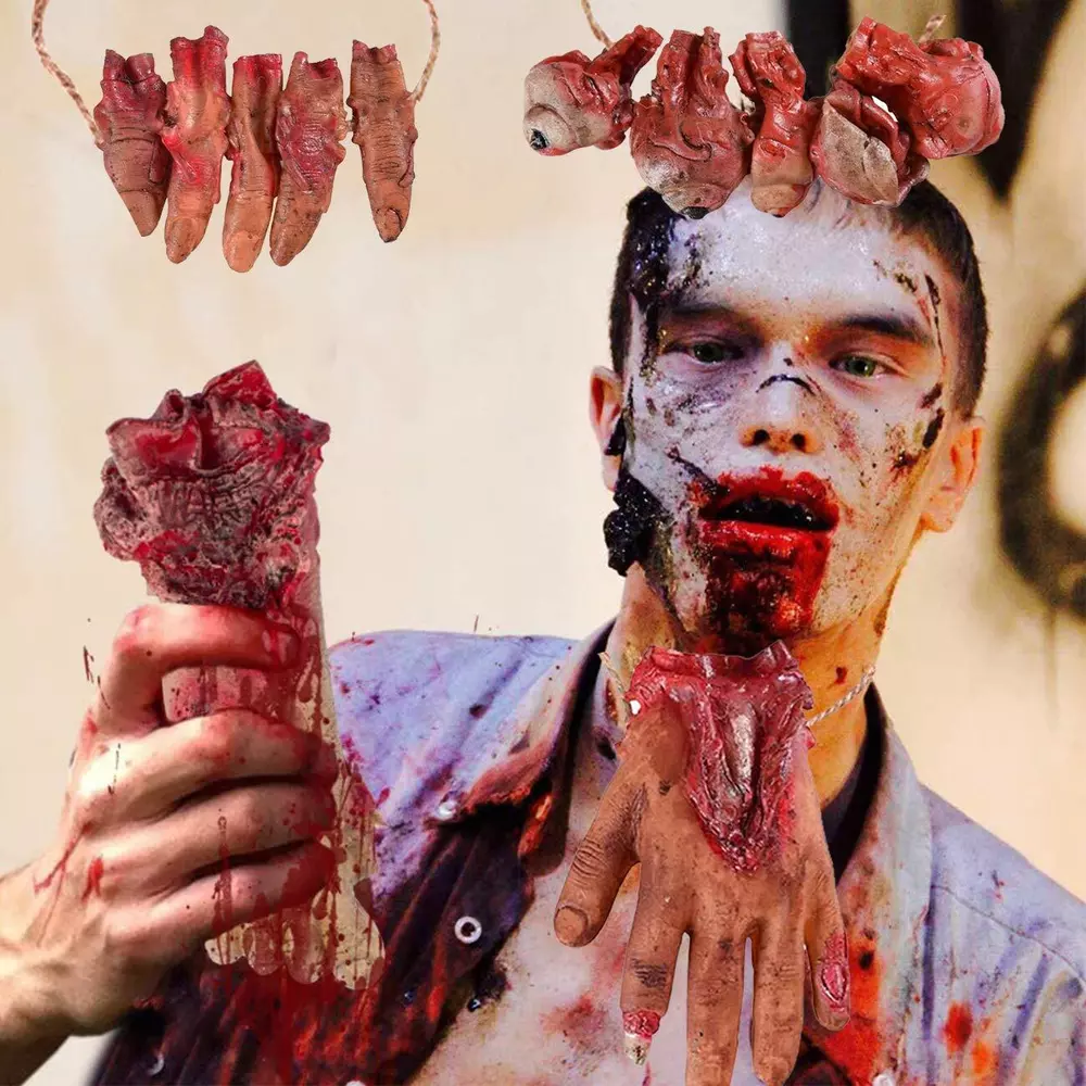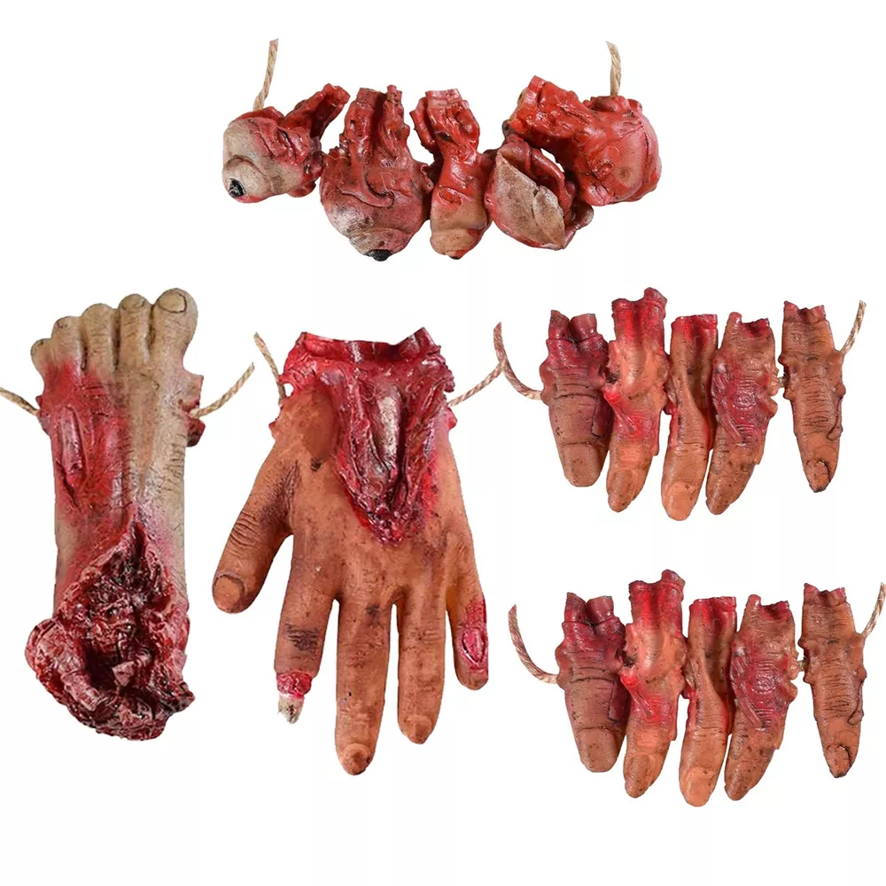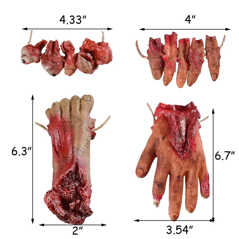 Features: Quantity: 5PCS Material: soft Latex & Environmental protection PP cotton fabric Package come with 1x fake hand(6.7 inches)/ 1x fake foot(6.3 inches)/& 1x fake eyes(4.33 inches)/ 2 x fake fingers(4 inches) Perfect for Halloween props Decoration. For decorating Kitchen, windows, walls, rooms, wall, table, yard, porch, backyard, porch, indoor outdoor Decoration, etc. Perfect for Halloween Decorations, For costume parties, Halloween decorations, homes, bars, offices, haunted houses, stage performance, spoof Tricks, magic tricks, April Fool's Day props, any other occasions. They look very realistic! That must be cool in your Halloween Party. Easy to Install: The bloody severed body part props each separate parts comes with a thick twine. You can hang them directly on the wall, door, in the hallway or on the tree. Very convenient and easy to remove them. Size: The broken hand is 6.7 inches long, the broken foot is 6.3 inches long, the broken finger is 4 inches long, and the bloody eyes are 4.33 inches. Multiple Usage: Creepy Halloween Decorations Props ,Halloween Zombie Decorations, perfect prop for Halloween party or haunted house, also great accessories for Halloween decorations and any other festive occasions. Material: The fake bloody body parts are made of soft Latex & Environmental protection PP cotton fabric, bloody human hand foot organs design, very realistic looking and life size. Halloween Trick Props: These bloody organs looks very realistic. Decorate any where of your house, and let your friends discover them inadvertently, A good choice to play joke with your friends and family.