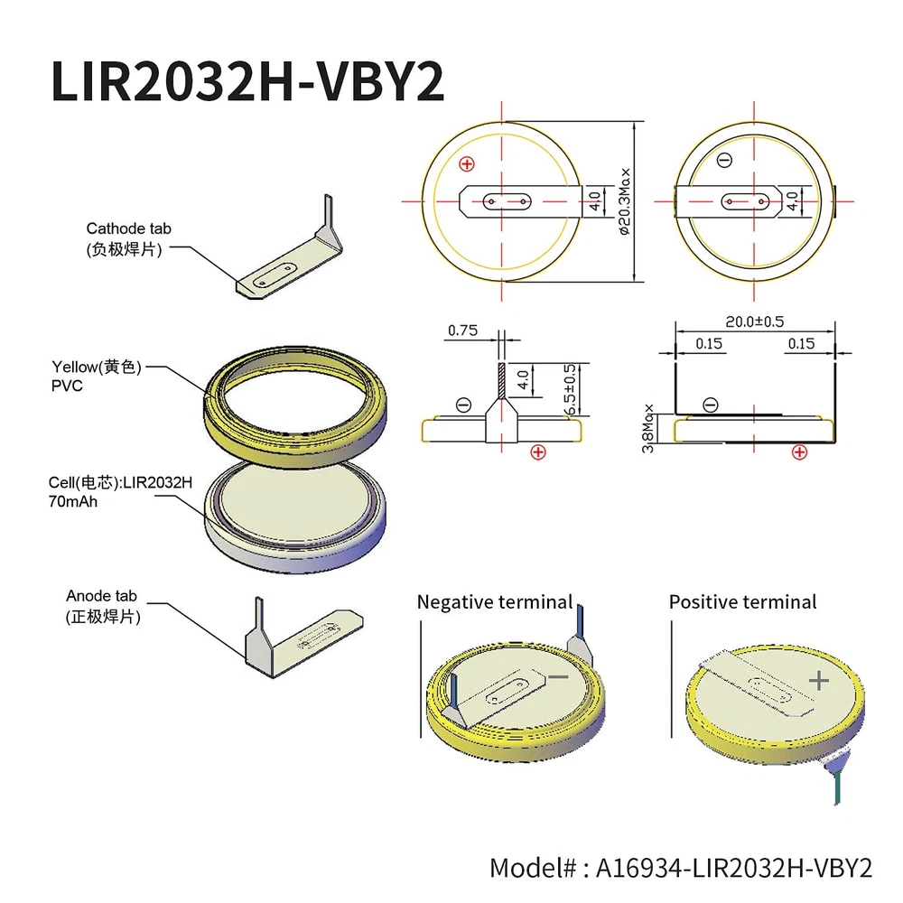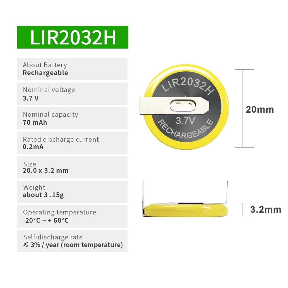 BASIC INFO—VOLTAGE: 3.7V; Capacity: 70mAh; Weight: approximate 3.15g; Diameter: 20mm, Height: 3.2mm. Packing included: LIR2032H Battery with Solder Tabs X 5 CERTIFICATIONS—Safety test by UL: IEC 62133. More than 400 battery models are UL certified. Search "MH20555" on UL for all UL certification information. QUALITY SERVICE—Manufacturer direct with local service in California. Please us if you have any questions or concerns with the product via message. We will respond to you within 24 hours. STORAGE—No leak, excellent cost performance and long cycle life. Keep the cells in 40%-60% charged state during long period storage. We recommend to charge the battery every 3 months after receipt of the battery and maintain the voltage, and the battery in a cool and dry place. Please keep out of reach of children. Do NOT SWALLOW. APPLICATION—Suitable for Computers, PDA and IC cards, electronic clocks and watches, wearable electronic devices, tracking units, monitoring units, remote control keys, digital cameras, Bluetooth speaker, RC toys.