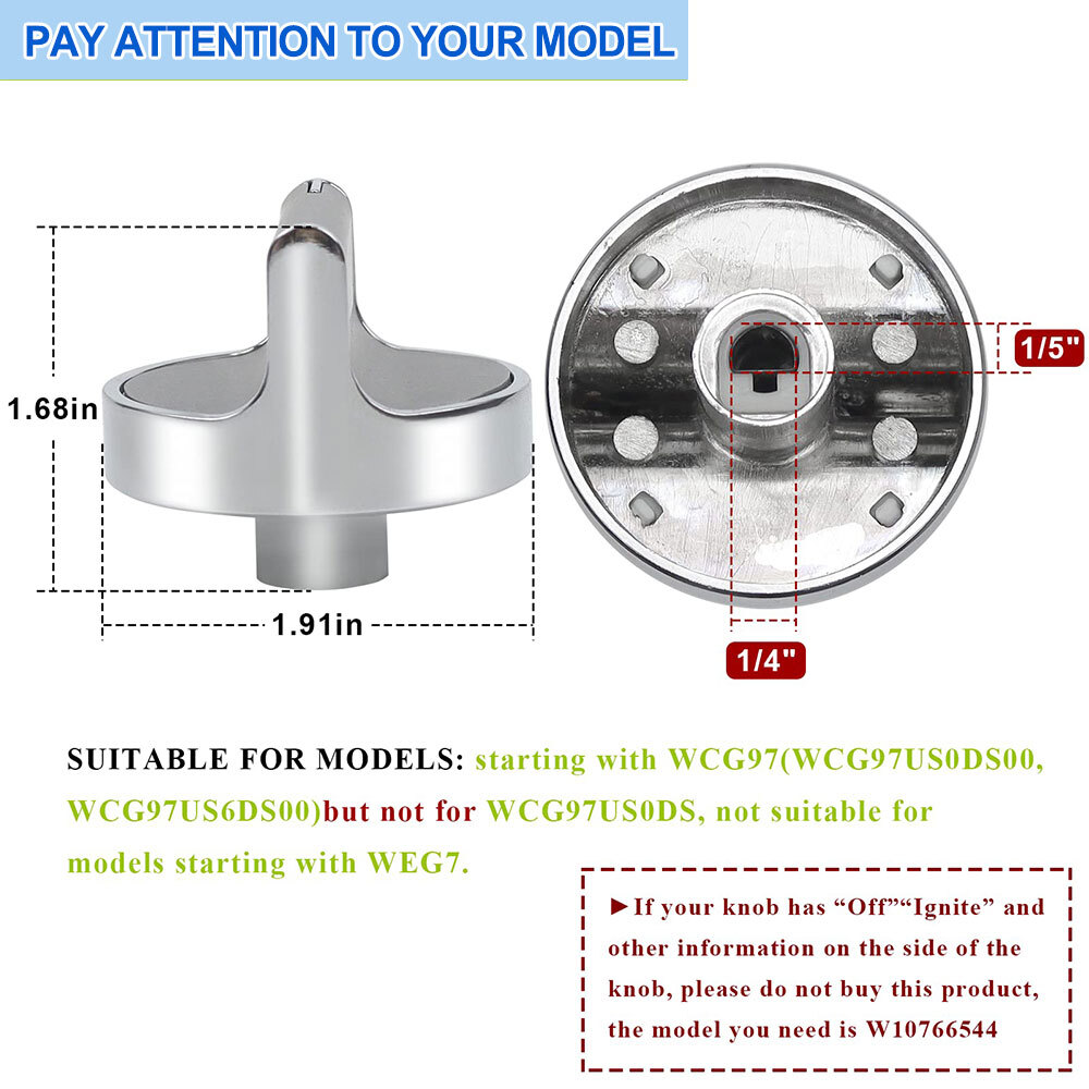 Model W10594481 Range Oven Cooktop Burner Knob W10594481 for Whirlpool WPW10594481 AP6023301 ( 5 Pcs ) Product Introduction Condition: 100% Brand New and never used Size: 1.9 inch/ 4.8 cm in diameter, 1.7 inch/ 4.3 in height Function: Burner Control/Cooktop/Stove/Oven Knobs Packa ge Includes: 5 x W10594481 Gas Range Stove Knobs FEATURES Replacements part num bers W10594481, AP6023301, PS11756643, EAP10594481, WCG97US0DS00, WCG97US6DS00, WPW10594481, AP6023301, W10594481, PS11756643, B01KR8F5EU, etc. (Notice--Not for WCG97US0DS, Not suitable for models starting with WEG7.) Fit in well to the stove, cook in com fort Great function, this range burner control knob replace your broken range knobs, save a lot of money from buying a new stov e. Upgraded & Heavy D uty Our W10594481 Whirlpool Gas Cooktop Knobs Made of high-quality stainless steel and reinforced with an aluminum ring for durability. The handle is made of matte material for easy manipulation and increased friction. Heat-resistant and tested to meet or exceed OEM specifications. Warm Note 1) After using the range, stove or cooktop every time, it is better to clean the front panel. Use wet cloth and mild soapy water or a 50/50 solution of vinegar and water. Rinse with clean water and dry with a soft cloth. 2) Don't use abrasive cleaners, strong liquid cleaners, plastic pads or oven cleaners on manifold panels. They will damage the surface of your range, stove or cooktop. Fits Models [Replaces No]: W10594481, WPW10594481, AP6023301, 3281332, W10698166, PS11756643, LW10594481, WPLW10594481, PD00034064, B081JSGJCD, B08R6327NH, WCG97US0DS00, WCG97US6DS00 [FITS Models ] : - W10594481 WPW10594481 stove konbs Compatible with whirlpool stove knobs WCG97US0DS00, - Compatible with Whirlpool cooktop knobs WCG97US6DS00 The W10594481 knob fit for some WCG97 series Gas Cooktop, But NOT fit models beginning with " WEG7" WHY OUR CUSTOMERS KEEP SHOPPING WITH US SECURE & HASSLE FREE SHOPPING All items are covered by manufacturer warranty. FAST SHIPPING Most orders ship within 1 business day! CUSTOMER SERVICE We are available 7 days a week. PAYMENT We accept Credit or debit card, Apple Pay, Google Pay, and PayPal. Payment should be completed within 2 (Two) days of auction closing. Or unpaid dispute will be filed for closing auction. Sales Tax of 9% will be applied for orders shipped within the state of California. We will leave a positive feedback immediately after payment is received. We appreciate a positive feedback as much as you do. If for some reason there is any issue with the purchase, please contact us prior to leaving feedback, and we will be glad to work with you to have it resolved. SHIPPING We will ship your item(s) within 1 working day. We send to USA , 3-7 working days. Import duties, taxes and charges are not included in the item price or shipping charges. we hope this can help you to avoid the Import duties or taxes, if you still need to pay for the Import duties or taxes; we are unable to take any responsibility for this. We do our best to offer you reliable, affordable shipping. But sometimes it is probably dependent on the express company. We only ship to the confirmed eBay address, so your delivery address must match your eBay address.