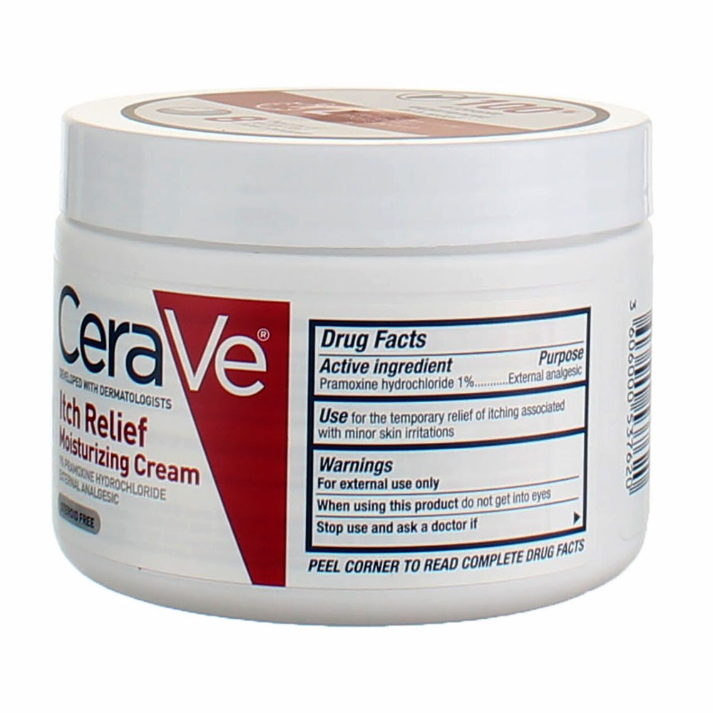 5 Pack CeraVe Moisturizing Itch Relief Cream, 12 oz Product Description Developed with dermatologists and formulated with the anti-itch ingredient, Pramoxine Hydrochloride 1%, CeraVe Itch Relief Moisturizing Cream for Dry Skin temporarily relieves itching associated with minor skin irritations, insect bites and sunburn. The product also contains three essential ceramides that helps repair and restore the skin's barrier all in an emollient based cream with a rich, velvety texture. With ceramides 1, 3 and 6-II Pramoxine Hydrochloride for itch relief Steroid-free Fragrance-free Non-comedogenic Sulfate-free Gentle, non-irritating formula Ingredients Inactive Ingredients PRAMOXINE HCL WATER GLYCERIN PETROLATUM CETYL ALCOHOL BUTYROSPERMUM PARKII (SHEA) BUTTER CETEARYL ALCOHOL PEG-100 STEARATE GLYCERYL STEARATE ISOPROPYL MYRISTATE STEARIC ACID DIMETHICONE PALMITIC ACID POTASSIUM PHOSPHATE CERAMIDE NP CERAMIDE AP CERAMIDE EOP CARBOMER BEHENTRIMONIUM METHOSULFATE SODIUM HYDROXIDE MYRISTIC ACID SODIUM LAUROYL LACTYLATE CHOLESTEROL TASMANNIA LANCEOLATA FRUIT EXTRACT PHENOXYETHANOL DIPOTASSIUM PHOSPHATE DISODIUM EDTA ALCOHOL DENAT. HYDROLYZED HYALURONIC ACID CITRIC ACID XANTHAN GUM PHYTOSPHINGOSINE ETHYLHEXYLGLYCERIN Ingredients Drug FactsActive IngredientsPurpose Pramoxine hydrochloride 1%External analgesicInactive Ingredients Water, glycerin, petrolatum, cetyl alcohol, butyrospermum parkii (shea) butter, cetearyl alcohol, peg-100 stearate, glyceryl stearate, isopropyl myristate, stearic acid, dimethicone, palmitic acid, potassium phosphate, ceramide np, ceramide ap, ceramide eop, carbomer, behentrimonium methosulfate, sodium hydroxide, myristic acid, sodium lauroyl lactylate, cholesterol, tasmannia lanceolata fruit extract, phenoxyethanol, dipotassium phosphate, disodium edta, alcohol denat., hydrolyzed hyaluronic acid, citric acid, xanthan gum, phytosphingosine, ethylhexylglycerin. Active Ingredients Pramoxine Hydrochloride Suggested Use Dosage Adults and children 2 years of age and older: Apply to affected area not more than 3 to 4 times daily.Children under 2 years of age: Consult a doctor. Instructions Adults And Children 2 Years Of Age And Older: Apply To Affected Area Not More Than 3 To 4 Times Daily. Children Under 2 Years Of Age: Consult A Doctor. Disclaimer The product descriptions and instructions provided by vitabox.com are for informational purposes only and are qualified in their entirety by the information available from manufacturers of the products. You should carefully read all product packaging, and contact the manufacturer with any questions before using a product. While we endeavor to ensure that product descriptions are current, manufacturers sometimes change their products. We are not liable for inaccuracies or misstatements about products. We do not provide medical advice or recommendations. You should not use the information provided by vitabox.com for diagnosing or treating a health problem or disease. If you have or suspect that you have a medical problem, immediately contact your health care provider. Information and statements regarding dietary supplements have not been evaluated by the Food and Drug Administration or any other government agency and are not intended to diagnose, treat, cure, or prevent any disease.