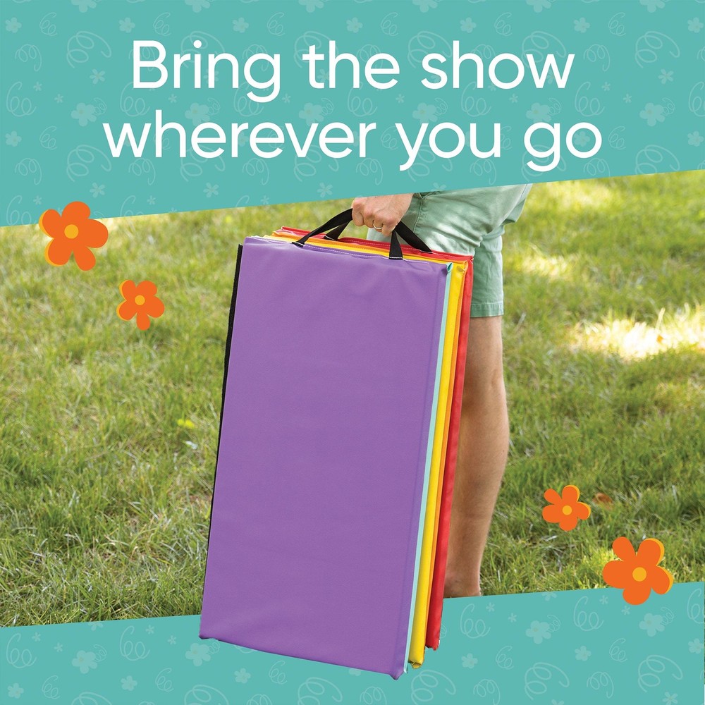 5-Panel Tumbling Mat is designed for your little one's gymnastics play world, this mat is ideal for gymnastics, yoga, pilates, stretching, and more. Its lightweight foam and vinyl design make it a breeze to set up and move around, whether indoors or outdoors. Measuring a generous 77" in height, 30" in width, and 1.25" in thickness, this mat provides ample space for children to jump, roll, and somersault. The vibrant colors not only add a touch of whimsy but also spark their imagination. The mat's attachments allow you to extend its length, making it versatile for different activities and age groups. The thick, vinyl, foam provides safe landings and soft cushioning during playtime. It's ideal for forward rolls, jumping jacks, karate practice, dance routines, and more. Practicality meets convenience with the included carry strap and handlebars, making it easy to transport and set up wherever playtime happens. The mat's leathery material and easy to grip 2 handlebars, give kids the to jump and move freely. And when playtime is over, cleaning the mat is a snap; just wipe it down with a damp cloth, and it's ready for the next adventure. Bounce Safely, Play Safely: Whether your kids are doing gymnastics, martial arts, or yoga, this colorful thick exercise mat is ideal for all athletic skills. Every corner is full of adventure and has a wide play area! Big Fun for Little Ones: With a size of 77” H x 30” W x 1.25” Th, our folding gymnastic mat gives kids plenty of space to jump, roll, and play. Also, it's lightweight and has 2 carrying handy straps, so they can take it anywhere you want! Stick and Stay: The built-in attachments let you stick multiple mats together for even more play space. Ideal for doing forward rolls, jumping jacks, somersaults, or practicing karate safely on a thick surface. A Gift Filled with Adventure: These foldable tumbling mats are ideal for birthdays, holidays, or just because you want to have fun! Ideal for kids aged 3 and up! Play inside or outside, gives kids a fun and safe space to practice. Durable & Easy to Clean: Made from strong, leathery material with lightweight foam and vinyl design, this kids' gymnastics mat is soft and tough. It's easy to wipe clean, so it stays fresh and ready for playtime.