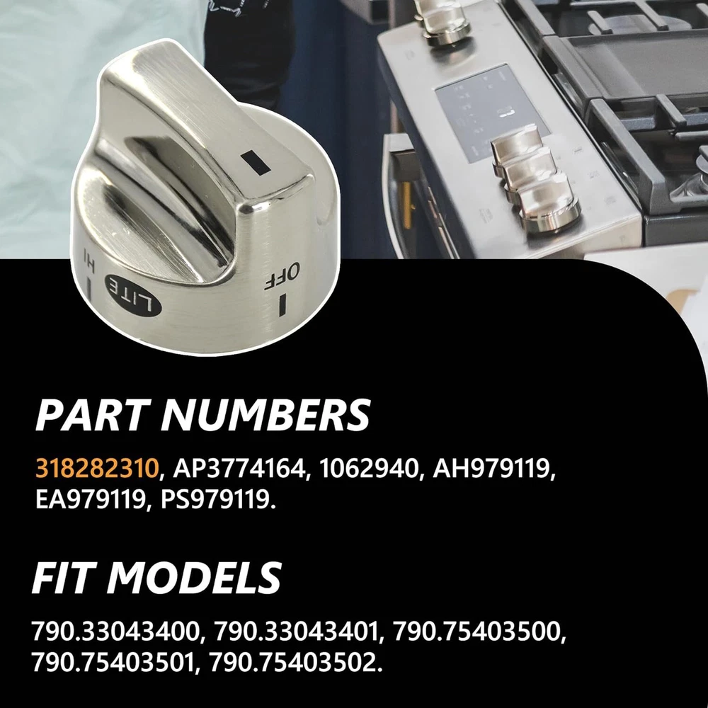 【Worth buying】Surface burner knob 318282310 lets you control the heat of the surface burner on the range. The same quality as OEM, when your knob is broken, you can buy accessories to replace it yourself, saving your money. 【Compatible Models】Replaces 1062940, AH979119, EA979119, PS979119. Applicable to the following models, not all: 790.33043400, 790.33043401, 790.75403500, 790.75403501, 790.75403502, etc. 【High Quality】Made of highly durable ABS material, rigorously tested to meet the OEM standard. Compact and sturdy, heat resistant and wear resistant. The surface is glossy. 【Easy to install】Simple and convenient installation, saving your time and money. Remove the old knob from the stove. Align the new knob holes and push them directly onto the shaft until they stop rotating. 【Buy with confidence】We provide 100% satisfied customer service, if you are not satisfied with the product, please contact us! We will reply within 12 hours to solve any problem for you. Product Description