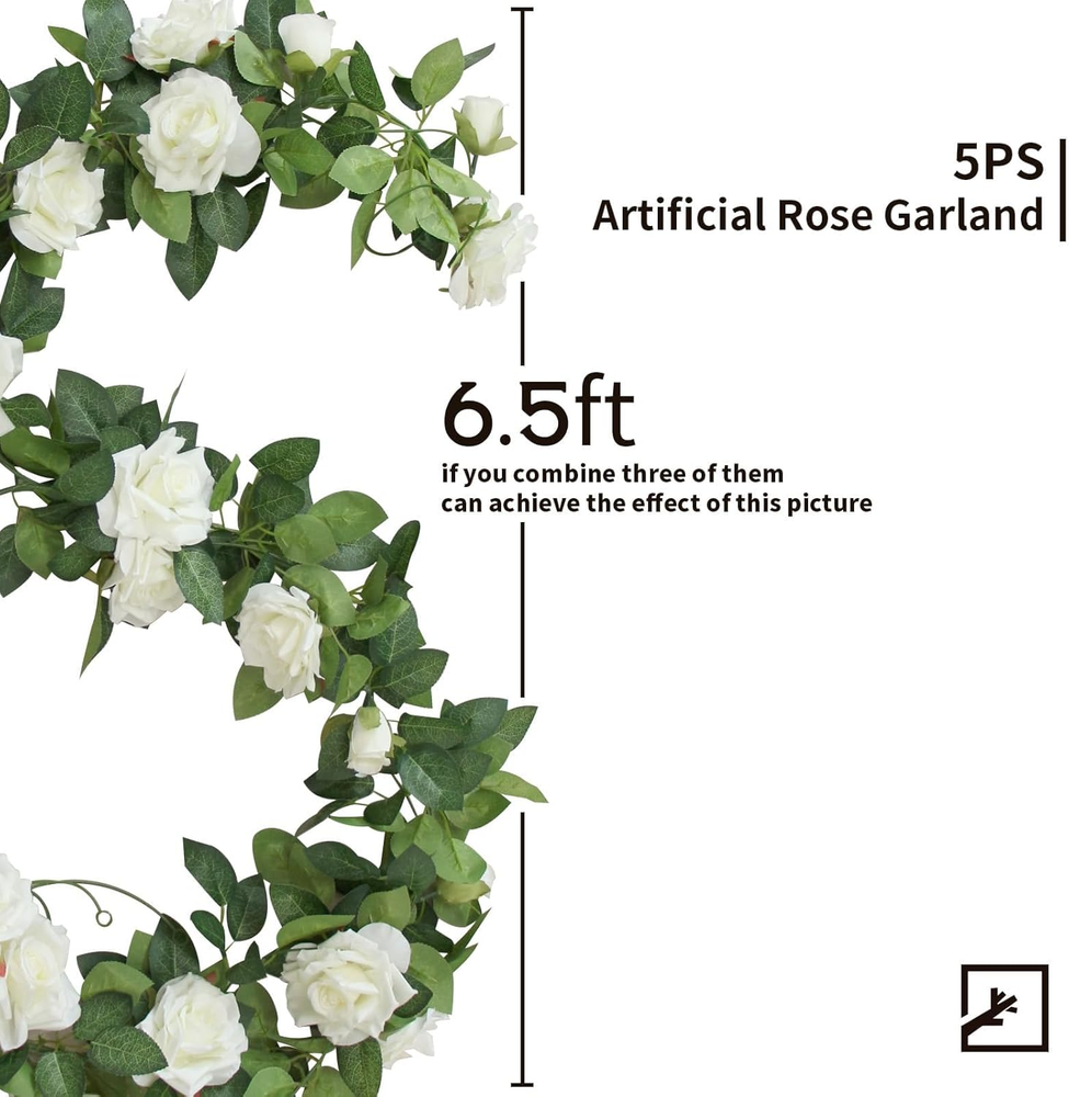 [Package]: The package includes 5pcs artificial white rose vines. Each garland with 4 rose flowers and 4 rose buds. [Size]: The length of the flower garland is about 6.5ft/2m. The diameter of each rose flower is 3.9"/10cm. [Material]: Artificial rose vine are made of high-quality safe plastic and silk. The flowers and leaves are full and lifelike. [Convenient]: Artificial floral garlands do not require much maintenance and care. Each fake flower garland has hooks at both ends for easy hanging. The flowers and leaves can be installed and removed easily. It's easy to shape into what you want. [Usage]: Our products are perfect for wedding decorations, which can decorate wedding arches, chairs, windows. Artificial rose garlands have life-like looking, vivid color, suitable for balcony, living room, cafe, staircase, office, bedroom, kitchen, outdoor, indoor etc. Product Description ARTIFICIAL FLOWERS Versatile Decoration Combine with other flowers bouquets to make a wedding bouquet Versatile Decoration Use our small pampas grass stems to decorate your party and wedding decor Versatile Decoration Our products can be used to make wreaths, wedding bouquets, wedding decorations Length and Quantity 15 IN & 36 Pcs Length and Quantity 17 IN & 6 Pcs Length and Quantity 11 IN & 30 Pcs