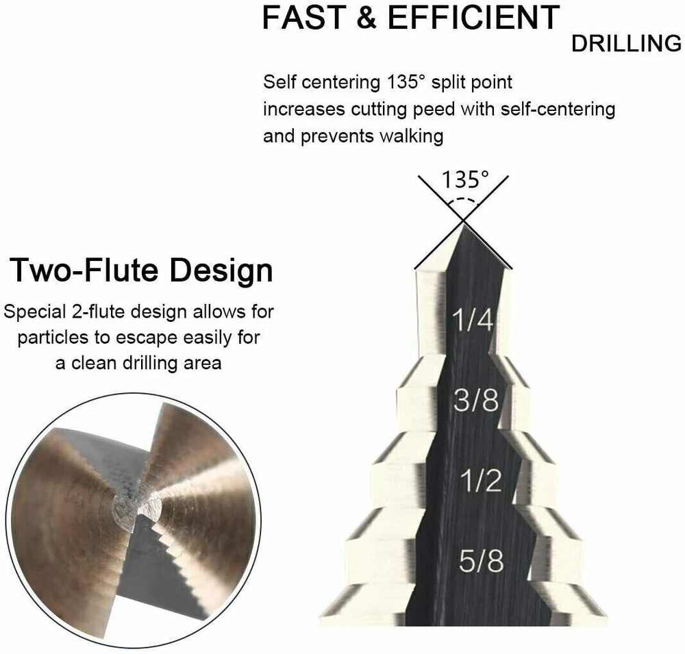 Product Description 5Pcs HSS Cobalt Hole Large Metal Step Drill Bit Set Titanium Cutter Cone 50 Size Attention: Tile glass / angle iron / site wood templates / hard iron, etc. can not drill oh! High-speed steel: can be used for about 2mm iron plate / aluminum plate, 5mm or so wood, plastic and other materials! Bearing steel: can be used for thin wood, thin aluminum, thin plastic and so on! Description This is the New HSS Steel Large Step Cone Drill Titanium Bit Set Hole Cutter, which is made from high quality HSS steel, and with the Titanium coated to reduce friction and heat. It is very suitable for using to cut holes in a variety of materials including steel, brass, wood, plastic, etc. Features - Color: As the picture shown. - Material: High Speed Steel with Cobalt Coated. - This set replaces 50 individual drill sets. - Made by Long life high speed steel. - Self starting - no need for a pilot hole. - Cobalt coated to reduce friction and run cooler. - Automatically deburrs holes as you drill. - Includes protective padded aluminum case. Specifications - 1/4'' to 1 3/8'' Drill Bit: 10 Steps (1/4'', 3/8”, 1/2'', 5/8'', 3/4'', 7/8'', 1'', 1 1/8'', 1 1/4'', 1 3/8''). - 3/16'' to 7/8'' Drill Bit: 12 Steps (3/16'', 1/4'', 5/16'', 3/8'', 7/16'', 1/2'', 9/16'', 5/8'', 11/16'', 3/4'', 13/16'', 7/8''). - 1/4'' to 3/4'' Drill Bit: 9 Steps (1/4'', 5/16'', 3/8'', 7/16'', 1/2'', 9/16'', 5/8'', 11/16'', 3/4''). - 1/8'' to 1/2'' Drill Bit: 13 Steps (1/8'', 5/32'', 3/16'', 7/32'', 1/4'', 9/32'', 5/16'', 11/32'', 3/8'', 13/32'', 7/16'', 15/32'', 1/2''). - 3/16'' to 1/2'' Drill Bit: 6 Steps (3/16'', 1/4'', 5/16'', 3/8'', 7/16'', 1/2''). Package includes 5 x Drill Bits 1 x Aluminum Case Product Highlights This set replaces 50 individual drill sets. |Made by Long life high speed steel. |Self starting - no need for a pilot hole. |Cobalt coated to reduce friction and run cooler. |Automatically deburrs holes as you drill. |Includes protective padded aluminum case. About Us Payment Shipping Returns Contact Us 1. Unless specified otherwise, all our products are IN STOCK and are shipped from USA Local warehouse - Not Overseas! 2. We provide a 30 day Satisfaction Guarantee or your money back (provided items are in the same new and resaleable condition.) 3. We have a PayPal Verified Business Account, please buy with Confidence! 4. Every item will be tesrted before send.We know our products well and if we don't have the answers we will do our best to find them for you! 5. Our friendly team look forward to serving you! Your satisfaction is our No.1 Priority We will do our best to satisfacy you. 1.Paypal, Credit Card, G Pay etc, many payment way is accepted. 2.Please be sure your shipping address is correct before make a payment. 1.We will ship out the item within 1-3 business days after comfirming the payment, appreciate your patience. 2.If the items are broken on the way(we will check the orders clearly before we sent them),please contact us in 3 days you received it. We will send you a new one or refund your payment. 1.We stand behind every buyer.Items can be returned for exchange or refund within 30 days. 2.Please contact us when you have any confusion of our item, we will solve the trouble for you as soon as possible. 1.This is professional Seller.We will reply your message within 24 hours. 2.Please contact us whenever you have any question about the item. We will deal with it as soon as possible. 3. If you are unhappy with the item or our service,please Contact Us before leave feedback,just give me a chance,thank you! About Us 1. Unless specified otherwise, all our products are IN STOCK and are shipped from USA Local warehouse - Not Overseas! 2. We provide a 30 day Satisfaction Guarantee or your money back (provided items are in the same new and resaleable condition.) 3. We have a PayPal Verified Business Account, please buy with Confidence! 4. Every item will be tesrted before send.We know our products well and if we don't have the answers we will do our best to find them for you! 5. Our friendly team look forward to serving you! Your satisfaction is our No.1 Priority We will do our best to satisfacy you. Payment 1.Paypal, Credit Card, G Pay etc, many payment way is accepted. 2.Please be sure your shipping address is correct before make a payment. Shipping 1.We will ship out the item within 1-3 business days after comfirming the payment, appreciate your patience. 2.If the items are broken on the way(we will check the orders clearly before we sent them),please contact us in 3 days you received it. We will send you a new one or refund your payment. Returns 1.We stand behind every buyer.Items can be returned for exchange or refund within 30 days. 2.Please contact us when you have any confusion of our item, we will solve the trouble for you as soon as possible. Contact Us 1.This is professional Seller.We will reply your message within 24 hours. 2.Please contact us whenever you have any question about the item. We will deal with it as soon as possible. 3. If you are unhappy with the item or our service,please Contact Us before leave feedback,just give me a chance,thank you! You may also like 65W USB C Type C for Acer Chromebook Lenovo/HP/Asus/Samsung Power Laptop Charger 8.99 USD Free shipping 3 Head 50000LM LED Solar Lights Outdoor Waterproof Motion Sensor Security Lamp 13.29 USD 13.99 USD Free shipping 5% off Titanium Cutting Board Double-Sided Titanium Cutting Boards for Kitchen Camping 15.99 USD 22.59 USD Free shipping 29% off 9PC ABS Socket Organizer 1/2 3/8 1/4 inch Drive Socket Rail Holders Wall Mount 16.99 USD 18.49 USD Free shipping 8% off 2300W 4 Gauge Car Audio Cable Kit Amplifier Install Amp RCA Subwoofer Sub Wiring 14.99 USD Free shipping 8"x12" Vacuum Sealer Bags Embossed Food Saver Magic Seal Storage 100-500pcs 12.5 USD 13.89 USD Free shipping 10% off powered by