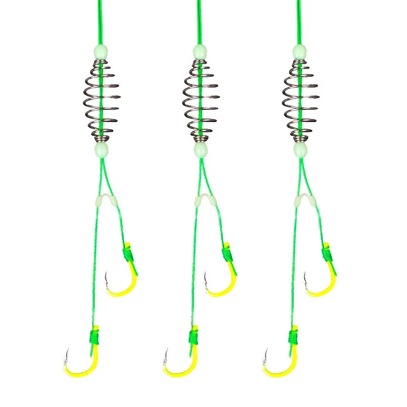 Description: Product name: Fluorescent anti-winding spring fish hook Sports outdoor items: fishing Fishing hook type: spring hook Configuration: spring, space bean, Isen fish hook with tube Features: Sharp hook tip, quick puncture, high strength, anti-oxidation, hand-tied system, enhanced anti-winding performance. Size: No. 13 fish hook about 11.1*21.5mm Material: silicone, high carbon steel, PE wire, EVA wire board Quantity: 5 pieces/board Instructions: 1. Take appropriate amount of bait and place the spring in the middle of the spring. 2. Slightly knead, so that the bait is attached to the spring, and the rod will not fall off. 3. After attaching the bait, you can go fishing. The package includes: 5*spring hook 1*Line board
