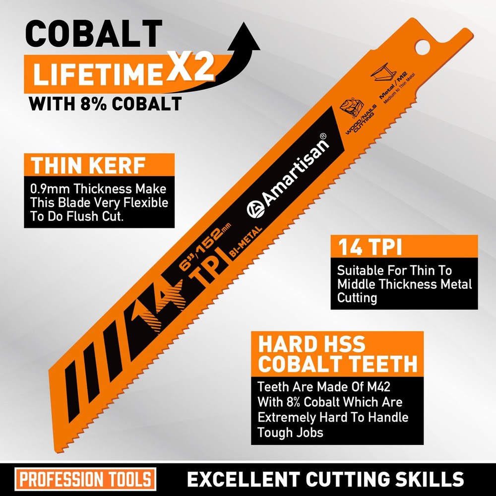 Bi-Metal Reciprocating Saw Blade PRACTICAL SET COMBINATION: It contains 5 pieces of 6-inch 14TPI saw blades, which can meet the needs of multi-scene cutting. There is no need to purchase separately frequently, saving you time and cost. Whether it is professional work or home DIY, it can provide sufficient spare options. HIGH-QUALITY BI-METAL MATERIAL: Made of high-quality bimetal, it has both high hardness and good toughness, excellent heat and wear resistance, can withstand long-term high-intensity cutting, effectively extend service life, and ensure stable cutting performance. EFFICIENT CUTTING PERFORMANCE: 14TPI (number of teeth per inch) design with sharp tooth shape, accurate cutting and fast speed, can easily cope with a variety of materials such as metal sheet, metal pipe, etc, especially suitable for cutting medium-thickness materials, reduce caton and vibration, and improve operating efficiency. WIDELY COMPATIBLE AND ADAPTABLE: It has a universal installation design, compatible with most reciprocating saws and other tools on the market, easy to install and fast to switch, no need to worry about adaptation issues, and make your cutting operation smoother. INTIMATE PACKAGING DESIGN: Equipped with sturdy packaging, easy to and carry, it can effectively protect the saw blade from damage during transportation and storage, ensure that it can be kept in good condition every time it is accessed, and enhance the user experience.