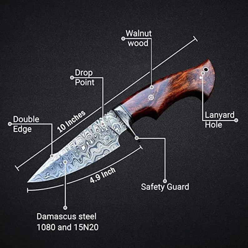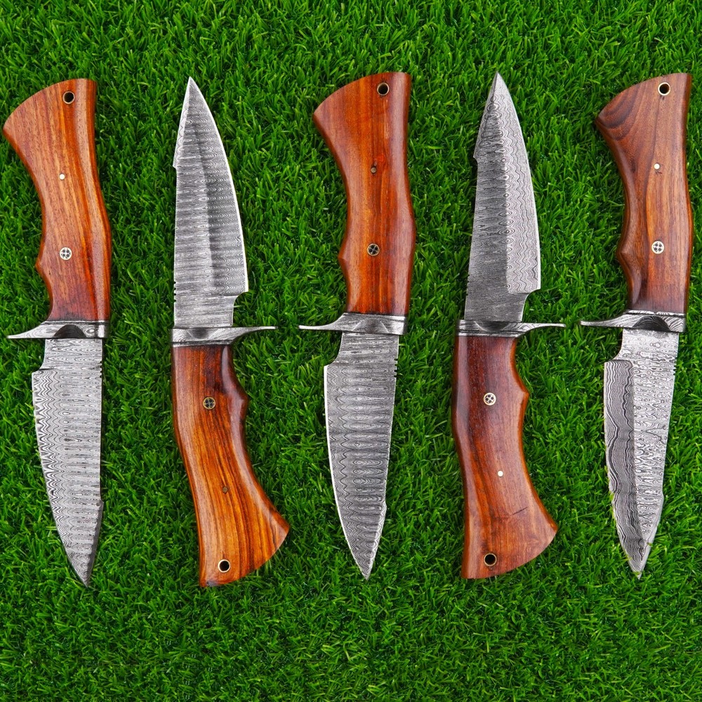 5 Piece Hunting Knife Damascus Steel Full Tang Fixed Blade Camping Knife Looking For An Unusual Hand Crafted Hunting Knife? Here It Is! A Compact Outdoors Hunting Knife, Classic Bowie Hunting Knife Custom Hand Forged High Quality Damascus Steel Hunting Knife , Easy-To-Carry, Beautiful Hunting Knife, And Made Of Powerful Damascus Steel. We Take Great Pride In Creating By Hand, Our Hunting Knife Crafted With Damascus Steel Wooden Handle The Highest Quality Materials. Our Bowie Hunting Knife Is Also Designed To Be Used As An All-Around Tool For Camping, Hunting, Fishing, And Other Outdoor Activities. Crafted With Precision And Designed For Durability, Best Hunting Knife. This Hunting Knife Is The Perfect Companion For Any Hunting, Camping, Or Survival Adventure. Here's Why You'll Love It: Premium Quality Innovative, Traditional, Precise Ergonomic Handle, With Classic Look Easy To Clean, Very Hygienic Custom Handmade Stainless Steel Blade User-friendliness Best Gift For Your Love Once & Hunter Friends. High Quality Hunting Knife Which Can Be Used For Camping. Damascus Steel Hunting Knife, Wood Handle, With Leather Sheath. PRODUCT SPECIFICATION Blade Length: 5.0 (Inches) Handle Length: 4.7 (Inches) Overall Length: 10 (Inches) Handmade Leather Sheath Included High Quality Materials for Durability Fully Handmade Item, No Pre-Bought Parts RESTRICTION You Must Be Over 18 Years Of Age To Purchase These Products, The Buyer is Fully Responsible For Local Laws And Regulations Concerning the Purchase And Possession Of Knives, Swords, And Other Cutlery Tools, By Making A Purchase You Are Confirming Our Age Policy. HAVE A SAFE SHOPPING PLEASE LEAVE A HONEST REVIEW