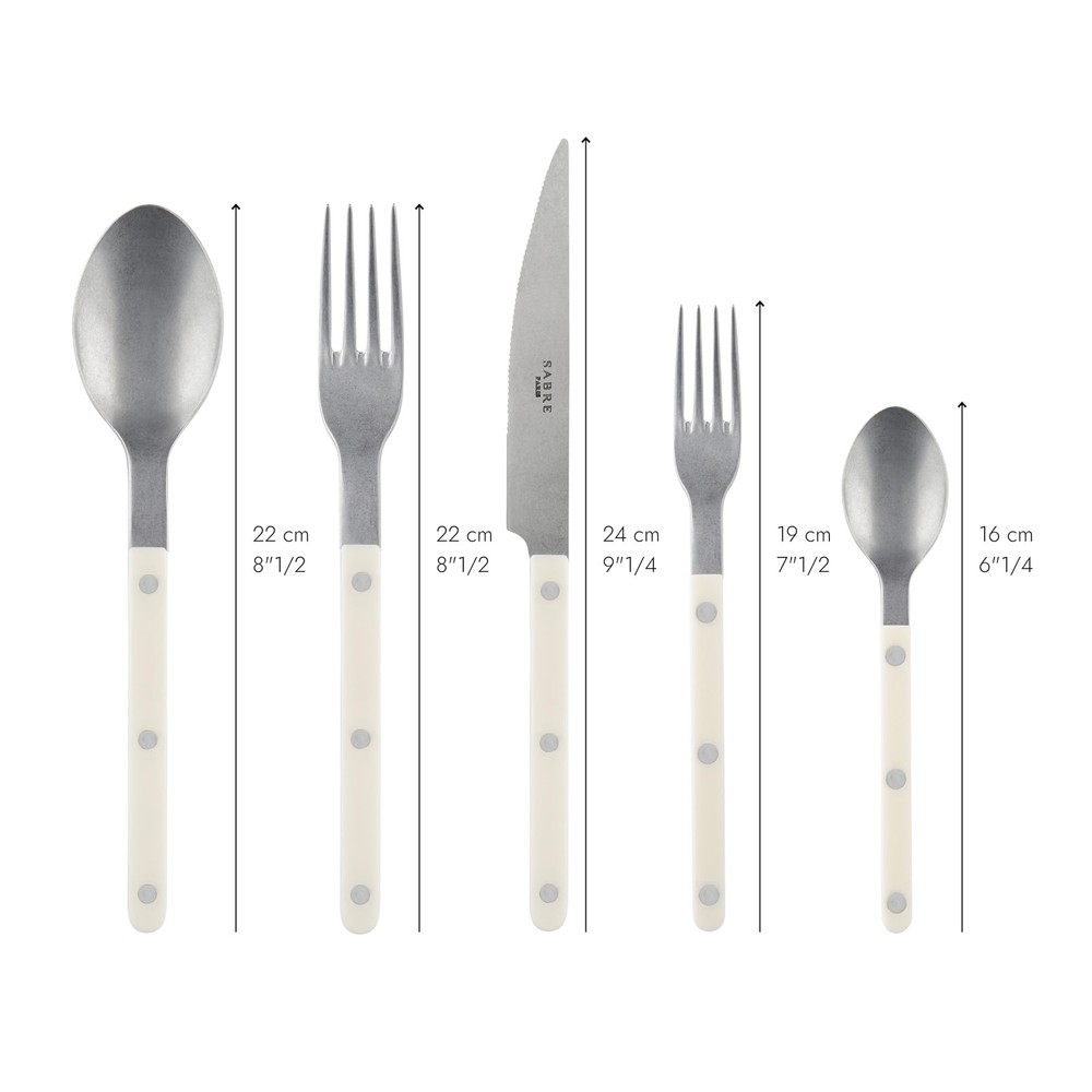 With the Bistrot collection, we drew inspiration from the places we adore: our restaurants, terraces, and cafes. When designing these cutlery pieces, our aim was to stay true to tradition while embracing modernity. The lines are simple, the rivets are present, and an array of colors and materials are incorporated. From vibrant red to soothing blue, with materials featuring horn or scale-like effects. Available in both glossy and vintage finishes, we are confident you will appreciate this collection, as we intended it to be both authentic and contemporary. The Sabre 5-Piece Set is your fundamental ensemble for assembling your tableware. It consists of a soup spoon, a table fork, a table , a teaspoon, and a dessert fork. 5-PIECE CUTLERY SET: Composed of a 9.4" , an 8.6" fork, an 8.6" soup spoon, a small 6.2" dessert fork, and a small 6.2" teaspoon, this silverware set is the essential combination for your daily meals. STAINLESS STEEL FLATWARE: This set combines a beautiful play of premium materials with cutlery crafted from 18/10 stainless steel, boasting a vintage finish, and handles made of nylon. The blade is made of AISI 420 steel. DISHWASHER-SAFE AND MORE: Enjoy a tableware set that is incredibly easy to maintain as it is dishwasher-safe and from Bisphenol A, per the law 2012-1442. It will serve you well for many years! BISTROT COLLECTION: Inspired by the places we cherish: restaurants, terraces, and cafes. With its sleek design, 3 stainless steel rivets, and a wide array of colors and materials, this collection exudes both authenticity and modernity. FRENCH SAVOIR-FAIRE: is a French brand of handcrafted tableware, showcasing the artistry of French craftsmanship. Our cutlery is proudly made in France, crafted at our workshop in the Parisian region.