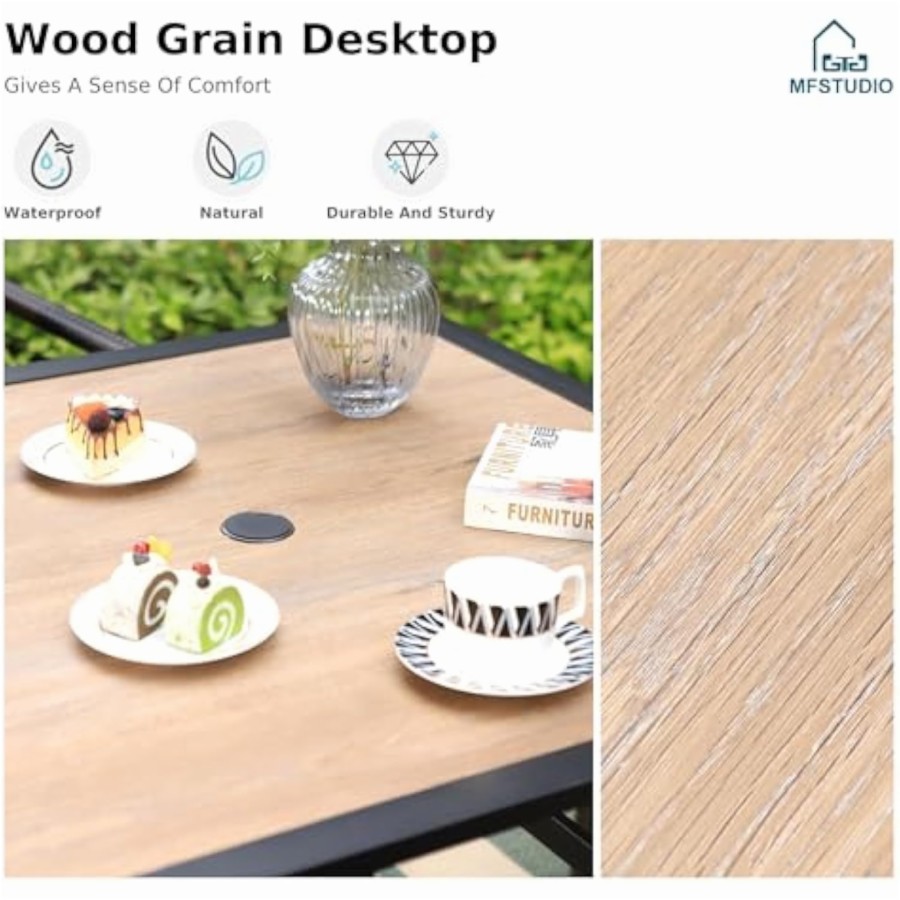 This patio dining set is a fantastic addition to any outdoor space! The heavy-duty black steel frame is both elegant and durable, with an e-coating that resists weather damage. The wood-like table is easy to clean and has a handy umbrella hole. The ergonomic rattan chairs are comfortable, fade-resistant, and feature a sturdy steel frame. Perfect for relaxing or entertaining guests—great value for the price!