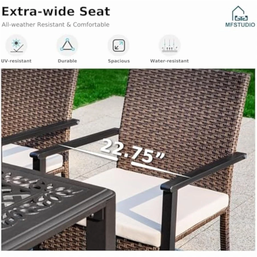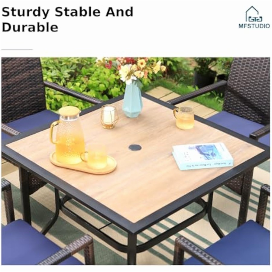 4 Person Patio Table - Heavy-duty elegant black steel frame, with e-coating for weather resistant and longevity, which makes wood-like table needs no special and easy to clean. With umbrella hole (1.57''), the metal dining table is fully capable of bearing the weight of most umbrellas Ergonomic Chairs - Boasting weather and fade resistant rattan, chairs features streamlined backrest, which provides optimal relaxation. Steel frame with crossed bottom construction ensure sturdiness of the dining chair. Detachable Sponge-filled cushion with water-resistant fabric for easy clean and maintain Dimension - Table Size: 37"L x 37"W x 28"H, Diameter of umbrella hole: 1.57". Chair Size: 21.5"D x 22.4"W x 34.5"H, Weight Capacity of each chair: 300 lbs What We Offer - 5 pieces outdoor dining set is easy to install. All necessary accessories and instructions with detailed steps are included. lf you have Any question our experienced customer service team will response in 24 hours..