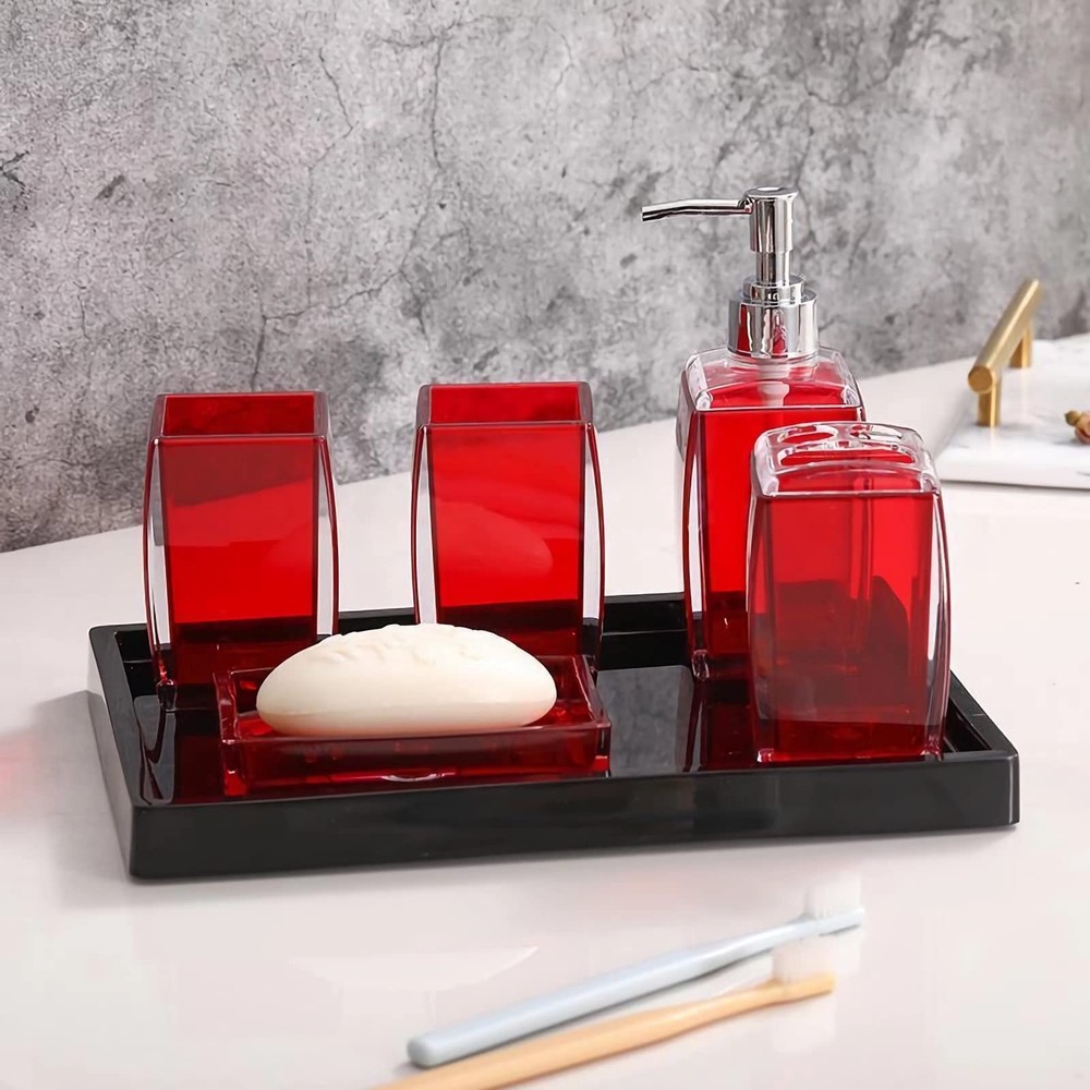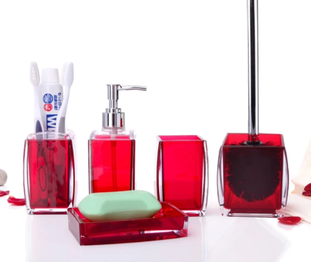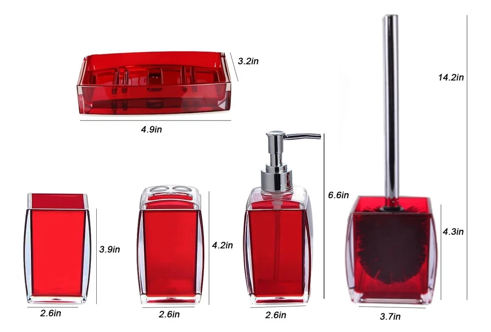 Luxury Premium Craftsmanship Our bathroom accessory set is made of a top-grade acrylic material, which is stronger and more durable than glass and ceramic, that inhibits water damage, leaks. A breeze to polish, just wipe its surface using a clean damp cloth. We masterfully created each of our products with user satisfaction and durability in mind, so you can purchase in confidence. ★【FULLY FUNCTIONAL COMPLETED SET】:Red Bathroom Accessory Set Include toothbrush holder, toothbrush cup, lotion dispenser, soap dish, toilet brush set which equips everything you will need to organize your toiletries. ★【ELEGANT DESIGN】:Unique, visually-appealing design complements any bathroom decor.Take your bathroom decor to stylish new heights with this modern bathroom accessory set, very stunning and a great touch of extra elegance to the bathrooms. ★【DURABLE and AMAZING QUALITY】:High gloss, stylish, functional , durable ,easy to clean. Our high quality acrylic bathroom accessories set will resist to constant use, keeping their look just as elegant and new over time. ★【PERFECT GIFT SET】: Black bathroom soap dispenser set is the perfect gift for your friend, family, business partner or anyone who wants to equip their bathroom with a set of practical accessories.Bathroom toothbrush holder set is a wonderful house warming present. ★【Bathroom Decor】: Outfit your new bathroom or upgrade your current bath accessories sets for bathroom. Use all the items together in your bathroom, dresses up your room nicely. ★【Please Note Package Box】:Please open the clear set box,the product inside the box is the one you purchased.