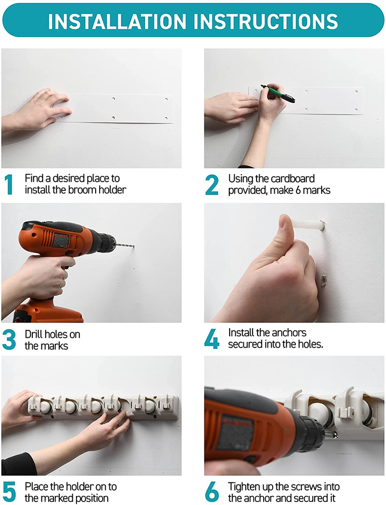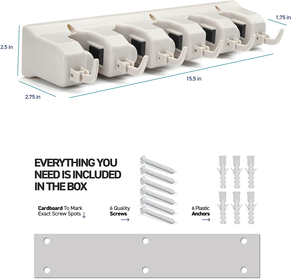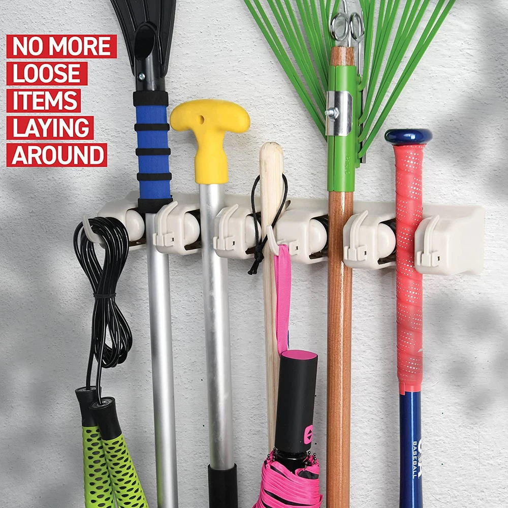 plastic Imported Versatile Broom Holder Wall Mount - Keep your cleaning tools neatly stored and accessible with this mop and broom holder! It also works great as a garage organization and garden tool storage solution. Easy To Mount Garage Storage Solutions - Included with the garage organizers are screws, anchors, a drilling template, and a guide–everything you'll need to mount this mop hanger indoors or outdoors! Durable Garage Shelving - Our broom and mop storage rack can hold up to 11 tools and every slot can support up to 7.5lbs. Our garage storage racks have a total load-bearing capacity of 38lbs. Secure & Easy To Use Garden Tool Rack - The 5 slots have an easy-release design for quick retrieval. They're non-slip, have soft rubber grids, and are strong enough to hold wet mops and baseball bats. Organize Your Space - Aside from cleaning tools, our mop holder wall mount can also hold everyday household items. Free up floor space in your home by hanging up your umbrellas, shopping bags, or coats! A "wall" organizer designed to hold various household objects with handles of varying thickness. Simply insert a handle into a slot and a rounded, gravity controlled, rolling ball automatically adjusts to the handle's thickness and grips it securely. Use in the laundry, garage, garden, utility room, offices, and more. Plastic Mop, Broom, and Long-Handled Tool or Sports Equipment Holder System-Mount on the Wall in Your Home's Kitchen or Garage - Hang Items Securely- Great Storage Idea for Staying Organized-Best Lifetime Guarantee. BR BR titular de la escoba.