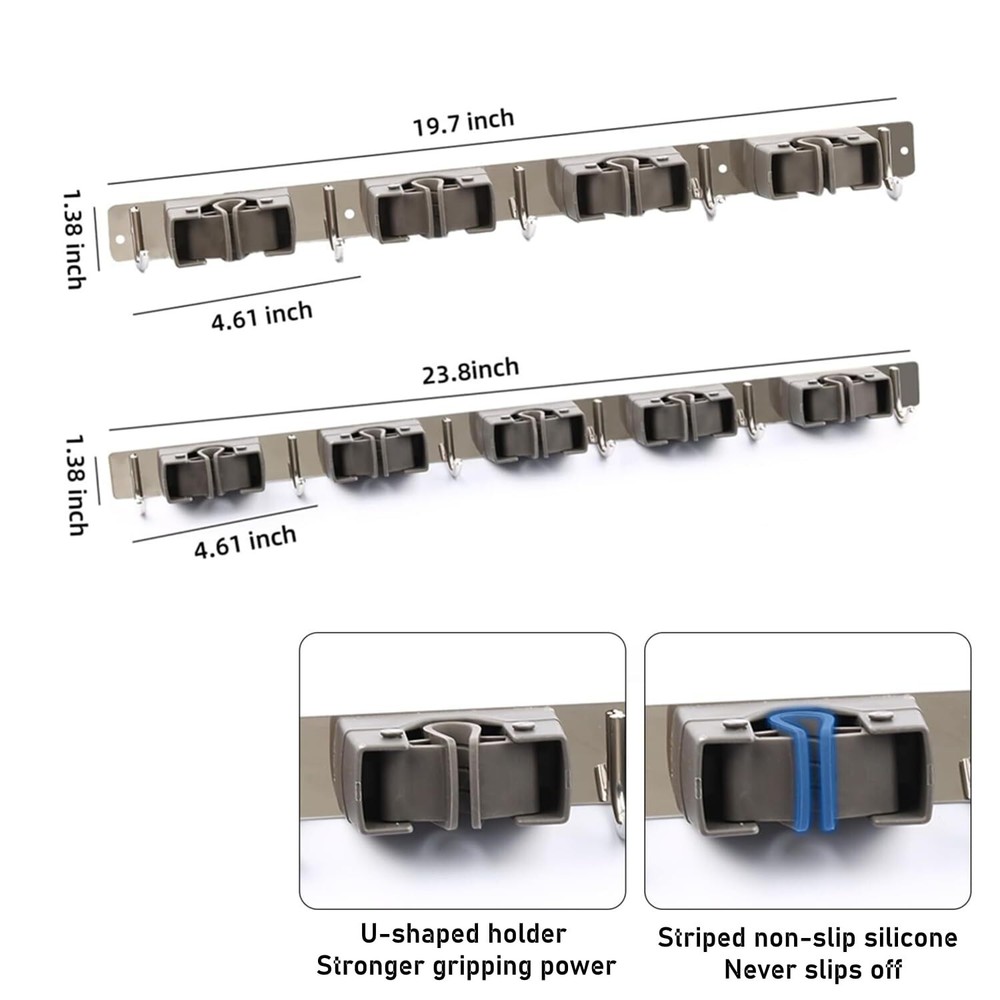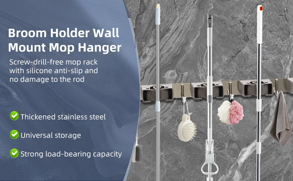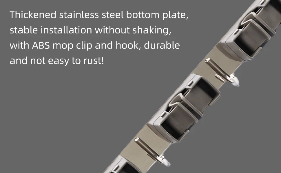Features: Material:Stainless Steel Color: Black,White Special features:Lightweight, Rust Resistant, Scratch Resistant Product Dimensions:17.32"D x 1.96"W x 2.36"H Shelf Type:Hanging Shelf Number of Shelves:1 Room Type:Garage, Laundry Room, Bathroom, Kitchen, Living Room Assembly Required:No Mounting Type:Wall Mount Included Components:Hardware, Add-on Units Item Weight:1.3 pounds Key Features: Organizing & Saving Space: Keep your garage or laundry room organized and tidy immediately after using this broom and mop organizer wall hanging, it is designed with 5 racks and 6 Hooks/ hangers and can organize your brooms, mops, rakes, garden or garage tools and other accessories, all your tools won't disorderly stacked on the ground or in a corner of your house, save great space Unmatched Strength & Durability : Constructed from high-grade 304 stainless steel, the broom holder is designed for longevity. It’s corrosion-resistant, waterproof, and boasts a substantial 30 lbs load capacity. Equipped with non-slip silicone and double rubber gripped slots, the Mop and Broom Holder Wall Mount ensures tools are held firmly in place Easy Installation: The mop and broom organizer offers two installation methods for versatility. Utilize the self-adhesive feature for smooth surfaces or opt for screw drilling for uneven walls. Suitable for both indoor and outdoor applications, the wall mount adapts to your needs Versatile Storage for Broom Storage System: Designed with multifunctionality in mind, the broom storage system is perfect for a variety of items, including brooms, mops, rags, brushes, gloves, and even baseball bats. Ideal for kitchens, bathrooms, garages, and outdoor sheds Heavy-Duty Organization with Mop Holder: Achieve a perfectly organized space with mop holder, providing a secure, no-slip grip for up to 11 tools. Invest in this heavy-duty organizer to transform your area into a well-organized haven