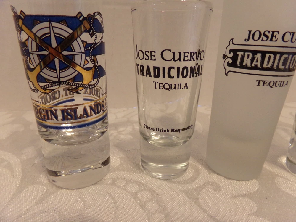 UP FOR AUCTION ARE 5~SHOT GLASSES ~4~JOSE CUERVO TEQUILA TRADICIONAL & VIRGIN ISLANDS, ST. CROIX. THEY ARE 4 1/2" TALL....IN GREAT SHAPE... P LEASE CHECK OUT THE PICTURES...... I DO HAVE MORE THAT I WILL BE LISTING....THE BIG ONES & SMALL ONES TOO..... THANKS FOR LOOKING ! ! ! ! ! I COMBINE SHIPPING ! ! ! ! ! ! JUST REQUEST THE TOTAL WHEN YOU ARE ALL DONE SHOPPING! ! ! ! ! ! ! ! Check out my other items !