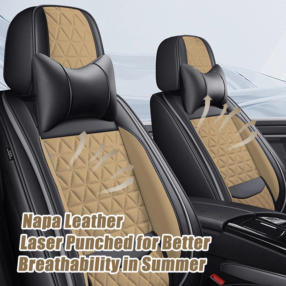 Bullet Points: Unmatched Experience: With excellent abrasion resistant and a delicate touch, our car seat cover set is made of Nappa leather, offering good breathability. It promotes the class of your car while providing an unparalleled comfortable experience for driver and passenger alike Extended Service Life: With a perfect contour fit and 360 Degree Full Surround Design, our car seat cover leather full set prevents edge-wearing and provides a stable and secure ride experience. The bilateral embracing wings also extend the service life, ensuring long-lasting protection Enhanced Waist Support: Special upgraded fixed waist dependency design, stable and not shifting, alleviates the waist pressure by long-term driving or riding, adjustable height and angle to meet the needs of different drivers and passengers, making your journey easier and pleasant Breathable Comfort: Enjoy a cool and comfortable drive with our car seat cover's optimized punching technology, designed to maintain your safety and breathability. Made from excellent leather, it provides a sleek and sturdy design with anti-slip backing Simple and Stylish: Effortlessly install our full set of leather car seat covers, available in a variety of stylish colors. Equipped with all accessories and designed for comfort, this is the ideal choice for a luxurious four-season driving experience This car seat cover leather full set is designed to cater to the needs of different drivers and passengers. Its 360 Degree Full Surround Design ensures complete protection for both the driver and passenger. The cover is made using high-quality materials and advanced punching equipment. It comes with a full set of accessories for easy installation. Specification: Product Name: car seat cover leather full set Color: black and white, black and red, black and blue, beige Material: Nappa Package method: all-inclusive Suitable models: 5-seater models such as cars and SUVs; Style: Simple and comfortable Suitable for season: four seasons Packing List: Seat covers x5 Heads cushion x5 Headrest x2 1 pack of fixed buckles (18 buckles, 8 buttons) Notes: 1. Due to different lighting and screen settings, the item color may be slightly different from the picture. 2. Due to different manual measurements, please allow a 1-2cm difference in size.