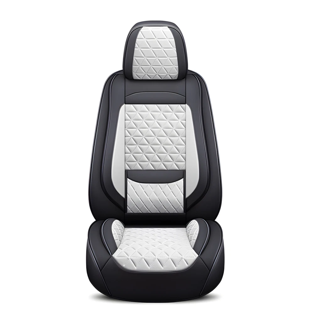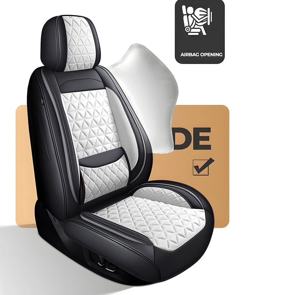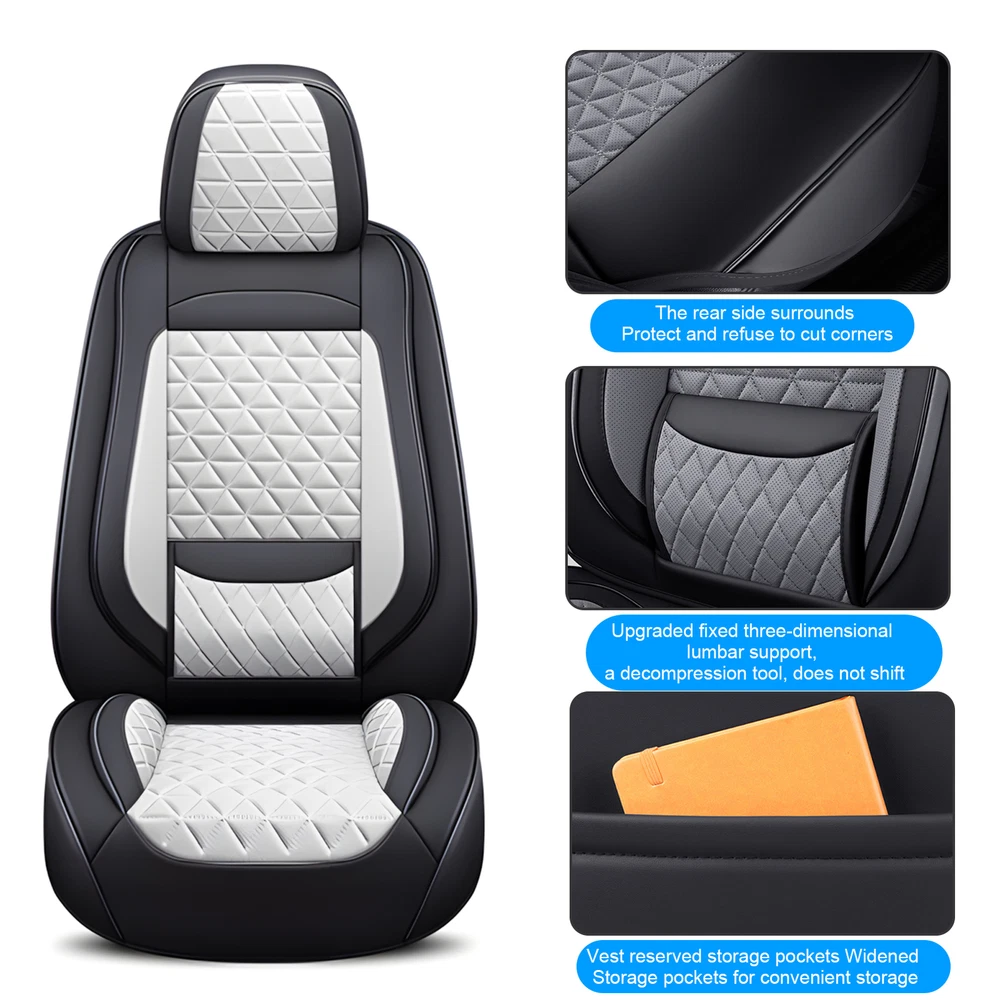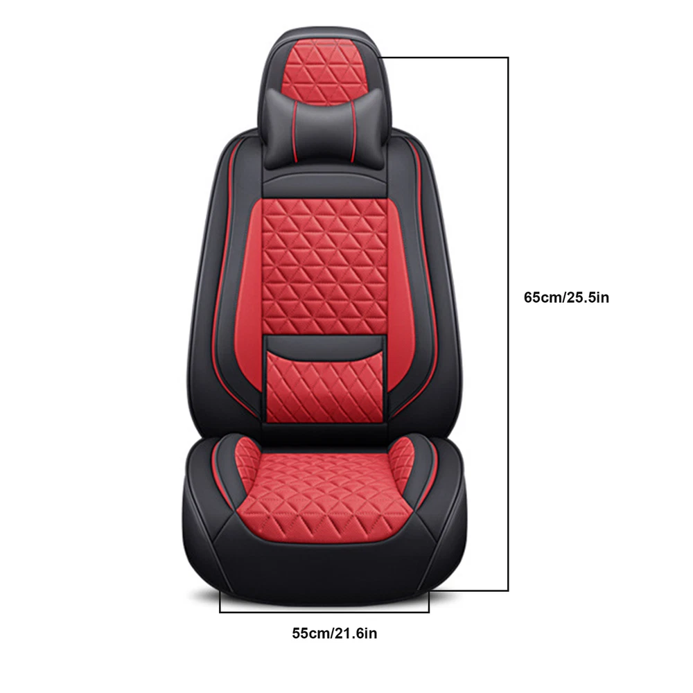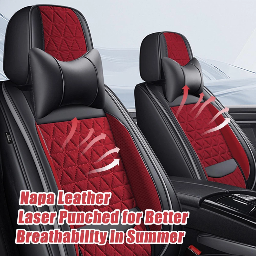 Bullet Points: Unmatched Experience: With excellent abrasion resistant and a delicate touch, our car seat cover set is made of Nappa leather, offering good breathability. It promotes the class of your car while providing an unparalleled comfortable experience for driver and passenger alike Extended Service Life: With a perfect contour fit and 360 Degree Full Surround Design, our car seat cover leather full set prevents edge-wearing and provides a stable and secure ride experience. The bilateral embracing wings also extend the service life, ensuring long-lasting protection Enhanced Waist Support: Special upgraded fixed waist dependency design, stable and not shifting, alleviates the waist pressure by long-term driving or riding, adjustable height and angle to meet the needs of different drivers and passengers, making your journey easier and pleasant Breathable Comfort: Enjoy a cool and comfortable drive with our car seat cover's optimized punching technology, designed to maintain your safety and breathability. Made from excellent leather, it provides a sleek and sturdy design with anti-slip backing Simple and Stylish: Effortlessly install our full set of leather car seat covers, available in a variety of stylish colors. Equipped with all accessories and designed for comfort, this is the ideal choice for a luxurious four-season driving experience This car seat cover leather full set is designed to cater to the needs of different drivers and passengers. Its 360 Degree Full Surround Design ensures complete protection for both the driver and passenger. The cover is made using high-quality materials and advanced punching equipment. It comes with a full set of accessories for easy installation. Specification: Product Name: car seat cover leather full set Color: black and white, black and red, black and blue, beige Material: Nappa Package method: all-inclusive Suitable models: 5-seater models such as cars and SUVs; Style: Simple and comfortable Suitable for season: four seasons Packing List: Seat covers x5 Heads cushion x5 Headrest x2 1 pack of fixed buckles (18 buckles, 8 buttons) Notes: 1. Due to different lighting and screen settings, the item color may be slightly different from the picture. 2. Due to different manual measurements, please allow a 1-2cm difference in size.