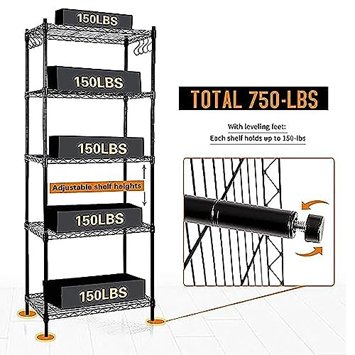 5-Shelf Heavy Duty Wire Shelving Rack with Hooks for Garage Storage