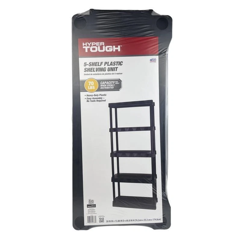 You may also like Garage Storage Wire Shelf Heavy Duty Organizer 55lb Capacity Compatible Rails US 32.83 USD Free shipping 5-Tier Heavy Duty Shelving Unit Metal Storage Adjustable Wire Rack Home Office 63.81 USD Free shipping Heavy Duty Plastic Storage Shelves 200lb Capacity Freestanding Organizer New 58.73 USD 61.82 USD Free shipping 5% off 3-Tier Chrome Wire Shelving Unit Adjustable Steel Storage Solution Organization 63.98 USD Free shipping Rolling Garage Workstation 3-Shelf Steel Unit W/ Power Outlet Storage Grid New 387.26 USD Free shipping Durable 3 Shelf Plastic Storage Unit Easy Assembly Freestanding Garage Organizer 22.35 USD 23.53 USD Free shipping 5% off Heavy Duty 5 Tier Garage Shelving Adjustable Metal Storage Unit Utility Rack New 79.98 USD Free shipping 4-Tier Heavy Duty Plastic Storage Shelving Unit Garage Utility Room organizar US 35.31 USD 37.17 USD Free shipping 5% off Heavy Duty Garage Shelving Unit Adjustable Storage Rack Easy Assembly 5 Shelves 128.16 USD 134.91 USD Free shipping 5% off 4 Tier Plastic Garage Shelf Storage Unit Heavy Duty Shelving Tool Free Assembly 95.98 USD Free shipping 3 Tier Heavy Duty Storage Shelf Adjustable Sturdy Steel Garage Kitchen Office US 45.59 USD 47.99 USD Free shipping 5% off Durable 4 Tier Plastic Garage Shelves Tool Free Assembly Heavy Duty Storage Unit 55.49 USD Free shipping This Black Plastic Hyper Tough 5-Shelf Shelving Unit is perfect for your storage needs. Made of a durable polypropylene material, this storage unit is perfect in the garage. Store up to 350 pounds of material. Also do not worry about tools, as this is easily assembled with no tools required. This shelving unit is built for years of e and will beat all the competition. Garage storage shelf Made of durable Polypropylene material Perfect for garden tools, garage items, or miscellaneous items 350 lbs. capacity when evenly distributed Easy assembly - no tools required QR code assembly tutorial on packaging 13. 88" (D) x 30" (W) x 56. 2" (H), Black Weight of product: 14. 2 lbs. assembled You may also like Liquid Laundry Detergent Lavender Sweet Vanilla 63 Loads HE Essential Oils New 9.83 USD Free shipping Laundry Detergent Pods Original Scent 16 Count Stain Remover Cold Water Safe New 8.08 USD 8.5 USD Free shipping 5% off Eco-Friendly Laundry Detergent Powder 176.36 Oz Stain Remover All Skin Types New 16.97 USD Free shipping 3-Tier Multipurpose Shelf Display Rack Teak Oil Wood Sturdy Storage Organizer US 73.49 USD Free shipping Liquid Laundry Detergent Free Sensitive 89 Loads Unscented HE Standard Clean New 17.75 USD Free shipping 5-Tier Multipurpose Shelf Display Rack No Tools Assembly Adjustable Storage Unit 59.57 USD Free shipping OxiClean Odor Blasters Liquid Laundry Detergent Fresh Burst 160 Loads 208 fl oz 25.72 USD 27.07 USD Free shipping 5% off 4-Tier Wire Shelving Unit Adjustable Industrial Storage Bathroom Bedroom Pantry 61.41 USD Free shipping Natural Elements Laundry Detergent Linen Lilies Hypoallergenic 192 Loads 250oz 25.45 USD Free shipping Vinegar Laundry Detergent Citrus Scent Stain Remover Eco-Friendly 35 Loads New 22.05 USD Free shipping Moonlight Breeze Liquid Laundry Detergent 61 Loads HE Odor Eliminating Freshness 16.9 USD Free shipping Multipurpose 3-Tier Printer Stand Storage Shelf Ideal Home Office Organization 55.66 USD Free shipping