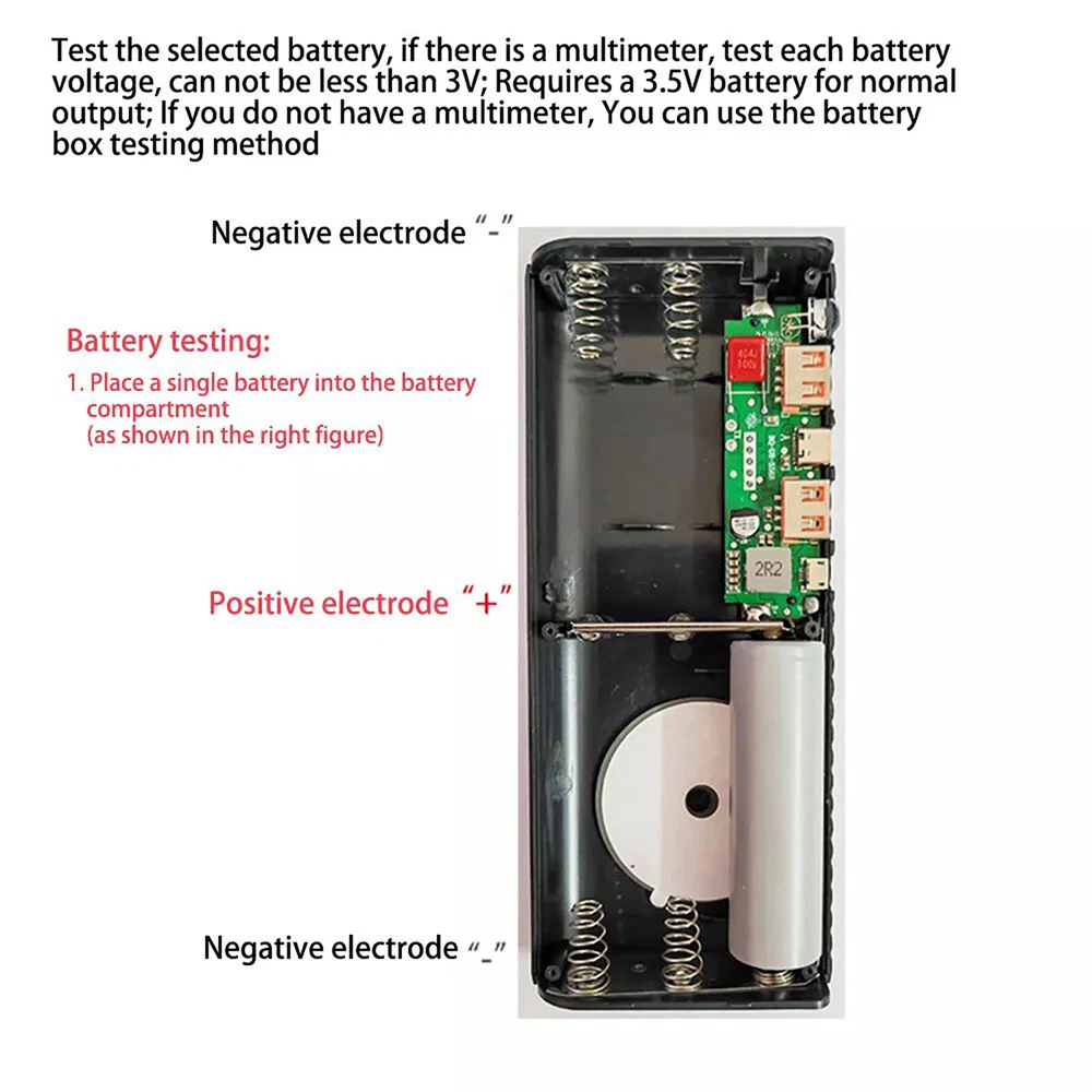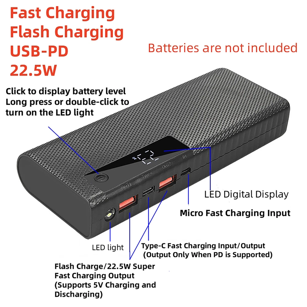NEW-00023 5 Slot 21700 DIY Power Bank Case Fast Charger Battery Box For Smartphone qq PRODUCT DESCRIPTION Features: Holds 5 pieces of 21700 flat head batteries, a solderless and reusable DIY battery case. (Batteries not included) Features power display, intelligent automatic shutdown in non-working state, LED light activated by long press or double click; Reverse installation does not damage the motherboard. Easy to install, requiring no soldering or secondary processing. Simply install the batteries correctly and assemble for use. It is also repeatedly disassemblable and replaceable. Ideal for home/outdoor activities, easy to operate, and convenient for disassembly and installation. Only supports 21700 flat-headed batteries. Do not use pointed batteries or aging batteries. Improper use of batteries may result in inability to output, especially after prolonged use in other locations and disassembly. (Please note that for DIY products, a certain level of understanding is required. Otherwise, improper operation may lead to issues such as motherboard burnout.) Attention: Does not support 3.2V iron phosphate batteries. Do not use damaged batteries, do not install batteries that do not meet the requirements, and do not modify/weld the product. This product poses a high safety risk during production, please be cautious! Specifications: Compatible battery: 3.7V 21700 battery (flat head - standard with a diameter of 2.1cm and a length of 7cm) (Not included in shipment) Output Power: 22.5W (Dual USB Output + TYPE-C Port/for Android Port Dual Input Solution); USB Output: 5V/3.1A; 9V/2.5A; 12V/1.87A (Supports 5V pass-through charging, multi-port output limited to 5V); Type-C Output: 5V/3.1A; 9V/2.22A; 12V/1.67A (Output available only when PD protocol is supported); IN Input (Micro/Type-C): 5V/3A; 9V/2A; 12V/1.5A (Multi-port input not supported); Capacity Requirement: Battery pack's minimum true capacity must not be less than 10000mAh, otherwise the battery may not be able to discharge completely before running out of power. Package Included: 1 × Battery Box (Excluding Batteries) Shipping Contact Us Our products have been sent to the US warehouse. All items will be shipped via WINIT CORPORATION. In 2-5 working days, you will receive your items. Thank you and have a nice day. If you have any question about us or items, please contact us, we will reply it as soon as possible. Shipping Our products have been sent to the US warehouse. All items will be shipped via WINIT CORPORATION. In 2-5 working days, you will receive your items. Thank you and have a nice day. Contact Us If you have any question about us or items, please contact us, we will reply it as soon as possible. PaymentShippingReturn policyAbout usContact us Copyright © - Tongtool All rights reserved | Design:Tongtool