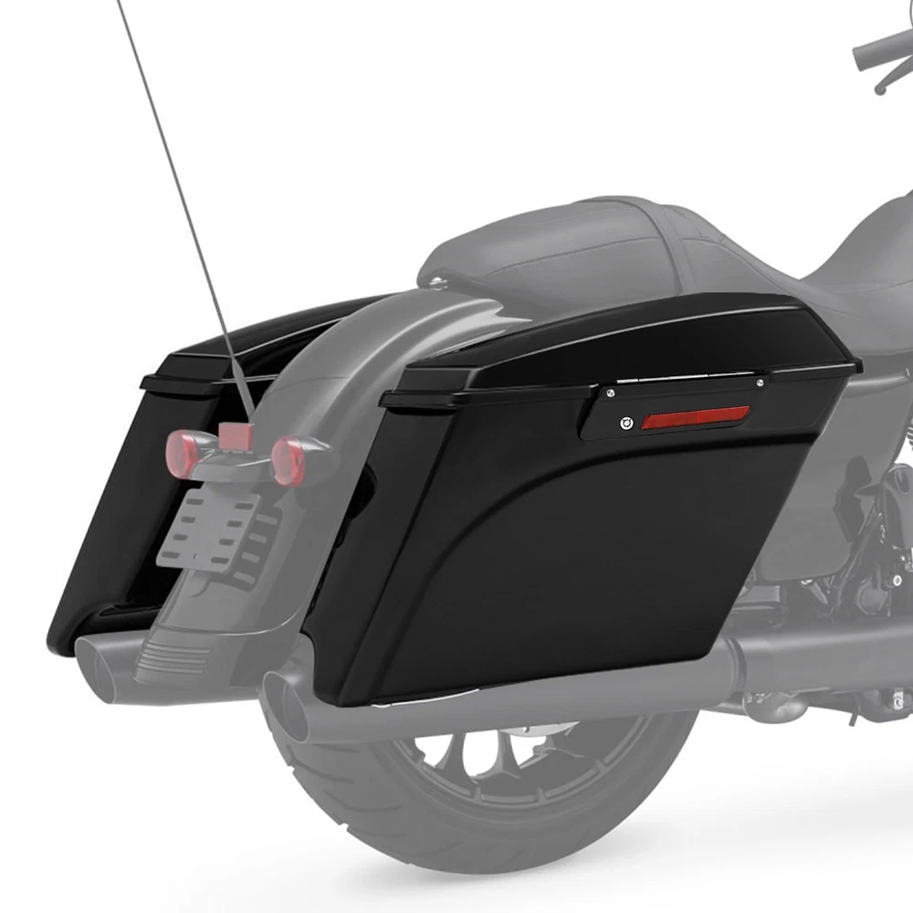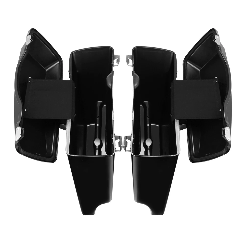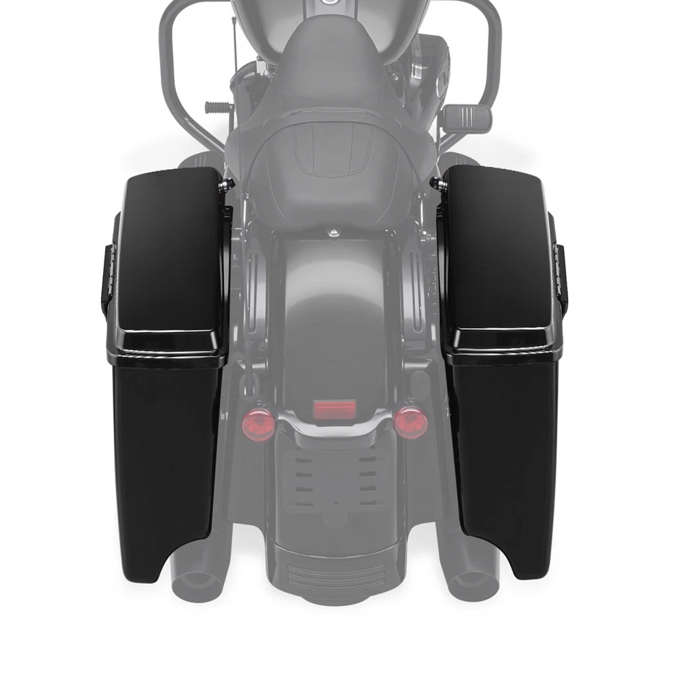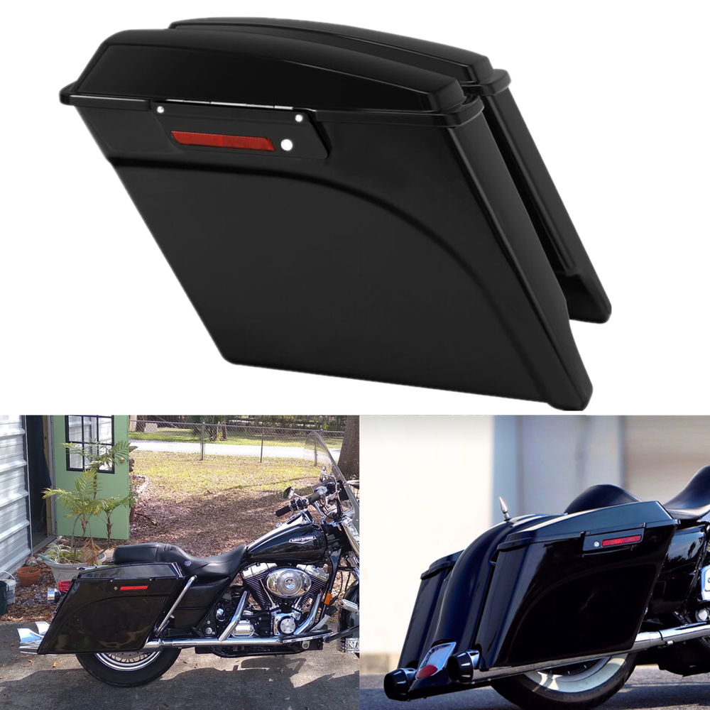 5"Stretched Hard Saddlebags Fit For Harley Touring Electra Road Glide 1993-2013 Fitment: Fit For Harley Touring Models 1993-2013. Fit on the Softail, DYNA and Sportster Models With the conversion Brackets More Information: Newly manufactured by CCI. Saddlebags are stretched 5" longer than stock to cover the muffler front to back and give that stretched look. High quality ABS. Bright black finish (painted). Size: as shown in the picture. (External size measurement) Easy to install back in place without adjustments. Pre-drilled holes for easy installation. Painted Gloss black and ready to install. No install instructions. Included Items: 1 Pair Left & Right Saddlebags (Included + 2 Keys + 2 Latches) 1.Package handling takes about 2 business days at our warehouse, so please make sure entering correct payment and shipping information before checking out. 2.All domestic orders will be shipped via USPS or Fedex from our US warehouse and usually arrives in about 2-7 business days. 3.Local pick up is not available. Buyers – Please Note •Import duties, taxes and charges are not included in the item price or shipping charges. These charges are the buyer's responsibility. Please check with your country's customs office to determine what these additional costs will be prior to bidding/buying. Return Policy •When you receive item damaged, not as describe or wrong one, please email us pictures within 72 hours to resolve any problem better and faster: 1.All labels with clear words on the package; 2.The real goods you receive; 3.Different angles of the products and package to show the problem clearly. Fitment: Fit For Harley Touring Models 1993-2013. Fit on the Softail, DYNA and Sportster Models With the conversion Brackets More Information: Newly manufactured by CCI. Saddlebags are stretched 5" longer than stock to cover the muffler front to back and give that stretched look. High quality ABS. Bright black finish (painted). Size: as shown in the picture. (External size measurement) Easy to install back in place without adjustments. Pre-drilled holes for easy installation. Painted Gloss black and ready to install. No install instructions. Included Items: 1 Pair Left & Right Saddlebags (Included + 2 Keys + 2 Latches) SHIPPING 1.Package handling takes about 2 business days at our warehouse, so please make sure entering correct payment and shipping information before checking out. 2.All domestic orders will be shipped via USPS or Fedex from our US warehouse and usually arrives in about 2-7 business days. 3.Local pick up is not available. Terms of Sale Buyers – Please Note •Import duties, taxes and charges are not included in the item price or shipping charges. These charges are the buyer's responsibility. Please check with your country's customs office to determine what these additional costs will be prior to bidding/buying. Return Policy •When you receive item damaged, not as describe or wrong one, please email us pictures within 72 hours to resolve any problem better and faster: 1.All labels with clear words on the package; 2.The real goods you receive; 3.Different angles of the products and package to show the problem clearly.