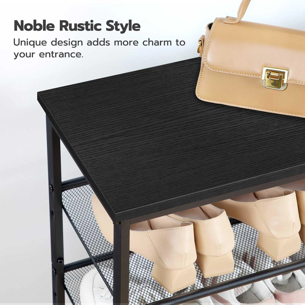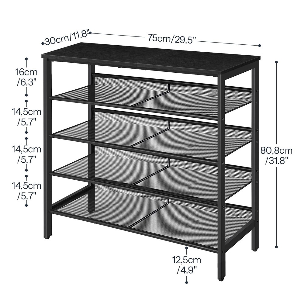 Organized Shoe Storage: Bid farewell to the embarrassment of scattered shoes! This 5-tier shoe rack restores order to your home with each shelf holding 4-5 pairs of shoes, ensuring a tidy display of your footwear and banishing chaos from corners Collision of Black : Matte black frame is smooth and exquisite while the black finish is noble and delicate, making this shoe organizer a perfect match to your home decorations and a charming spot for your family and friends Flexible Tilting and Leveling: Besides a spacious top, this shoe rack has metal mesh shelves to be tilted or leveled as per your preference, catering to diverse storage needs. How to heels or tall boots? Removable design helps you Solid, Stable, Safe: This shoe rack is constructed of premium particleboard and metal mesh shelves. The top loads up to 44 lb and each mesh bears up to 22 lb, so you can enjoy safe use of this shoe rack. Of course you can expect long serviceability because the frame is hard to bent and age No Hassle Assembly: We pay special attention to the customer’s product experience, including assembly experience. So we specially improved the assemble method and procedures of the product