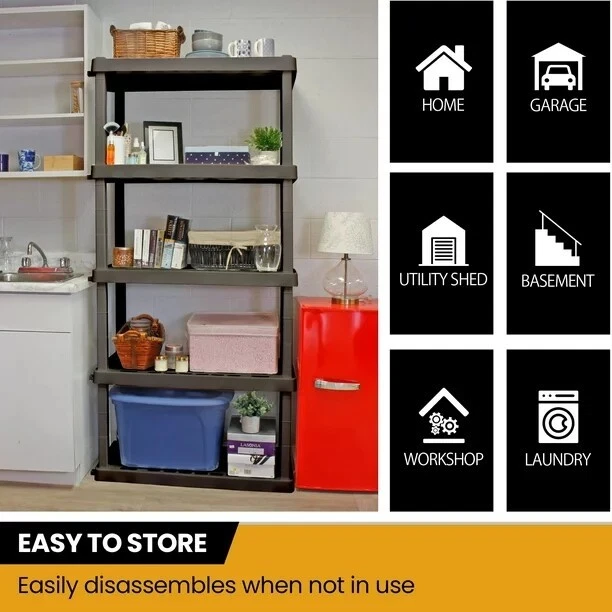 You may also like Stainless Steel Percolator Coffee Pot 9 Cup Camping Brew Outdoor Kitchen Classic 52.02 USD 54.76 USD Free shipping 5% off 17 In Curved Shaft Gas String Trimmer Quick Cutting Coverage Easy Load Comfort 110.56 USD 116.38 USD Free shipping 5% off Modern 2-Door Wooden Entryway Shoe Storage Cabinet Organizer Shelves Dark Brown 79.54 USD 83.73 USD Free shipping 5% off Canton End & Side Table W/2 Built-In USB Ports Storage Drawer Adjustable Shelf 69.95 USD 73.63 USD Free shipping 5% off Oval Hand Woven Willow Laundry Basket W/ Handles Washable Liner Sturdy Design 65.73 USD 69.19 USD Free shipping 5% off 10x10 Ft Pop-Up Tent Zippered Mesh Sidewalls Quick Installation Outdoor Privacy 53.44 USD 56.25 USD Free shipping 5% off Mini Fridge Organizer Adjustable Shelving Rolling Caster Storage Solution New 109.36 USD 115.12 USD Free shipping 5% off Olympic Plate Rack Organizer W/ Wheels Heavy Duty Alloy Steel Home Gym Storage 83.92 USD 88.34 USD Free shipping 5% off Drip Irrigation Tube 100 Ft Roll Black 3/4 in Mainline Tubing LDPE UV-resistant 76.86 USD 80.91 USD Free shipping 5% off Extra Large Capacity Galvanized Steel Post Mount Mailbox W/ Outgoing Flag New 61.49 USD 64.73 USD Free shipping 5% off AC Furnace Air Filter 16x25x4 MPR 1000 MERV 11 Allergen Defense 4-Pack New 137.08 USD 144.29 USD Free shipping 5% off 10x20 Ft Outdoor Waterproof Canopy Tent Removable Sidewalls Heavy Duty Event New 132.87 USD 139.86 USD Free shipping 5% off Product details Maximize your storage space with this versatile 5 tier shelving unit, proudly manufactured in North America. Adding shelving is one of the simplest ways to organize even the most limited spaces, protect your items from damp floors, and more. This lightweight unit snaps together with no tools required so you can get started on your home organization project right away. Heavy-duty molded plastic resin shelves hold 150 lbs (68 kg) each and will not rust, dent, stain, or peel. Ventilation holes allow air to flow and control moisture, keeping your items clean and dry. Nested legs and anchor holes offer added support, and the interlocking design lets you easily and securely link together multiple units. Whether you are decluttering your basement, organizing your craft room, or spring cleaning your garage, Hyper Tough has the perfect shelving solution for you. Caractéristiques du produit 16” (40.6 cm) tall shelves hold 150 lbs (68 kg) each The durable molded plastic resin will not rust, dent, stain or pee Interlocking design lets you easily and securely link together multiple units Simple snap-fit assembly with nested legs for maximum support Lightweight unit can be moved by one person Ventilation holes allow air to flow freely around your items 400 lb (180 kg) total capacity Built-in anchor holes offer added security Protect your items from damp floors Maximize your storage space Dimensions: 74” (188 cm) H x 36” (91.4 cm) W x 18” (45.7 cm) D You may also like 3 Tier Metal Folding Shelves Set 2 Home Office Storage Organization Adjustable 150.13 USD Free shipping Ceramic Rectangular Vessel Sink Above Counter Modern Bathroom Vanity Basin New 111.9 USD 117.79 USD Free shipping 5% off Plastic Stacking Storage Organizer 4-Pack W/ Sliding Drawer Clothes Bedroom New 48.94 USD 51.52 USD Free shipping 5% off 1/2HP Garbage Disposal Easy Install Reliable Food Waste Disposer Kitchen Black 172.04 USD 181.09 USD Free shipping 5% off 20V Cordless Drill Kit W/ 100 Pc Accessories Compact Soft Grip Clutch System New 97.2 USD 110.42 USD Free shipping 12% off Programmable Slow Cooker 7 Quart Easy Cleanup 15 Cooking Options Family Meals US 100.65 USD 105.95 USD Free shipping 5% off Durable Planter Square Pot W/ Drainage Modern Design Indoor Outdoor 2 Pack New 202.82 USD 213.5 USD Free shipping 5% off Floor Lamp 3 Shelf Storage Organizer Linen Shade Home Office Living Room Decor 53.13 USD 72.45 USD Free shipping 27% off Cloud Shaped Upholstered Desk Chair Adjustable Rolling Wheels Home Office White 104.68 USD 147.24 USD Free shipping 29% off Buffet Server Food Warmer Adjustable Heat Chafing Dish Set 2.5Qt Stainless Steel 75.76 USD 89.81 USD Free shipping 16% off Commercial Chrome Wire Shelving 18x60 In Heavy Duty Storage 2 Shelves Kitchen 125.92 USD 132.55 USD Free shipping 5% off 600LED Battery Operated Curtain Lights Waterproof Bedroom Outdoor Backdrop 20 Ft 51.46 USD 67.71 USD Free shipping 24% off