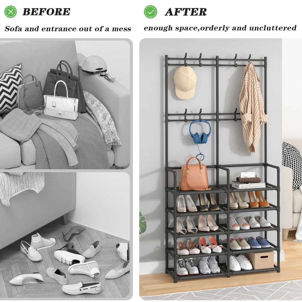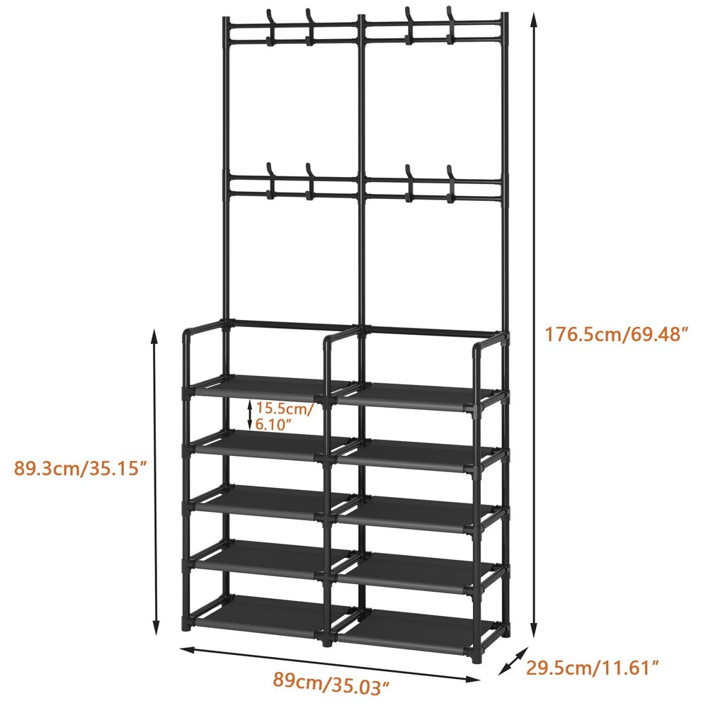 Laiensia Double Row Coat Rack is an excellent choice for your entryway. It's made from metal rod, high quality plastic and non-woven fabric, which means it's sturdy. Provides ample storage space for your home to become organized. Advantages: 1.Everything from the smallest details to the overall design has been carefully researched to ensure the practicality and functionality of this hall tree. 2.Make the most of your vertical space, even apartments can be easily placed. 3.The multi-tier shoe rack provides ample space for your shoes and 8 hooks to store some of your essential items such as keys, umbrellas and scarves when you go out. You can find them quickly without delaying your precious time. 4.It is suitable for your entrance, office, hallway, vestibule, garage. SPECIFICATIONS 1.Color:Black 2.Material: Metal rod, plastic connector and non-woven shelf 3.Dimension(L*W*H): 35.03inch*11.61inch*69.48inch(89cm*29.5cm*176.5cm) 4.Item Weight: 5.86lb 5.Hook: 8 piece 6.Shoe rack: up to 20 pairs of shoes Note: 1.The parts need to be checked for completeness before installation. 2.Press the rod firmly on the connector when installing, it will help to improve the stability of the product. 3.Please take care of children to prevent the coat rack tipping during use. [2-in-1 Design]-Perfect combination of coat rack and shoe rack. It helped clear up your entry way of shoes and gave you a place to hang your stuff. Suitable for your entryway, hallway, mudroom, living room or office. [Space Saving] -35.03”L x 11.61"W x 69.48"H.The hall tree takes up little space in the room but has plenty of storage space.keeping your space tidy and organized. [Multi-function]-8 hooks at the top for storing backpack, umbrellas, keys, scarf, etc. The bottom 10 shelves are used to store your shoes, up to 20 pairs of shoes. [Great Value]-The double-row structure means it is more stable, and the excellent craftsmanship guarantees its durability. There are clear instructions in the package, and it can be easily installed without additional tools. [Use Tip & Services]-The parts need to be checked for completeness before installation. If you have any issues, please feel free to contact us and we will provide your a solution ASAP.