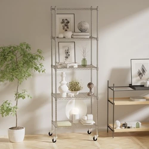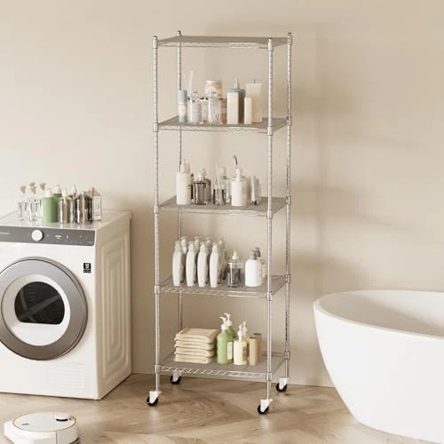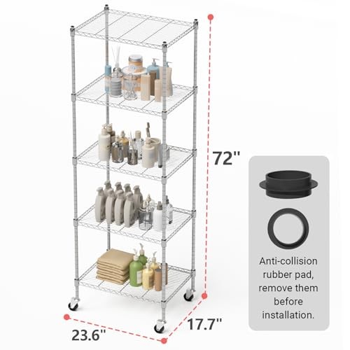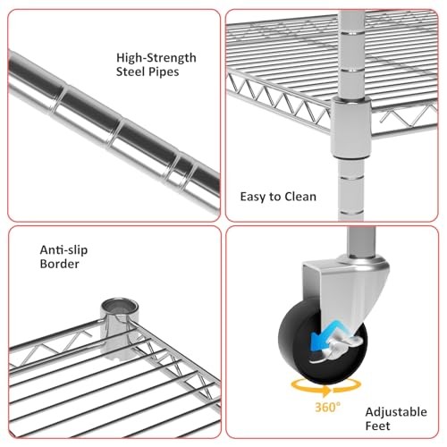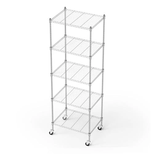 Return Policy Fast Delivery Trusted seller Garage Shelving with Wheels, 5 Tier Shelving Unit and Adjustable Feet, 865 lb High Capacity Rolling Storage Shelf for Kitchen, Office, Dining Room, Garage(23.6"x 17.7"x 72"), Chrome Product Description 【Strong and Durable】The 5-layer wire shelving is made of high-quality steel, with a highly polished surface paint, excellent rust and corrosion resistance, high load strength, each layer can carry 173 pounds, and the total load weight can reach 865LB. The mesh wire design makes the storage rack more robust and is ideal for small objects. The height of each layer of the shelf unit can be adjusted arbitrarily, you can determine the height of each layer of shelves according to your goods. 【Adjustable Feet and Convenient Wheels】The wire shelving with wheels comes with 4 sturdy 360 degree rollers, two of which can be locked, so you can push the storage shelves with wheels to w you need it, anytime, anyw, and keep it in place. The adjustable leveling feet can keep the metal shelves in a fixed position, so that the device can maintain balance and stability, and solve the problem of uneven ground. 【Widely Used】The shelves with wheels has extra space for tools, boxes, books, clothes, bags, small appliances, kitchen supplies, and anything else you want to keep organized and convenient. Mesh garage shelving are suitable for a variety of places, such as: kitchen, bathroom, balcony, pantry, garage, living room, warehouse, office, supermarket and other places.The 5 tier shelving unit can make cluttered things neat and orderly. 【Easy Assembly】The wire shelves with wheels is easy to assemble, does not require any tools, and the height of each layer can be adjusted according to needs, just clamp the metal grid plate on the column, and then slide the metal grid plate along the column until the metal shelf is firmly fixed on the buckle. The shelving with wheels also comes with a user manual to guide you through the quick and easy assembly process. 【Product Size】The rack with wheels size is 23.6"x 17.7"x 72"(L x W x H). Its compact size allows for efficient use of vertical space, providing ample storage space without taking up too much floor space. If you have any questions about the product, please feel free to find us and we will assist you. Shipping Returns Payment Shipping Shipping is FREE to all addresses other than APO/PO boxes in the lower 48 states. All our stock ships from US-based warehouses. Shipped via USPS or UPS (depending on location and package weight) Unless stated otherwise, all orders will ship within 24-72 hours of your payment being processed. Check our feedback to see the great reviews of FAST shipping we offer. Returns Seller does not accept returns Payment We currently accept payment via eBay managed payments only. Once payment is cleared, we will dispatch your shipment within 1-3 business days. Please refer to the "Shipping" tab for more information regarding shipping speed to your destination.