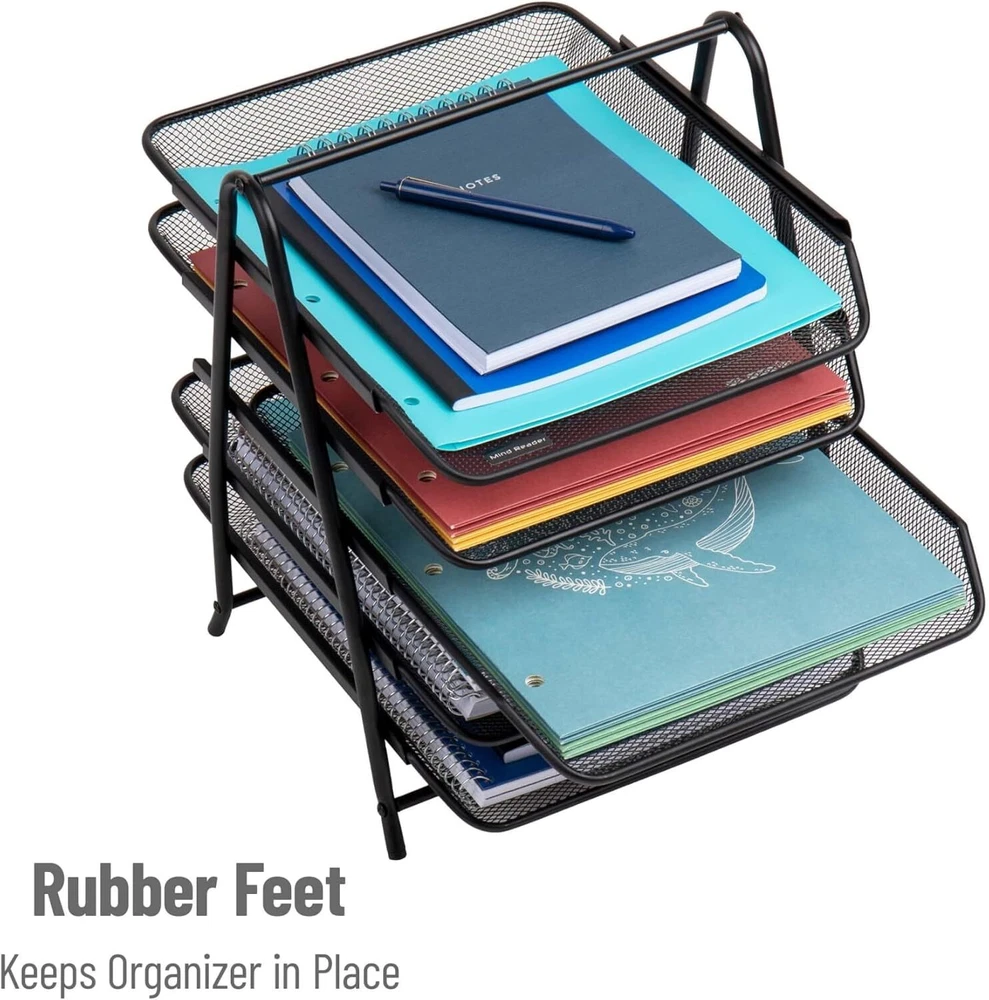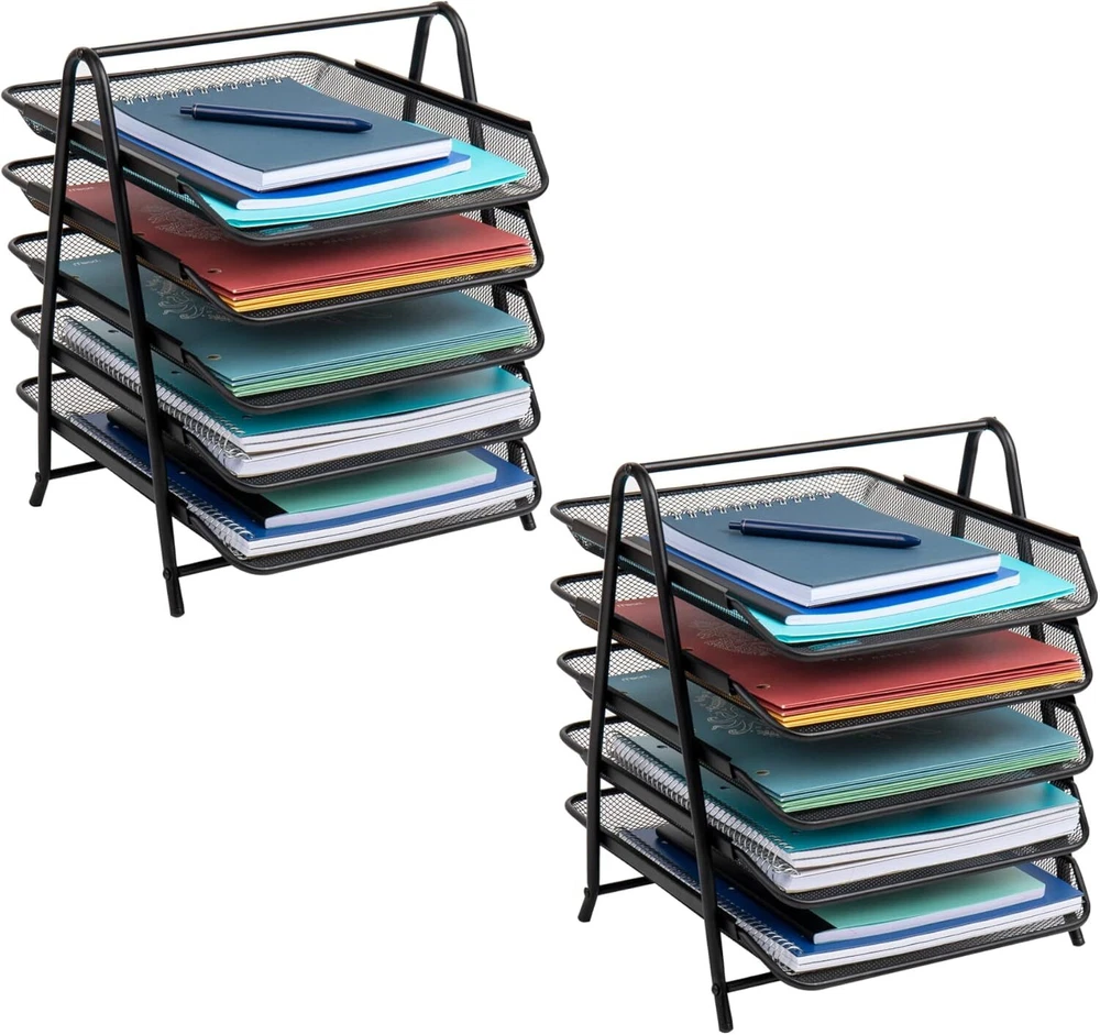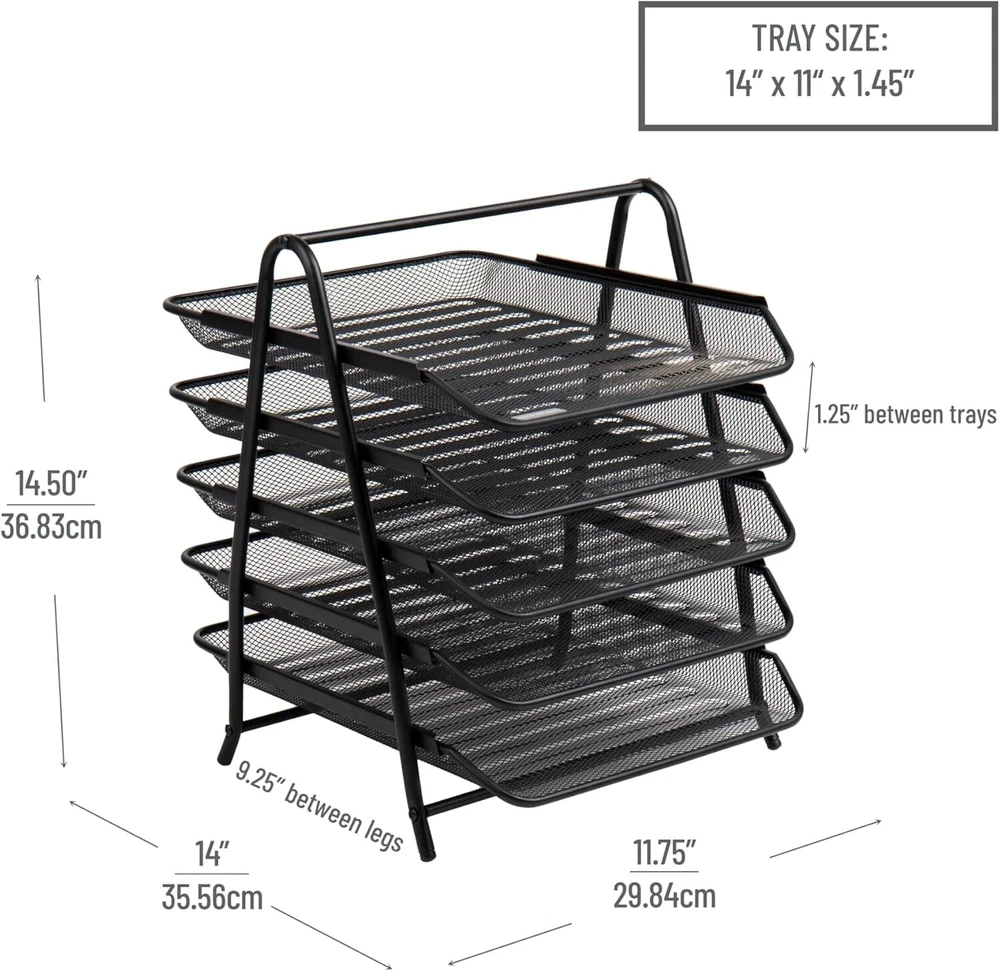 From the manufacturer 3TPAPER-BLK 4TPAPER-BLK 5TFOLDERS-BLK 5TPAPER-BLK 6TPAPER-BLK 7TPAPER-BLK Customer Reviews 4.4 out of 5 stars 492 4.3 out of 5 stars 508 4.7 out of 5 stars 4 4.5 out of 5 stars 1,647 5.0 out of 5 stars 3 5.0 out of 5 stars 9 Price $13.29 $ 13 . 29 $16.99 $ 16 . 99 $39.99 $ 39 . 99 $17.99 $ 17 . 99 $32.99 $ 32 . 99 $33.99 $ 33 . 99 Material Metal Mesh Metal Mesh Metal Mesh Metal Mesh Metal Mesh Metal Mesh Dimensions 11.5"L x 13.75"W x 10"H 12"L x 13.75"W x 12.5"H 11.75"L x 14"W x 14.5"H 11.75"L x 14"W x 14.5"H 11.75"L x 13.75"W x 18"H 11.75"L x 13.75"W x 20"H Colors Available Black, Silver Black, Silver Black Black, Blue, Pink, Silver, Turquoise, White Black Black 3THANG-BLK 4THANG-BLK MAGROUND-BLK MAGSHELF-BLK MAGSTACK-BLK WAIFIST3-BLK Add to Cart Add to Cart Add to Cart Add to Cart Add to Cart Add to Cart Customer Reviews 4.8 out of 5 stars 8 4.7 out of 5 stars 8 4.6 out of 5 stars 9 4.5 out of 5 stars 194 4.5 out of 5 stars 194 4.6 out of 5 stars 216 Price $27.15 $ 27 . 15 $24.99 $ 24 . 99 $33.29 $ 33 . 29 $49.99 $ 49 . 99 $18.84 $ 18 . 84 $19.99 $ 19 . 99 Material Metal Mesh Metal Mesh Metal Mesh Metal Mesh Metal Mesh Metal Mesh Measurements 11.5"L x 14.25W x 9.75"H 11.5"L x 14.25W x 11.5"H 12.5"L x 4W x 16.5"H 22.5"L x 4W x 16"H 12.75"L x 4"W x 16"H 12.5"L x 3.75"W x 11.5"H Colors Available Black Black Black Black Black, Pink, Silver, Turquoise, White Black Multi-Tier Sliding Paper Trays Ample storage capacity The multi-tiered design of this desk organizer provides five spacious trays, allowing you to efficiently store and organize a variety of items such as files, mail, documents, folders, bills, and letters. It helps declutter your desk or counter and keeps everything within easy reach. Secure and stable The attached rubber feet ensure that the organizer stays in place while you slide each tray in and out. You can access your items with confidence, knowing that the organizer won't slip or move around on your desk. The rubber feet also help protect your desk surface from scratches. Portable convenience With a convenient carrying handle, this organizer is easily portable. You can take it with you wherever you work, whether it's in a college dorm, office, home, school, conference room, business, hotel, or any other setting. It offers flexibility and adaptability to meet your organizational needs. Dimensions Measuring 11.75 inches long x 14 inches wide x 14.5 inches tall (29.845 x 35.56 x 36.83 centimeters), this desk organizer can accommodate standard-sized documents and provides ample storage space while remaining compact. Simple Solutions with a Big Impact With home & office accessories, you can discover simple, intuitive solutions that can make your space smarter and more efficient. We are your expert resource when it comes to organization and helping people find products they didn’t know they needed. Whether you are looking to set up a new office space or for ideas to help you master your storage challenges at home, look to for your home & office solutions! Space-Saver Supreme: The Ultimate Paper Tray Organizer Ideal for compact spaces like work-from-home setups, cubicles, or college dorm rooms, this organizer helps you sort and store papers, files, and even kitchen supplies or makeup tools. Maximize your workspace with our paper tray organizer. It's a perfect solution for keeping school papers, schedules, sandwich bags, monthly bills, and paychecks organized. This organizer features an attractive, durable metal mesh design housed in a sturdy frame, providing a long-lasting solution to your organizational needs. With our paper tray organizer, corralling clutter has never been easier. Product Description Space-Saver Supreme: The Ultimate Paper Tray Organizer Maximize your workspace with this set of two paper tray organizers. Ideal for compact spaces like work-from-home setups, cubicles, or college dorm rooms, this organizer helps you sort and store papers, files, and even kitchen supplies or makeup tools. It's a perfect solution for keeping school papers, schedules, sandwich bags, monthly bills, and paychecks organized. Upon arrival, the organizer requires a simple assembly with just a screwdriver. By aligning the holes correctly before inserting screws, you can ensure a level, stable desk organizer that will not wobble. This organizer features an attractive, durable metal mesh design housed in a sturdy frame, providing a long-lasting solution to your organizational needs. Keeping it clean is easy – all it needs is regular dusting or a wipe down with a clean cloth. This versatile organizer also makes a great gift for friends or family members who love organizing recipes, favorite magazine articles, or crafting materials. It's also perfect for those who need a hand in tidying up their home office, desk, shelf, or cluttered dorm room. With our paper tray organizer, corralling clutter has never been easier.
