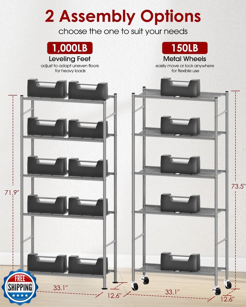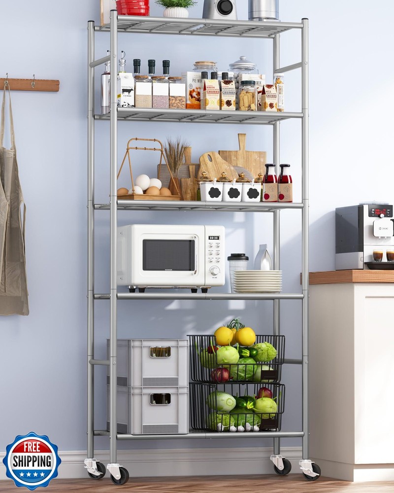Sakugi Storage Shelves Organizer - 5 Tier Metal Shelf Organizer with Metal Wheels and Adjustable Leveling Feet, Heavy Duty Garage Shelving for Kitchen, Pantry and Closet, 33.1"x12.6"x73.5", Sliver Features 2 ASSEMBLY OPTIONS: This versatile 5-tier wire shelving unit comes with both 360° rotatable metal wheels and adjustable leveling feet, offering the flexibility to choose between a mobile organization or fixed storage setup. Easily switch between stationary placement for long-term use and rolling mobility for convenient repositioning around your home, garage, or workspace. ULTRA-STABLE METAL SHELVES: The Sakugi heavy-duty shelving unit and storage solution features reinforced construction with thick metal tubes, side bars, and a wall-fixing kit for added safety. This sturdy shelf can hold up to 1,000 lbs when using leveling feet or 150 lbs when on metal wheels, making it ideal for tools, bins, kitchen appliances, or laundry supplies. PREMIUM METAL MATERIAL: Made from high-quality metal with a smooth, robust finish, this storage shelf is rustproof, moisture-resistant, and scratch-resistant, ensuring long-lasting durability against everyday use. The mesh shelves are effortless to wipe clean, making it an ideal choice for humid spaces such as kitchens, bathrooms, laundry rooms, or basements. QUICK, HASSLE-FREE INSTALLATION: Get set up in no time! With clear instructions, all hardware included, and a simple snap-connected design, this display shelf requires no extra professional tools or skills. Whether you're a DIYer or a beginner, you'll have your 5-tier rack shelf ready in minutes for immediate use. MULTIPURPOSE STORAGE ANYWHERE: Stylish and practical, this metal shelving unit blends seamlessly into any space. Use it as garage storage shelves, kitchen shelves, pantry shelves, or laundry room shelves to organize tools, pantry items, cleaning supplies, books, and more. Its compact footprint and tall 5-tier design maximize space without crowding your room. Shipping Free & Fast Shipping: We offer free shipping to most of the USA with a normal delivery time of 3-7 days. However, due to the current situation, additional delivery time (up to 3 weeks) may be required for some items. Alternative Carriers: We may use alternative carriers (e.g., USPS, FedEx, UPS) to ensure your package arrives safely and on time. Due to the use of multiple carriers, we are unable to provide a tracking number automatically. Handling Time: Orders are processed and shipped within 1-2 business days of receiving cleared payment. Shipping Restrictions: Shipping to Alaska, Hawaii, Puerto Rico, Guam, and other US territories may incur shipping charges or delivery restrictions. Please contact us before ordering, or your order can be refunded/cancelled. State Restrictions: Certain items may not be shipped to California due to state regulations. Contact for Tracking Updates: If you require tracking updates or have any concerns about the delivery of your order, please feel free to contact us, and we will be happy to assist you. Return Policy 30-Day Hassle-Free Returns: If you are not completely satisfied with your purchase, you can return the item for free within 30 days of receiving it for a full refund or exchange. Easy Return Process: Contact us, and we will provide you with a prepaid return shipping label and detailed instructions. No Restocking Fee: There are no restocking fees for returns. However, the buyer is responsible for return shipping costs if the return is not due to a seller"s error. Refund Processing: Refunds will be processed within 1 business day of receiving the returned item in its original condition. Feedback Your feedback is extremely important to us. We strive to provide the best products and customer service possible. If you are satisfied with your purchase, please take a moment to leave us a positive review. If you have any concerns or issues with your order, please contact us before leaving negative feedback. We are committed to resolving any problems and ensuring your satisfaction. Contact Us If you have any questions or concerns, please feel free to reach out to our customer support team. You can contact us through the eBay messaging system. We are available Monday to Friday, 9:00 am to 5:00 pm EST, and we will do our best to respond to your inquiry within 24 hours. Thank you for supporting our small family business!