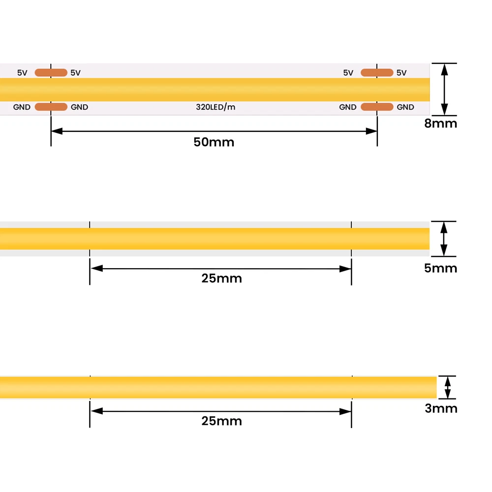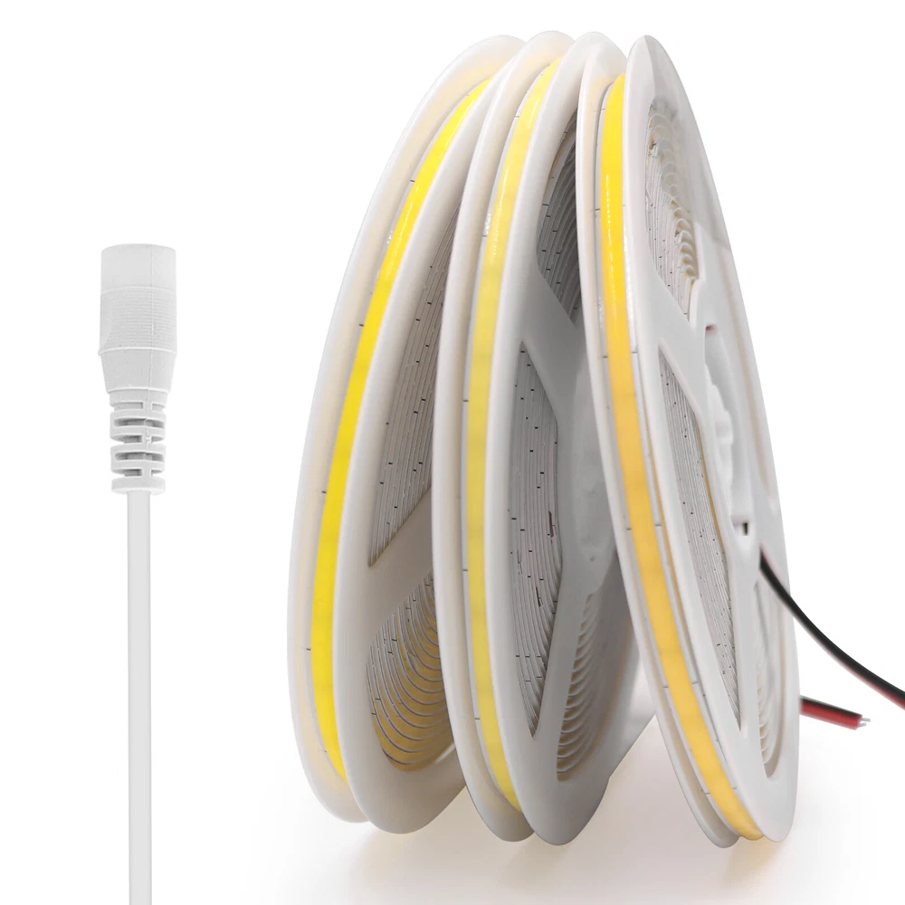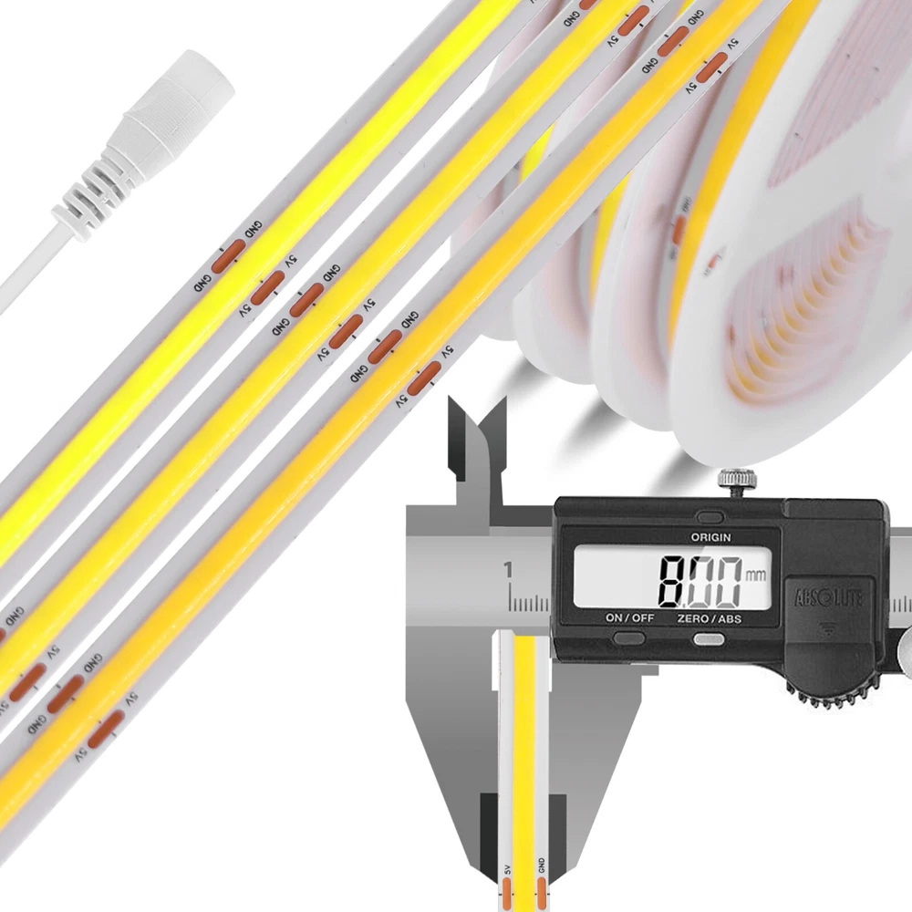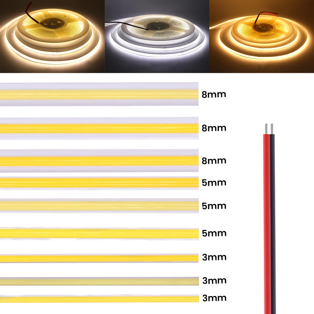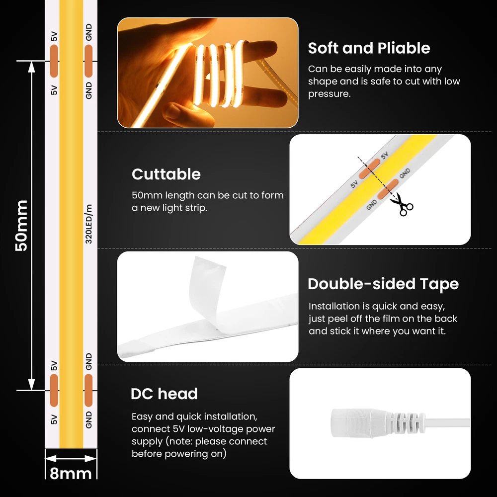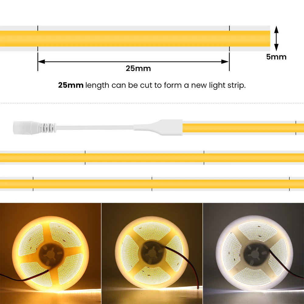 Specifications: Type: COB Led Strip Lights Input voltage: DC12V Power: 5-6W/m(5V); 8-10W/M(DC12V) FPCB Width: 3mm, 5mm, 8mm LED quantity: 320 LED/M Length: 0,5m, 1m, 2m, 3m, 4m, 5m Color temperature: Warm white (3000K), Natural white (4000K), Cold white (6000K) Cut length: 5V/12V 3mm: all 25mm 5V 5mm: all 25mm 12V 5mm: all 50mm 5V 8mm: all 25mm Waterproof quality: IP21 is not waterproof. Connection: 2-pin cable, USB-powered, DC connection USB plug cable length 15cm Operating temperature: -20℃~+45℃ Storage temperature: -20℃~+60℃ Viewing angle: 180° Propert ies: 1.Very smooth balance light, no illumination point, no dark area. 2. Super bright and soft light. 3.Much more bendable and flexible than any other SMD led strip. 4.Cuttable and jointable,can make any length you want. 5. RA>90, much friendly to eyes. Package included: 1x COB Led Strip