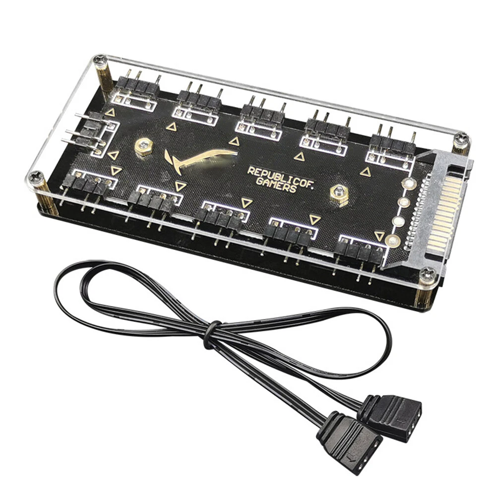 5V 3 pin ARGB RGBW Cable for ASUS AURA SYNC RGB 10 Hub Splitter SATA Power Extension Cable Adapter LED Strip Light PC RGB Fan Cooler Feature: 1. Support for ASUS, for MSI, for GIGABYTE, for ASRock motherboards (5V/3Pin D-RGB light control interface) to be controlled by the motherboard, and the lights can be synchronized with other D-RGB products. 2. Effectively manage wires. Five sets of fan jacks on the left and right for easy installation, creating a neat and tidy computer space. 3. With 52CM motherboard cable. The line length is 52cm, players no longer have to worry about short lines 4. The hub is a 5V 3PIN SATA/large 4D power port version. Specifically, it depends on the interface on the motherboard and the number of pins of the device interface you are using. You can purchase it accordingly. You cannot connect a three-pin four-pin device or a four-pin hub to a three-pin lighting device. 5. Multi-interface, easy installation. Support up to 11 ARGB interfaces, bid farewell to the trouble of insufficient interfaces. 6. Widely compatible. Standard 5V 3-pin interface, compatible with various brands of motherboards, universal standard 5V 3-pin ARGB interface, no need to worry about compatibility issues. 7. Comes with adhesive, easy to install. The paste is stable, double-sided adhesive is fixed, the installation is very convenient, and the foam pad on the back can also play the role of insulation protection. Specification: Category: RGB Fan Hub Number of fan ports: 10 Power interface: SATA interface Interface: 5V/3PIN Interface cable length: about 52cm/20.47 inch Process: gold plated Fixing type: adhesive backing Material type: 3mm acrylic sheet Product size: about 13*9*2cm/5.12*3.54*0.79 inch Product packaging: electrostatic bag Product gross weight: about 50g Note: This product is not an adapter, this is just a hub, it can only be used when the mainboard interface is not enough, the device interface without the adapter function must be the same as the mainboard with the same number of interface pins before it can be used. Due to the different monitor and light effect, the actual color of the item might be slightly different from the color showed on the pictures. Thank you! Please allow 1-2cm measuring deviation due to manual measurement.
