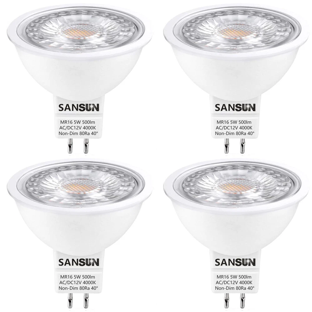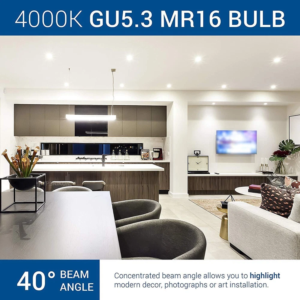 's MR16 LED bulb can be used in track light, pendant fixtures and ceiling fixtures. Personalize your home with stylish accent or ambient lighting. GU5.3 bulb series is a price-conscious product line that is designed to work beautifully and effectively in the general-purpose applications found throughout the home, office, and warehouse. By offering these products as a high quality yet cost-competitive option, we are able to provide the energy-smart LED products you need for the right price. COMMON APPLICATIONS Kitchens Living Rooms Dining Rooms Bedrooms Hallways FEATURES Replaces your current 50 Watt halogen bulb Lasts 15,000+ hours versus an halogen with a 1000-5,000 hour life hours Zero to minimal noise output in accordance with certificate regulations - maximum 16 dB. No UV, unlike fluorescent bulbs WHY LED? Reduce your electricity bill Help preserve the environment by reducing carbon footprint New technology provides increased lifespan compared to less-efficient incandescent NOTE: This is a GU5.3 which runs with 12V, therefore it cannot be plugged directly into an AC outlet. 5W MR16 LED Spotlight Bulb Equivalent 50W Halogen Bulb, Replace 20W/35W/40W/50W Traditional Halogen 12V AC/DC Low Voltage Designed for Landscape Lighting, Patio/Lawn/Path lights, Track Light, Floor Lamp, Ceiling Light Standard 12V 50W MR16 Shape with GU5.3 Bi-Pin Base Instant on at Full Brightness with 40 Degree Light Dispersment When Use Halogen Transformer, if Bulb Flickers, Pls Add 1~3 Halogen Bulbs in LED Bulbs Assembly (Due to low power consumption causes flickers) Recommended Use LED Transformer or Magnetic Transformer.